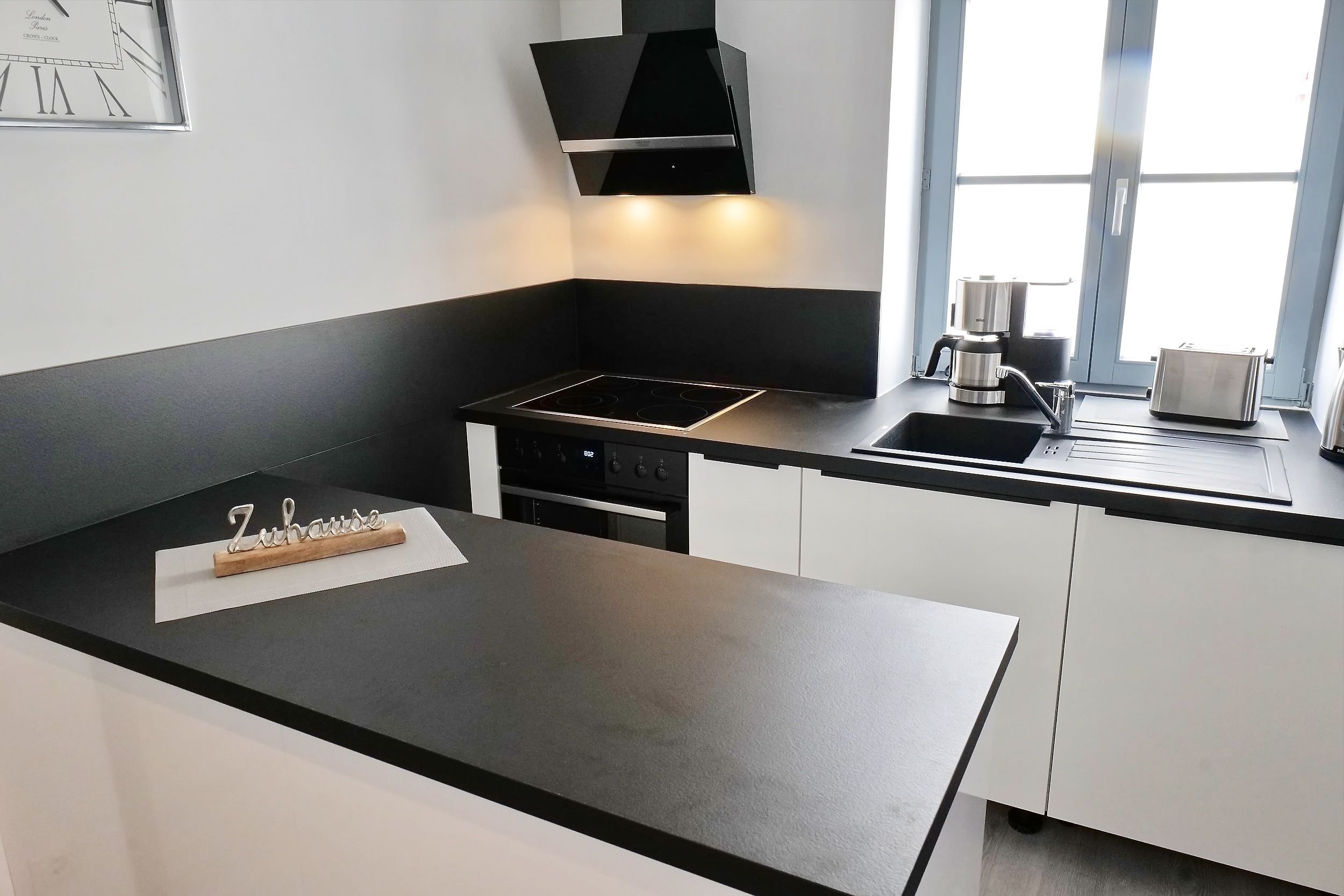 • Moderne Küche mit Backofen, Ceranherd, Wasserkocher, Kaffeemaschine, Geschirrspüler, Kühlschrank, Toaster, Geschirr, Gläser, Besteck uvm..