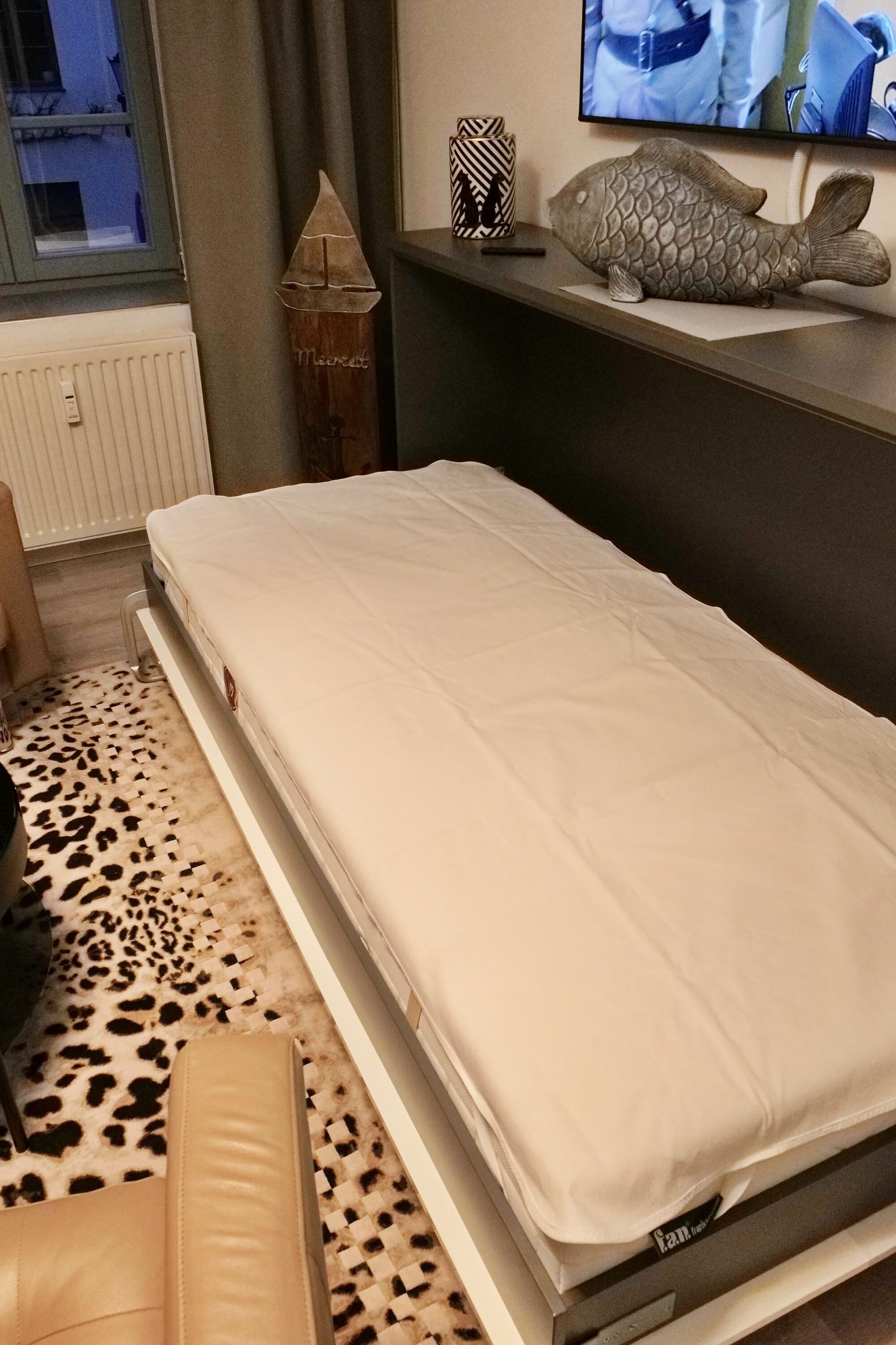 • 1 Schlafzimmer getrennt durch große Tür vom Wohnzimmer mit großem Boxspringbett (1,80 x 2,00 m), sowie ausreichend Stauraum für Ihre Kleidung. Hochwertige Biobettdecken und Kopfkissen allergikergeeignet.