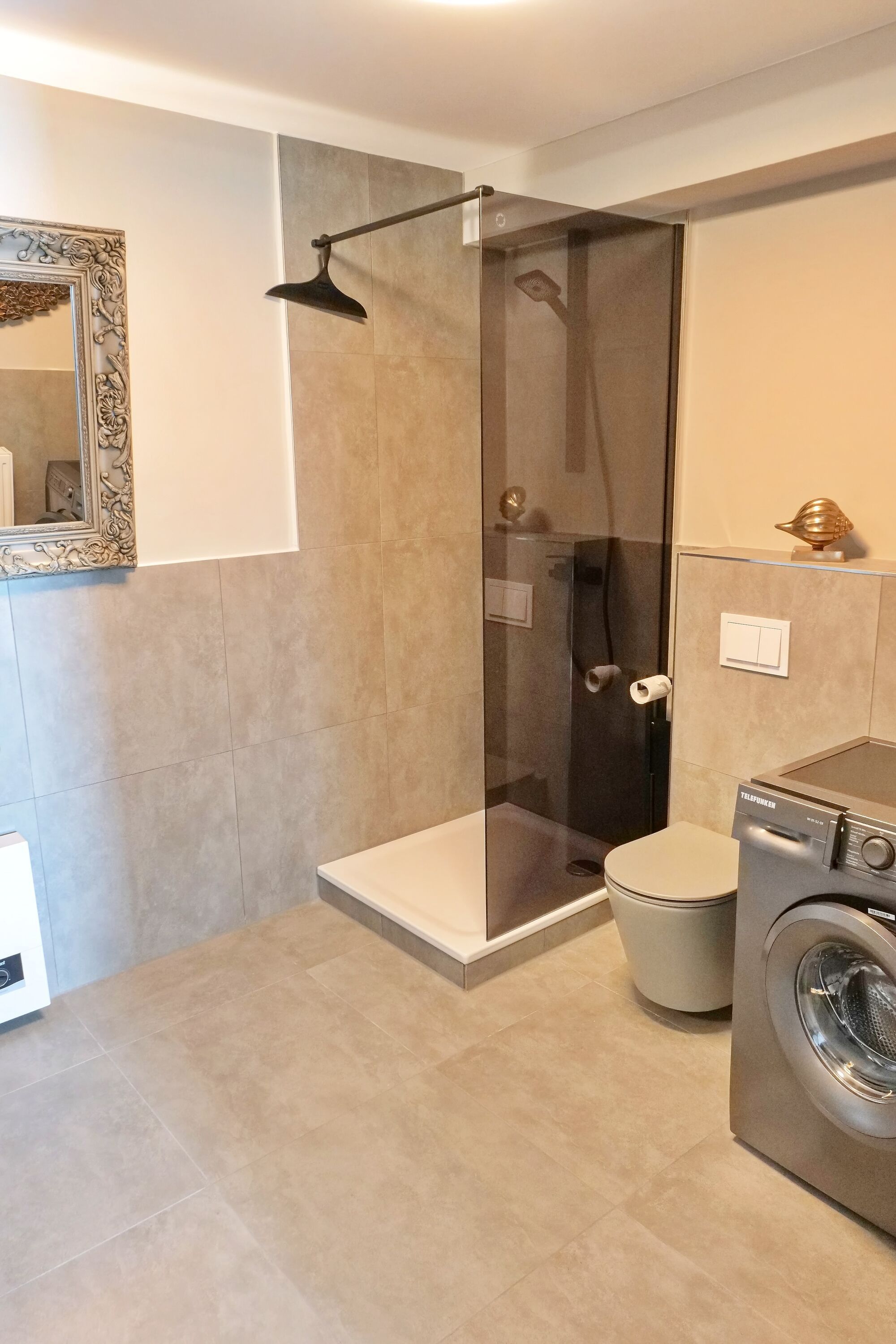 • Schickes Badezimmer mit Dusche, WC, Spiegel und ausreichend Ablagefläche für Ihre Beautyutensilien. Eine Waschmaschine und ein Wäscheständer sind vorhanden.