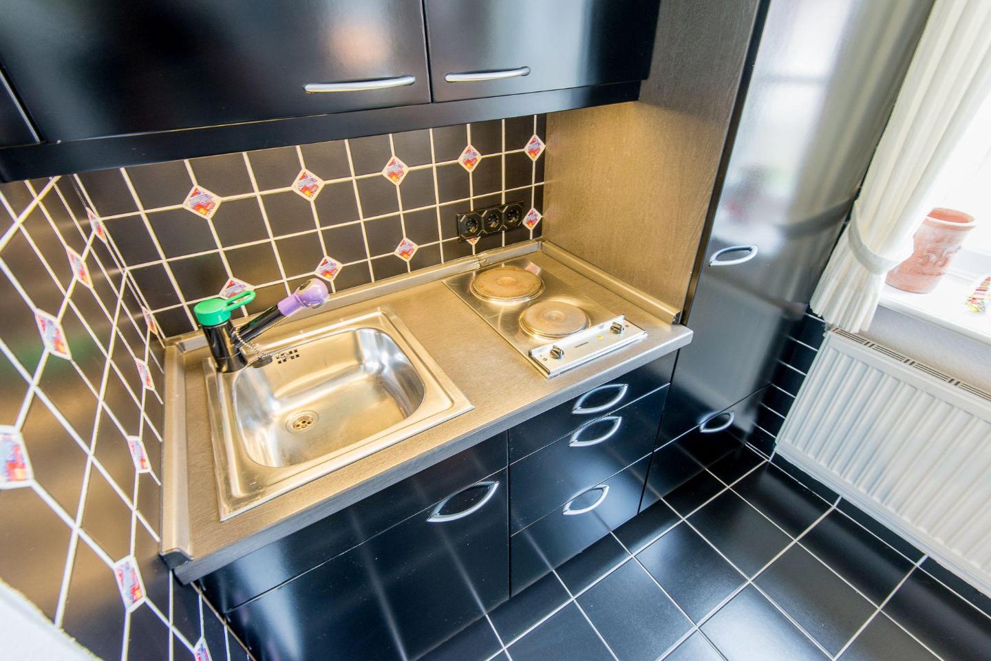 Die halboffene Küche ist funktional und stilvoll eingerichtet. Sie verfügt über einen 2-flammigen Herd und alle notwendigen Utensilien, um ein leckeres Frühstück oder kleine Mahlzeiten zuzubereiten. Der Esstisch bietet Platz für bis zu 4 Personen, perfekt für ein gemütliches Essen oder eine Tasse Tee am Nachmittag.