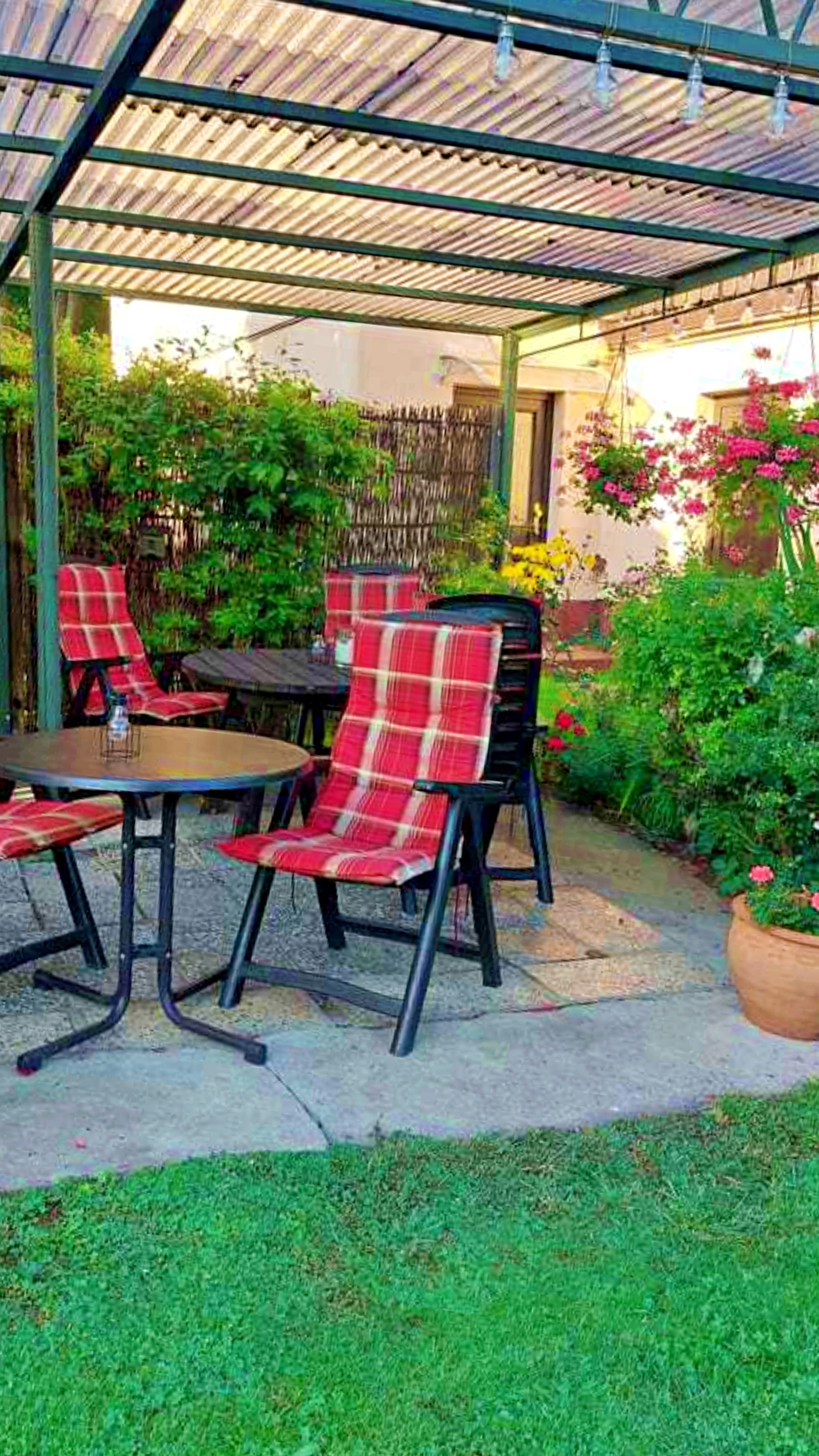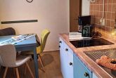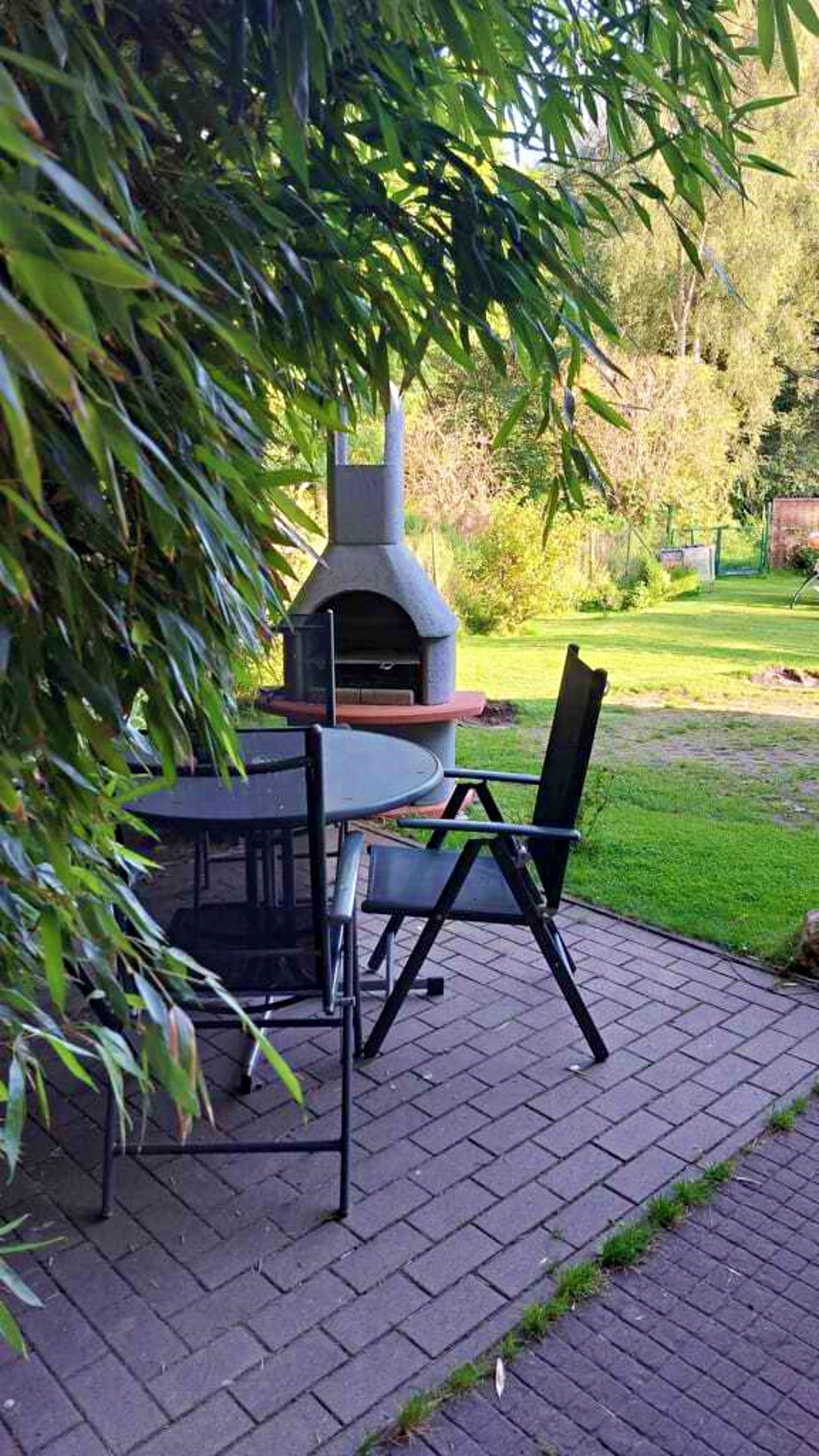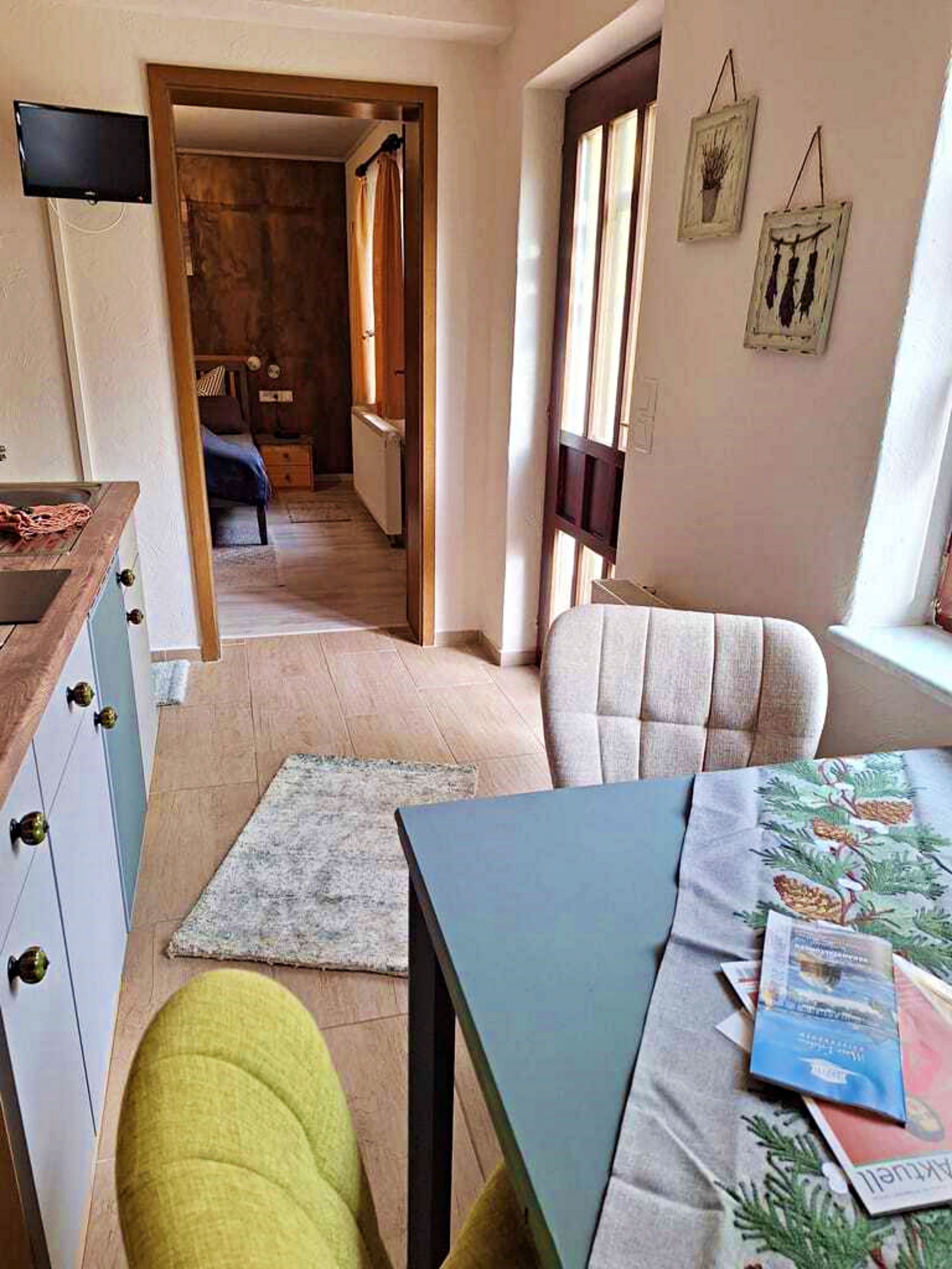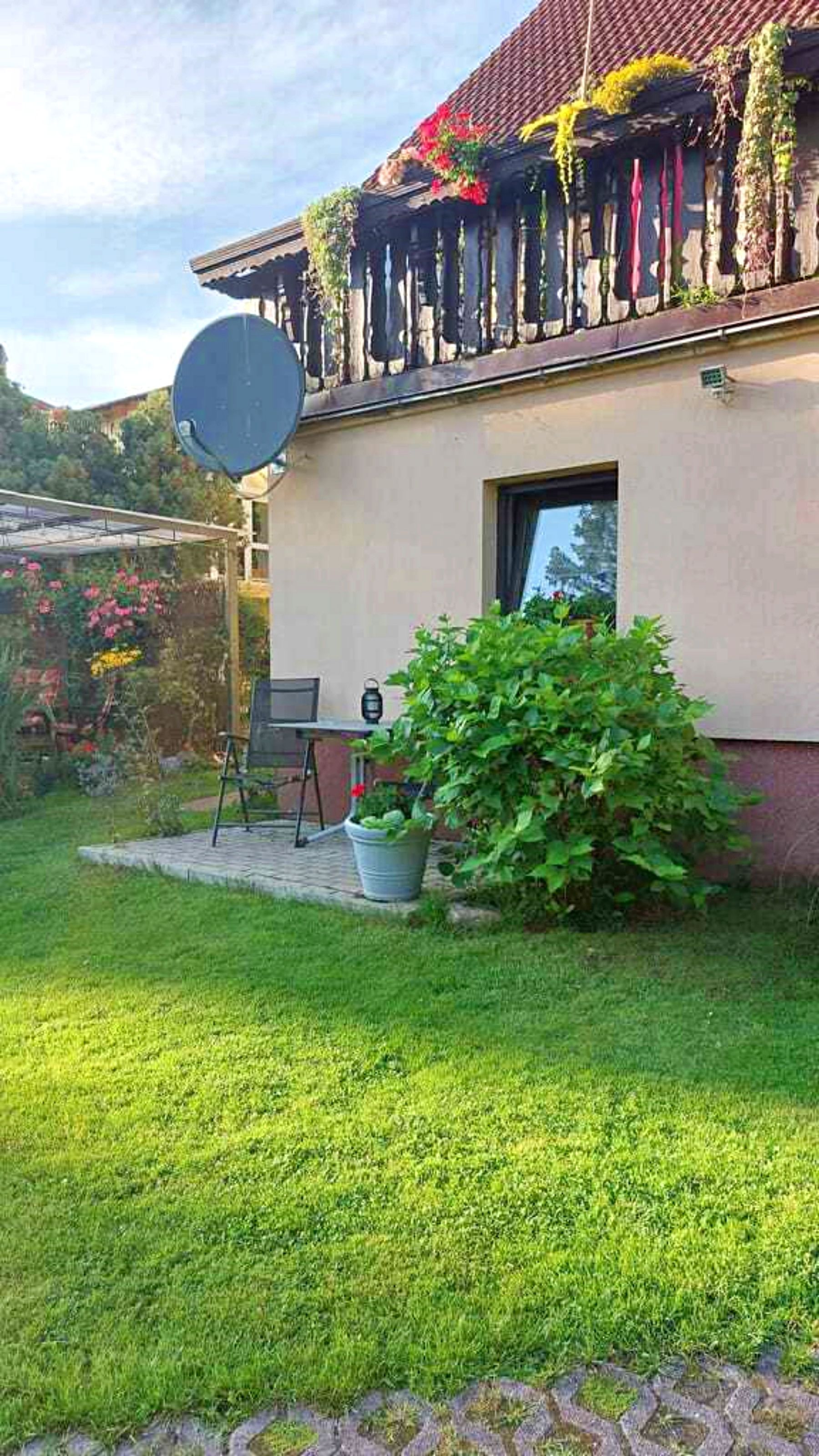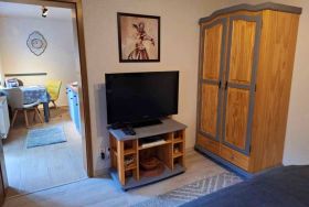 Unseren Gästen steht hier eine Ferienwohnung in herrlich grüner Lage zur Verfügung. Die Ferienwohnung ist ca. 30 qm groß und ist hell und freundlich eingerichtet und wurde im April 2024 neu renoviert. Die Ferienwohnung verfügt über ein separates Schlafzimmer (ohne Fenster) mit Einzelbett. Es gibt einen weiteren Raum mit Doppelbett und Fernseher, sodass die Ferienwohnung optimal für 3 Personen geeignet ist. Die separate Küche mit Essplatz und Fernseher dient als Aufenthaltsraum. Ein Wohnzimmer gibt es nicht. In der Küche gibt es einen 2-Platten-Ceranherd, Kühlschrank, Mikrowelle, Kaffeemaschine und Toaster. Unsere Gäste genießen den direkten Blick ins Grüne. Für ein gemütliches Frühstück oder Abendessen an herrlich, lauen Sommertagen steht eine überdachte Terrasse sowie eine Sitzfläche im Freien zur Verfügung. Grillmöglichkeiten sind selbstverständlich vorhanden.Die Erstausstattung Bettwäsche ist inklusive. Handtücher bringen Sie bitte selbst mit.