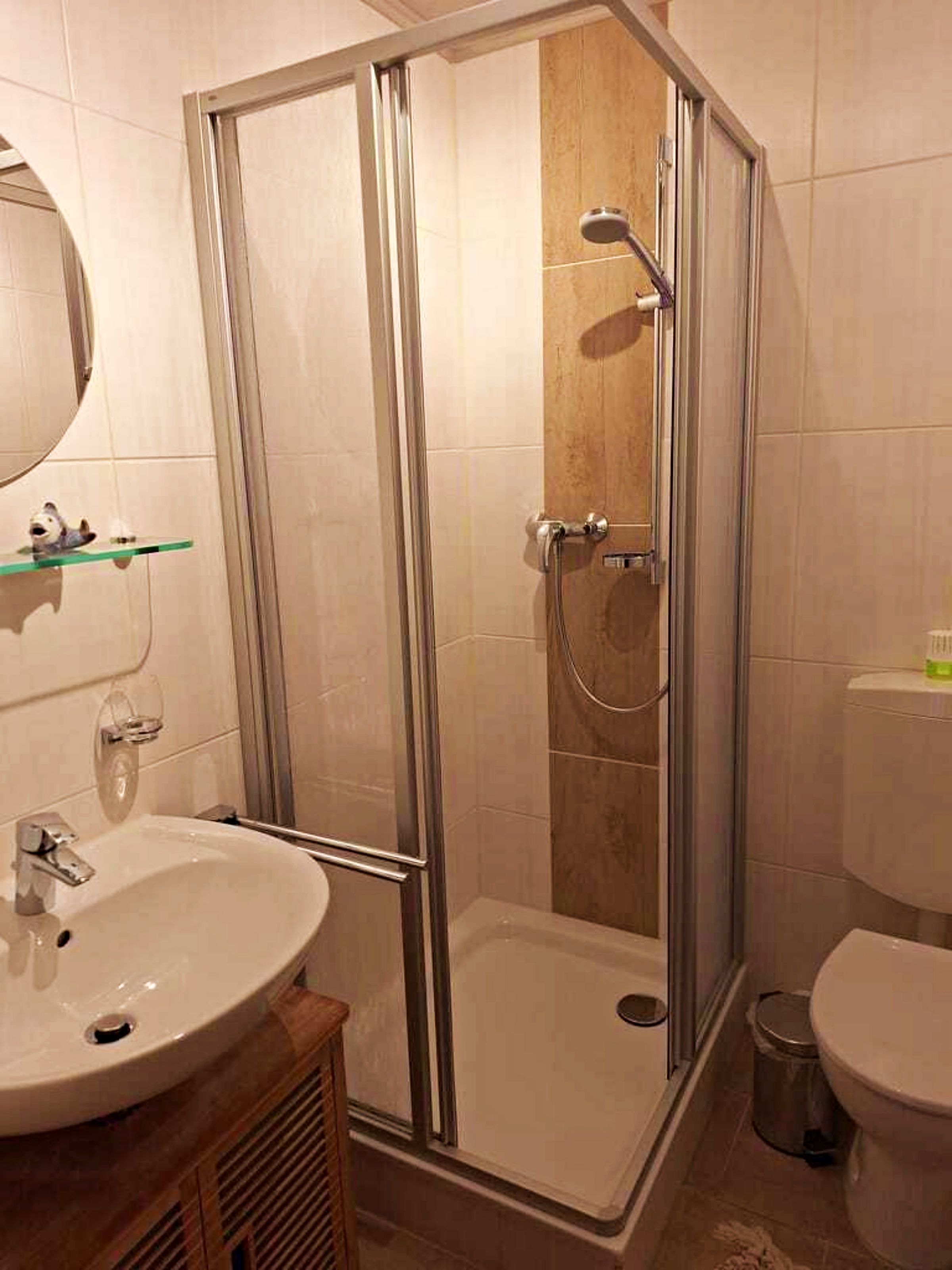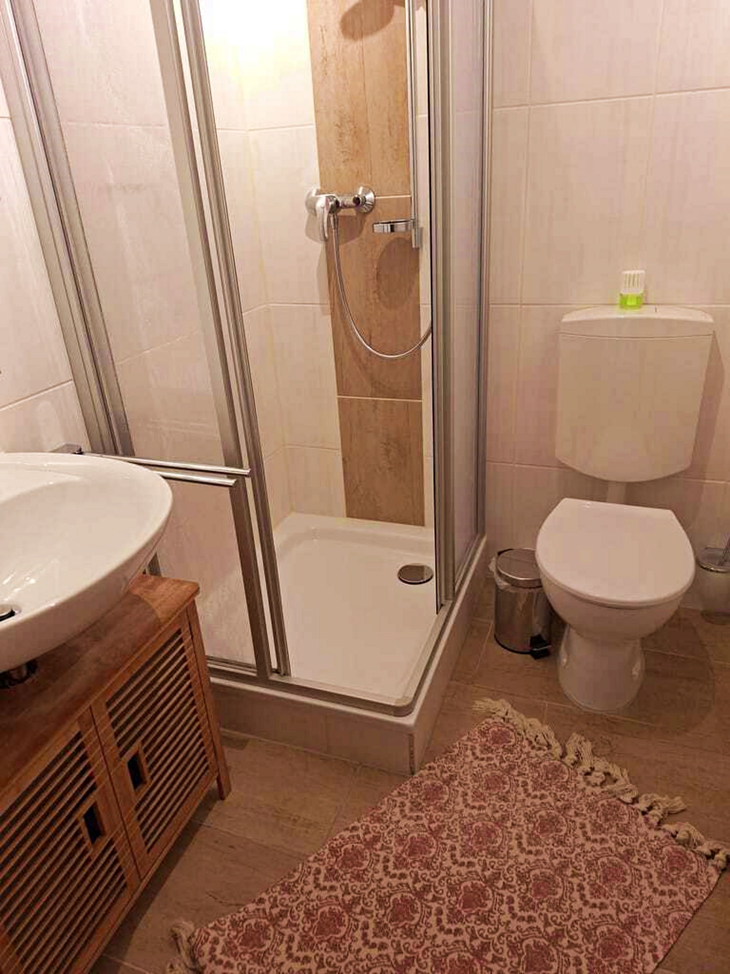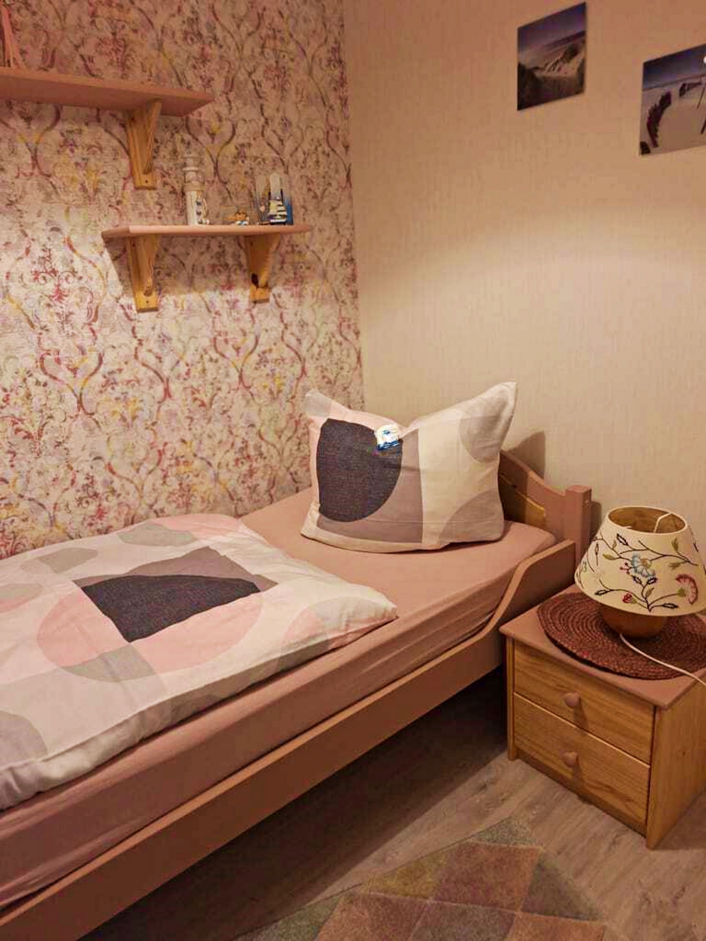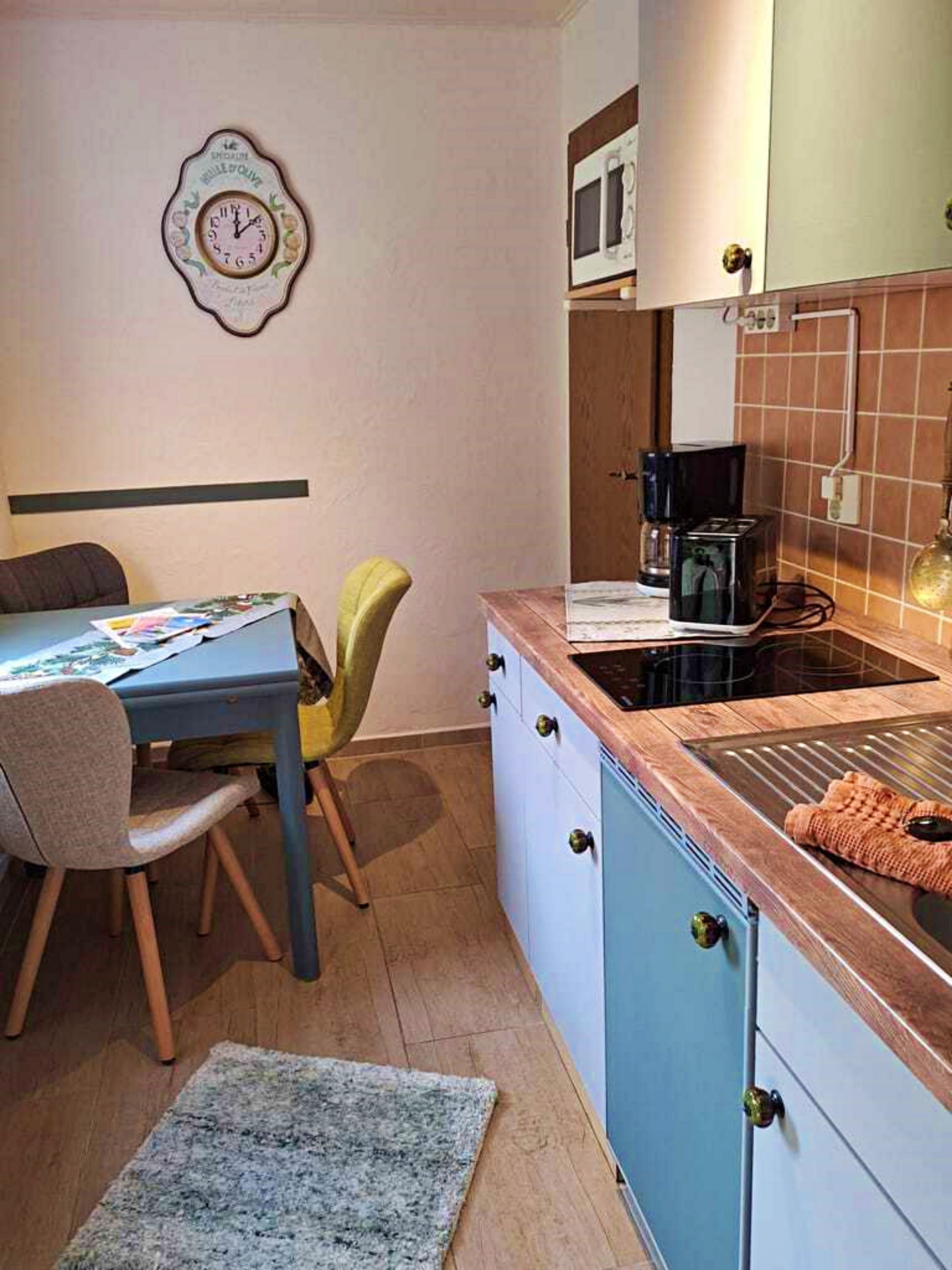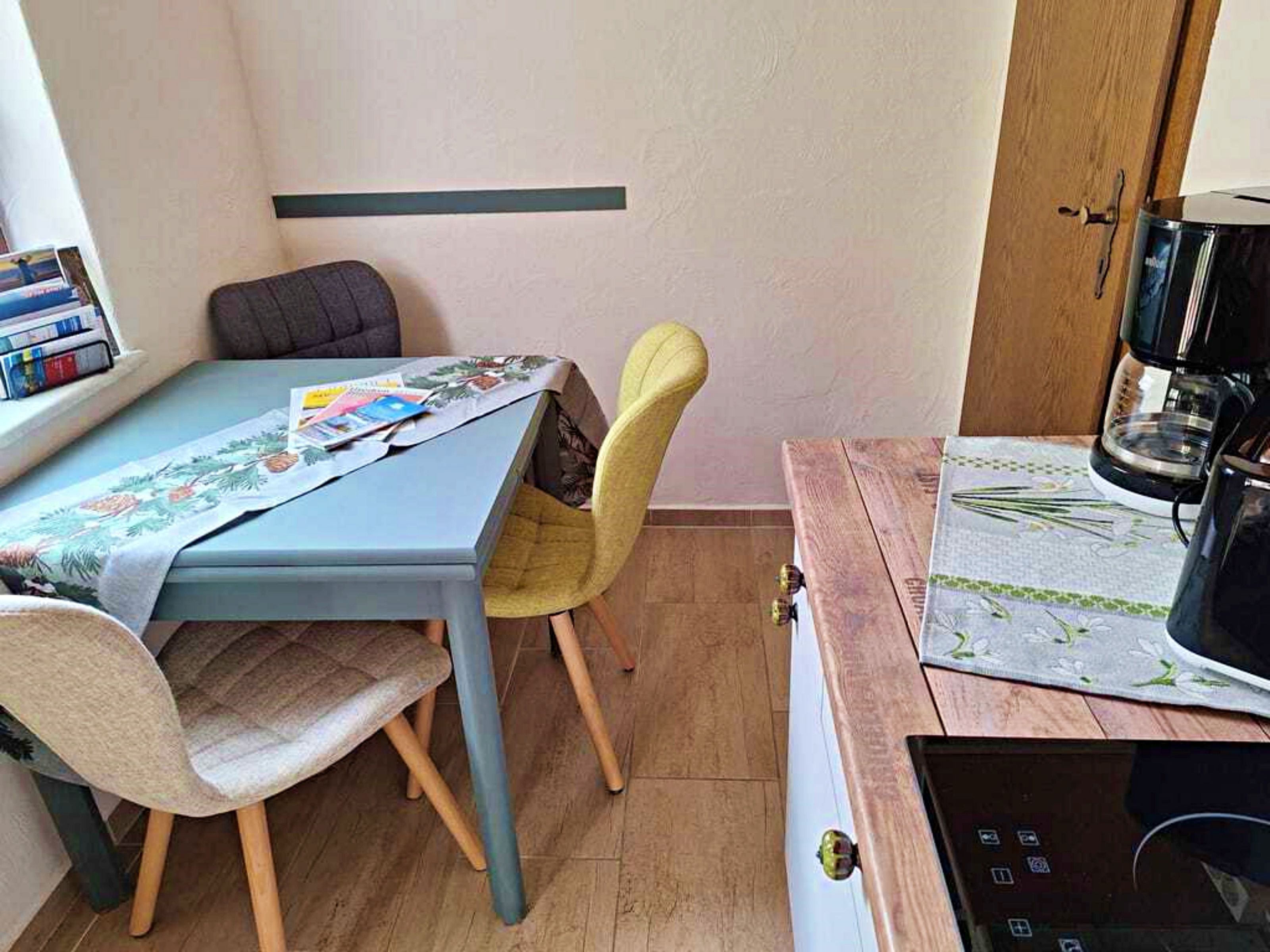Unseren Gästen steht hier eine Ferienwohnung in herrlich grüner Lage zur Verfügung. Die Ferienwohnung ist ca. 30 qm groß und ist hell und freundlich eingerichtet und wurde im April 2024 neu renoviert. Die Ferienwohnung verfügt über ein separates Schlafzimmer (ohne Fenster) mit Einzelbett. Es gibt einen weiteren Raum mit Doppelbett und Fernseher, sodass die Ferienwohnung optimal für 3 Personen geeignet ist. Die separate Küche mit Essplatz und Fernseher dient als Aufenthaltsraum. Ein Wohnzimmer gibt es nicht. In der Küche gibt es einen 2-Platten-Ceranherd, Kühlschrank, Mikrowelle, Kaffeemaschine und Toaster. Unsere Gäste genießen den direkten Blick ins Grüne. Für ein gemütliches Frühstück oder Abendessen an herrlich, lauen Sommertagen steht eine überdachte Terrasse sowie eine Sitzfläche im Freien zur Verfügung. Grillmöglichkeiten sind selbstverständlich vorhanden.Die Erstausstattung Bettwäsche ist inklusive. Handtücher bringen Sie bitte selbst mit.