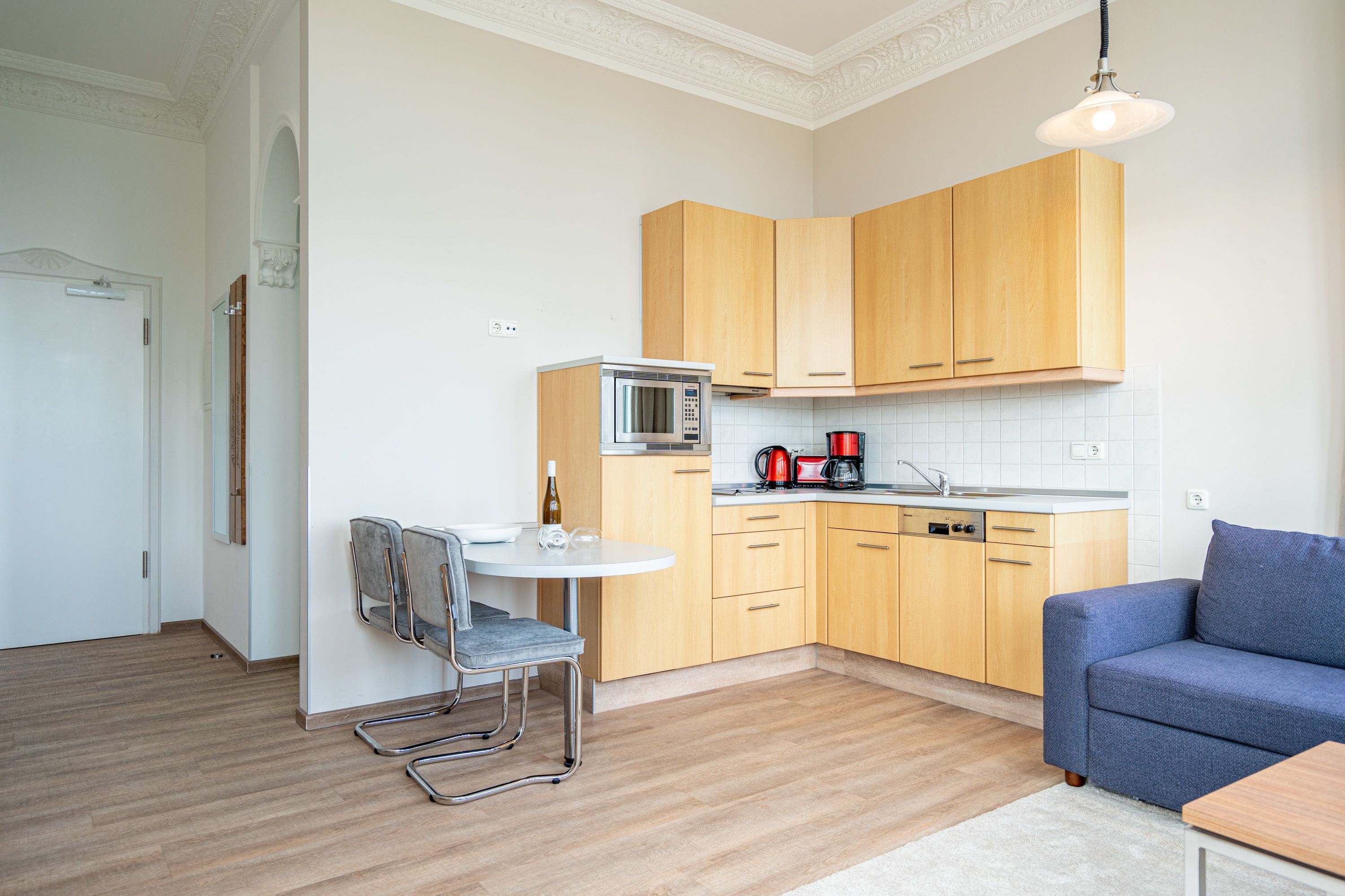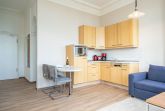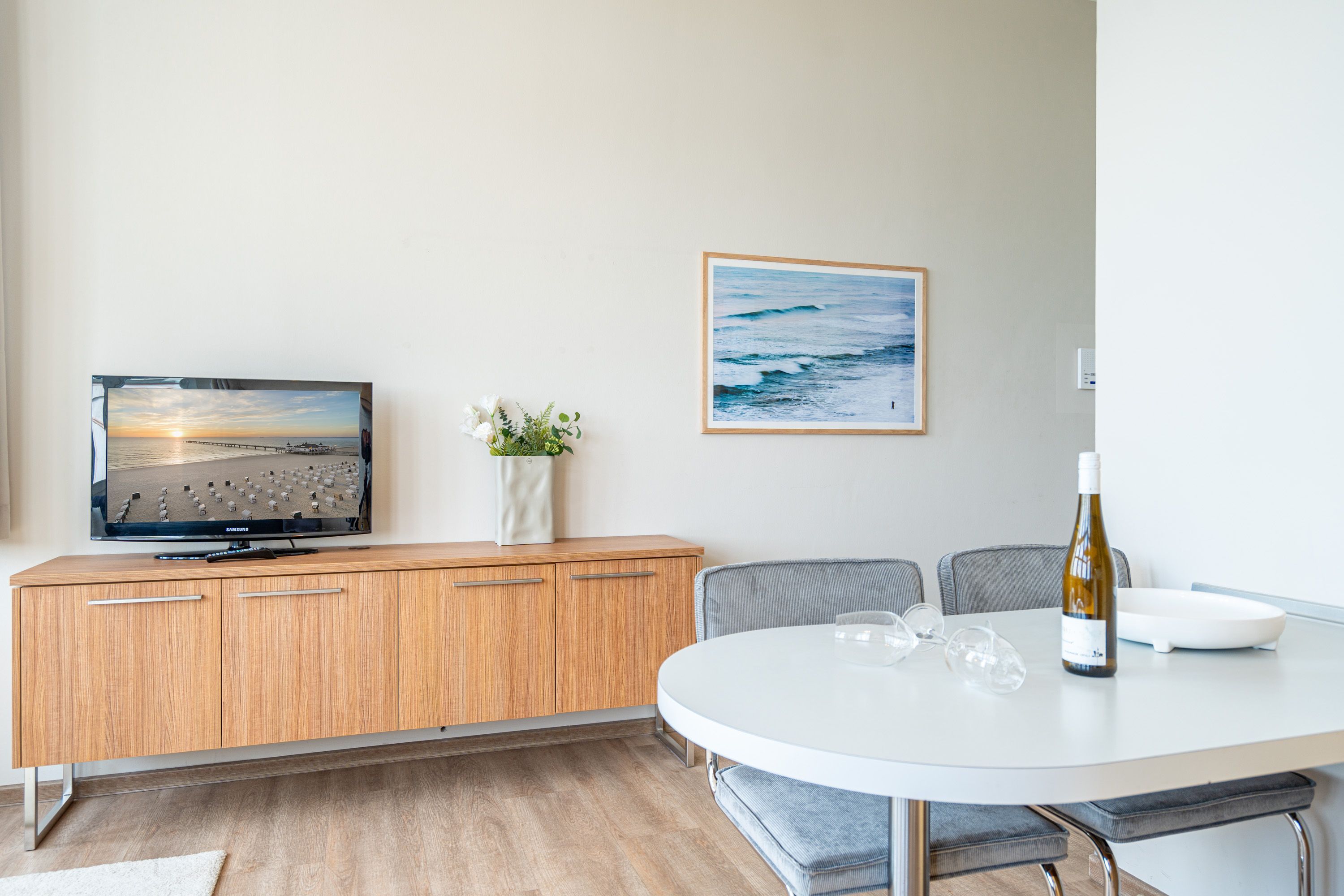 Die 2-Raum-Ferienwohnung Nr. C05 in der Villa Seedüwel bietet auf 40 qm Platz für zwei Personen und befindet sich im 1. Obergeschoss. Der offene Wohnbereich bietet einen Blick zur Promenade und Richtung Ostsee und ist mit einer Küchenzeile ausgestattet, die ein 2-Platten-Cerankochfeld, eine Mikrowelle und einen Kühlschrank mit Gefrierfach umfasst. Ein Essplatz für zwei Personen, eine gemütliche Sitzgruppe und ein Flat-TV sorgen für Komfort. Das Schlafzimmer verfügt über ein Doppelbett (1,80 m x 2,00 m) und einen Kleiderschrank. Auch von hier aus genießen Sie den Blick Richtung Promenade und Ostsee. Das Bad ist mit einer Dusche und einem Waschbecken ausgestattet, zudem gibt es ein separates WC. Ein Stellplatz in der Tiefgarage ( Einfahrthöhe 2,03m) des benachbarten Hauses „Strandterrasse“ ist für Sie reserviert. WLAN steht Ihnen kostenfrei zur Verfügung.