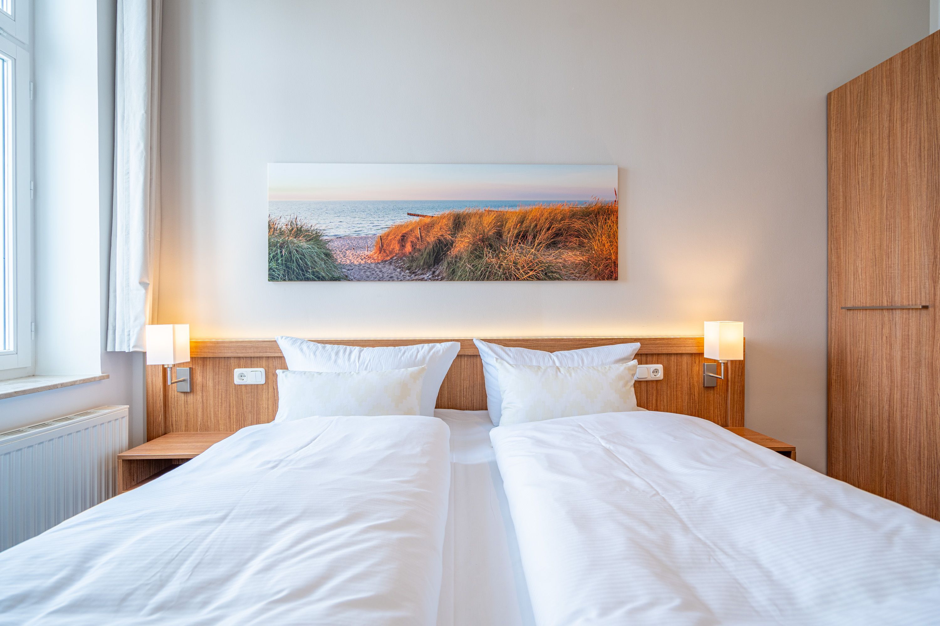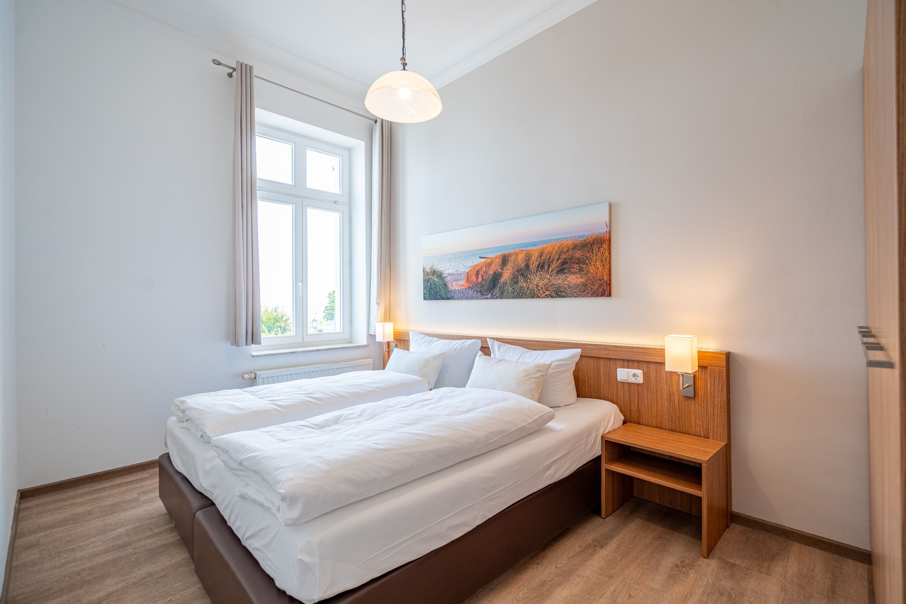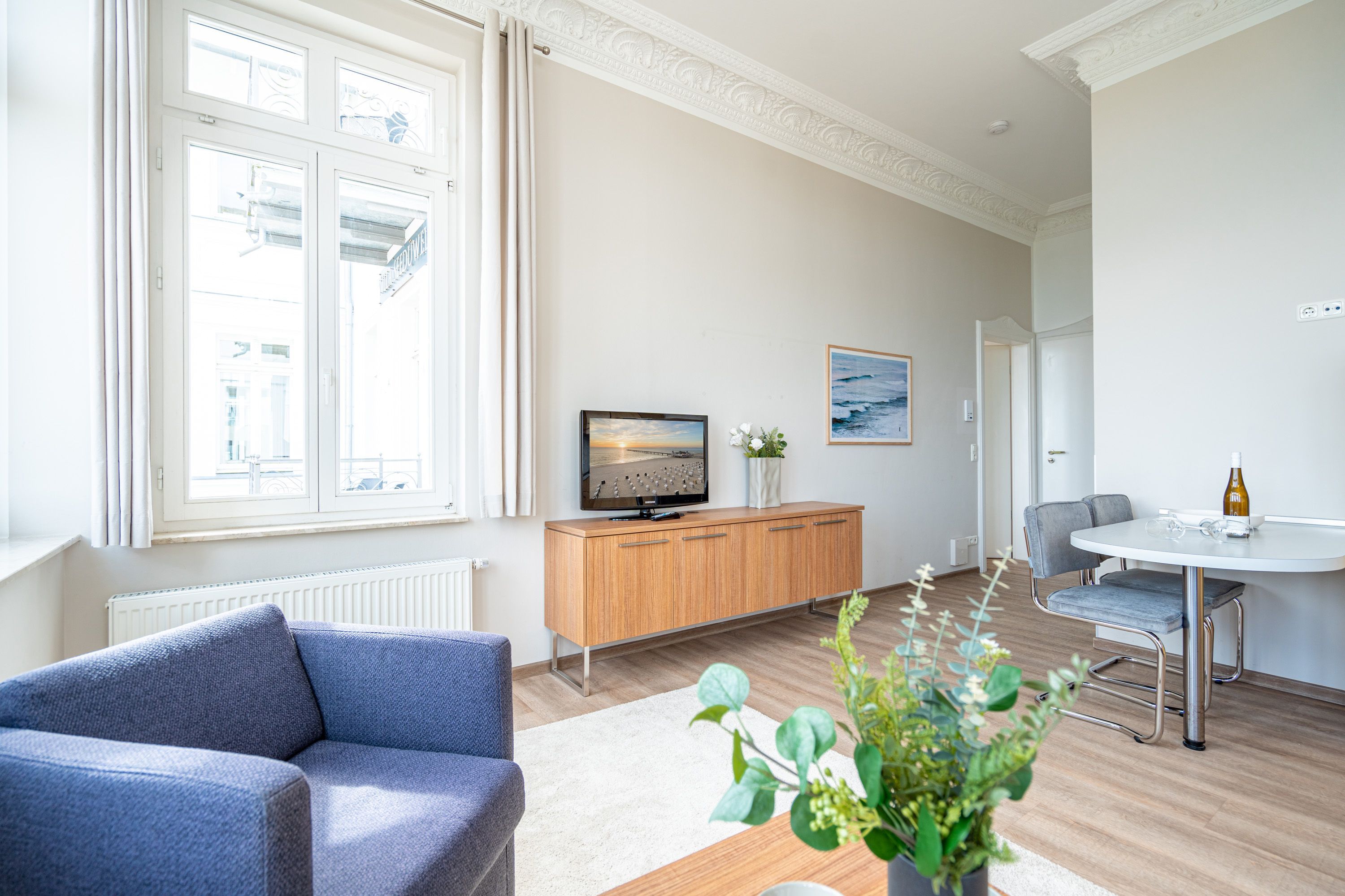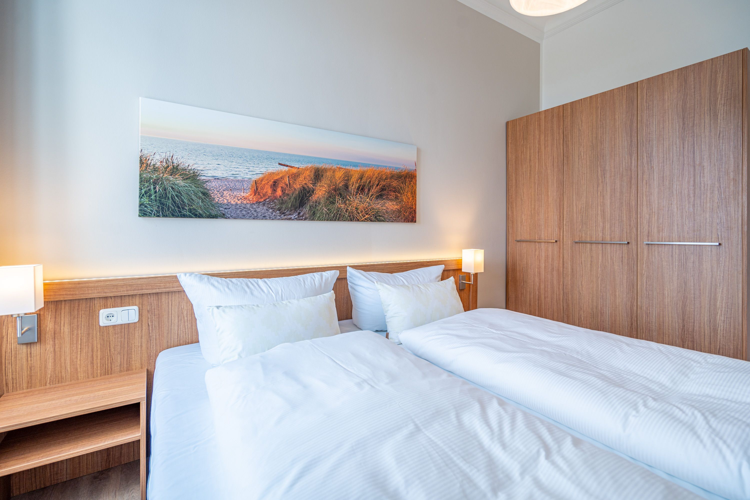 Die 2-Raum-Ferienwohnung Nr. C05 in der Villa Seedüwel bietet auf 40 qm Platz für zwei Personen und befindet sich im 1. Obergeschoss. Der offene Wohnbereich bietet einen Blick zur Promenade und Richtung Ostsee und ist mit einer Küchenzeile ausgestattet, die ein 2-Platten-Cerankochfeld, eine Mikrowelle und einen Kühlschrank mit Gefrierfach umfasst. Ein Essplatz für zwei Personen, eine gemütliche Sitzgruppe und ein Flat-TV sorgen für Komfort. Das Schlafzimmer verfügt über ein Doppelbett (1,80 m x 2,00 m) und einen Kleiderschrank. Auch von hier aus genießen Sie den Blick Richtung Promenade und Ostsee. Das Bad ist mit einer Dusche und einem Waschbecken ausgestattet, zudem gibt es ein separates WC. Ein Stellplatz in der Tiefgarage ( Einfahrthöhe 2,03m) des benachbarten Hauses Strandterrasse ist für Sie reserviert. WLAN steht Ihnen kostenfrei zur Verfügung.