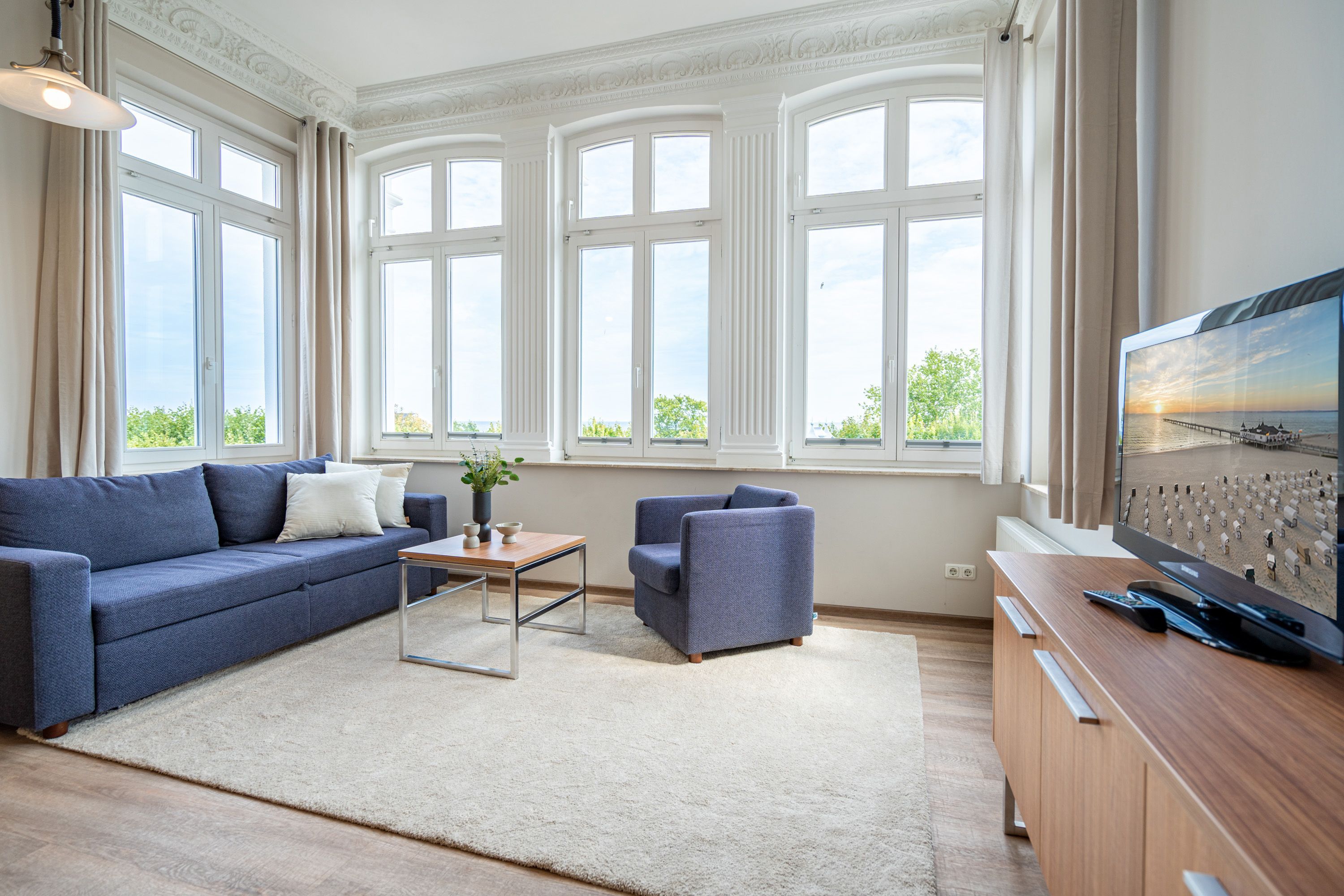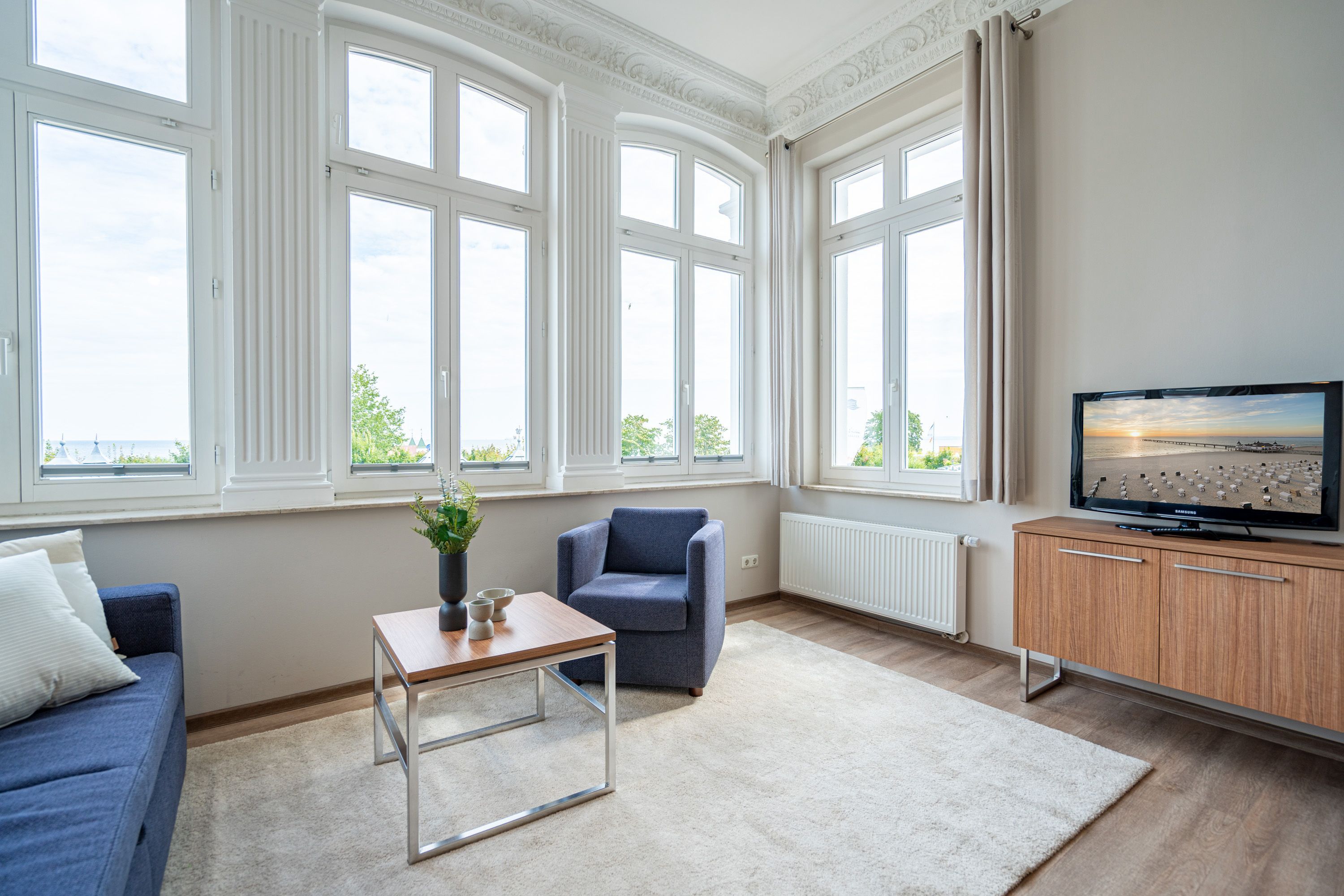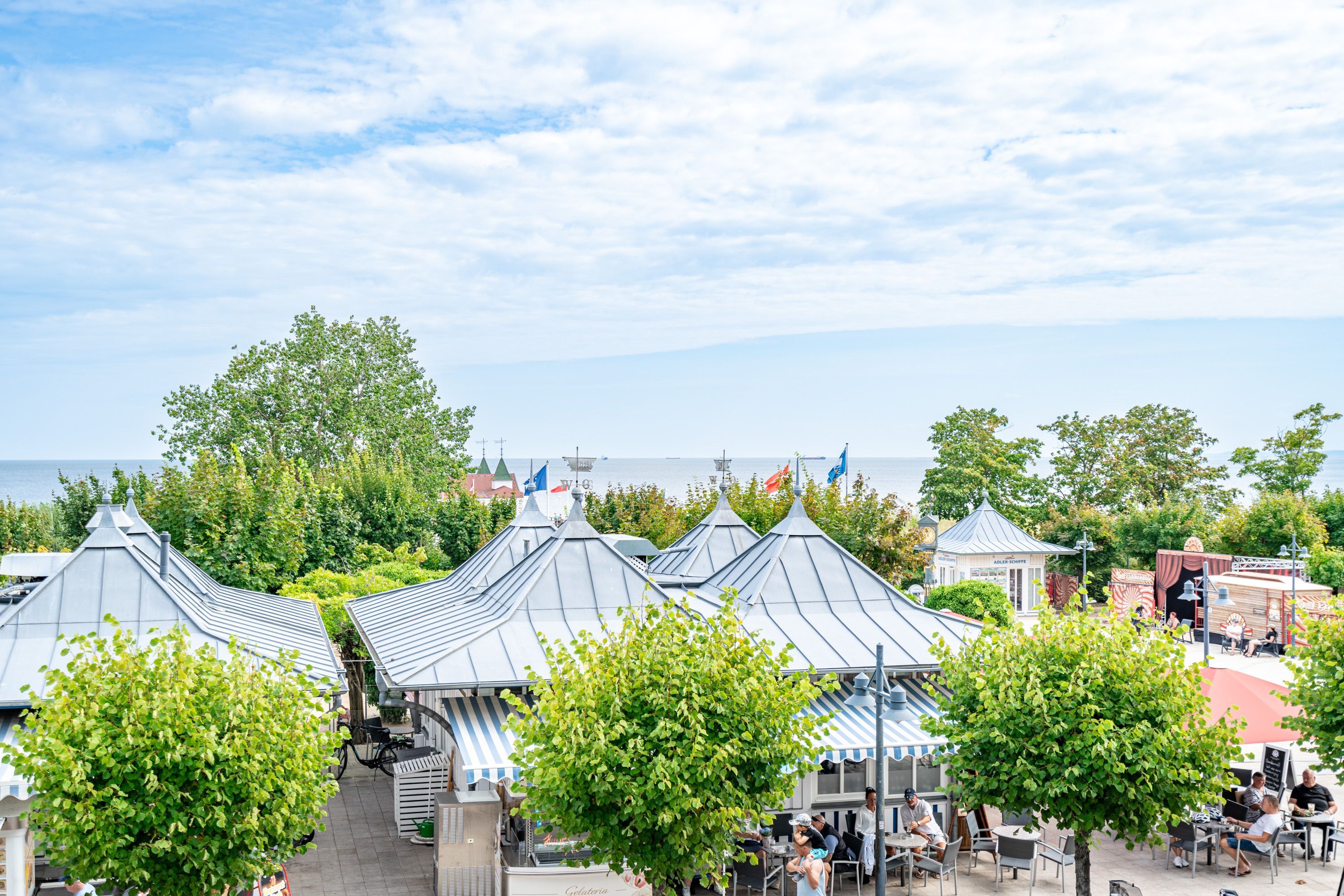 Die Villa Seedüwel - als Nachbarhaus der Strandterrasse, besticht durch ihre einmalige Lage direkt an der Ahlbecker Seebrücke, der belebten Promenade sowie der historischen Konzertmuschel, einem beliebten Treffpunkt für Kunst und Kultur. Dieses Objekt bietet insgesamt 13 Ferienwohnungen mit einem, zwei oder drei Räumen. Einige der Apartments bieten einen spektakulären Ausblick auf die historische Seebrücke und die Ostsee. Für Ihren PKW steht ein Stellplatz in der Tiefgarage des benachbarten Hauses Strandterrasse zur Verfügung (Zufahrt über Kurstraße), von der Sie direkten Zugang zur Villa haben. Ein Fahrstuhl im Haus ist über einige Stufen im Flur erreichbar. Die Villa ist komplett mit kostenfreiem WLAN ausgestattet. Zudem gibt es einen gemeinschaftlichen Fahrradkeller für die sichere Aufbewahrung Ihrer Fahrräder. Der feinsandige, weiße Strand und das Meer liegen nur wenige Schritte entfernt. Die attraktive Lage bietet Ihnen eine Vielzahl an Restaurants, Cafés und Einkaufsmöglichkeiten (unter anderem im Erdgeschoss des Hauses) sowie das charmante Ambiente von Ahlbeck.