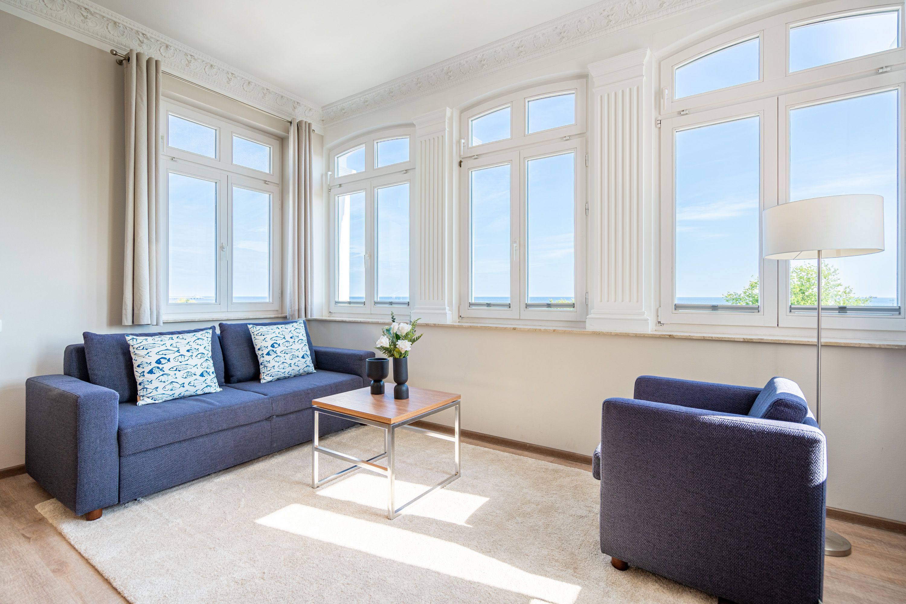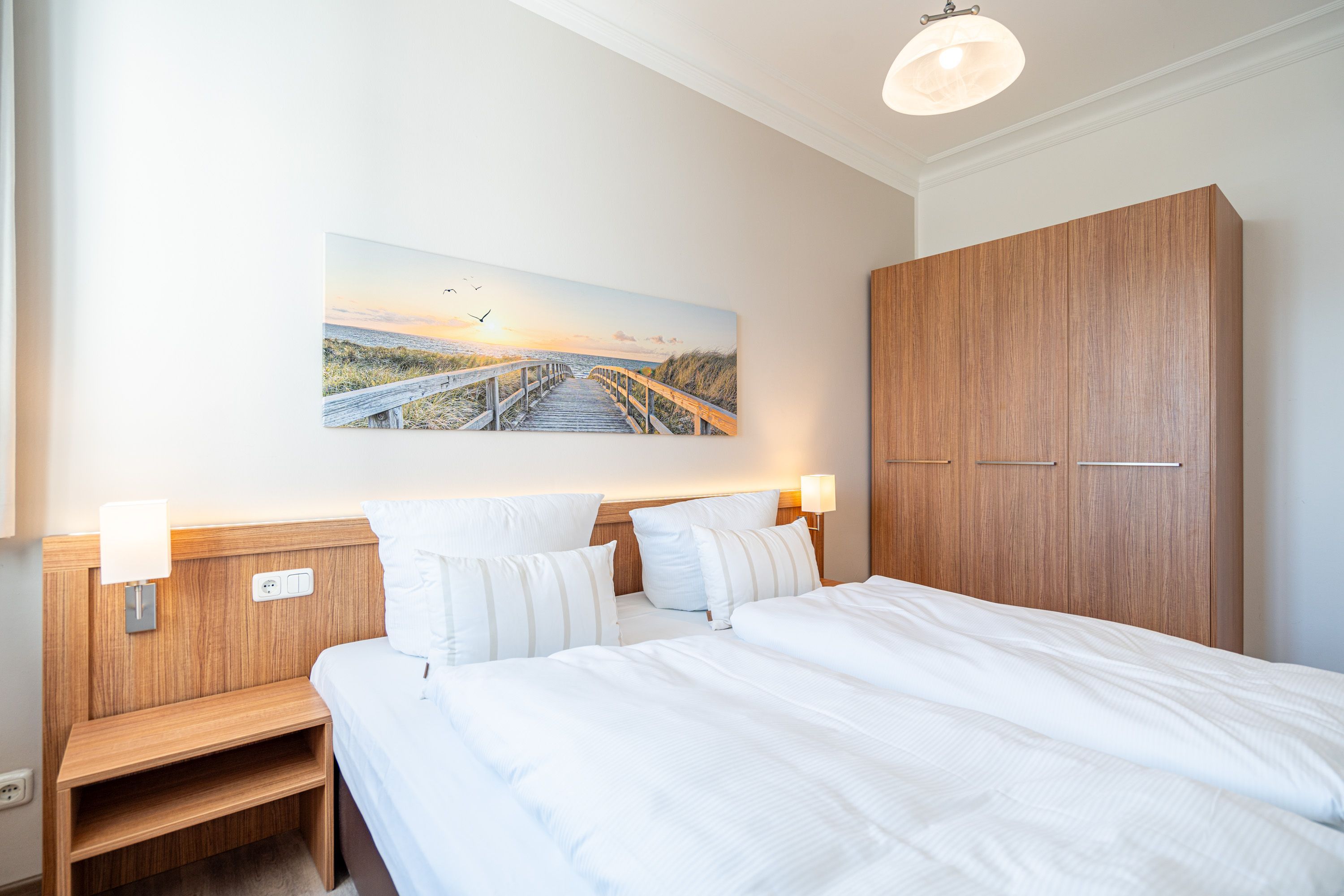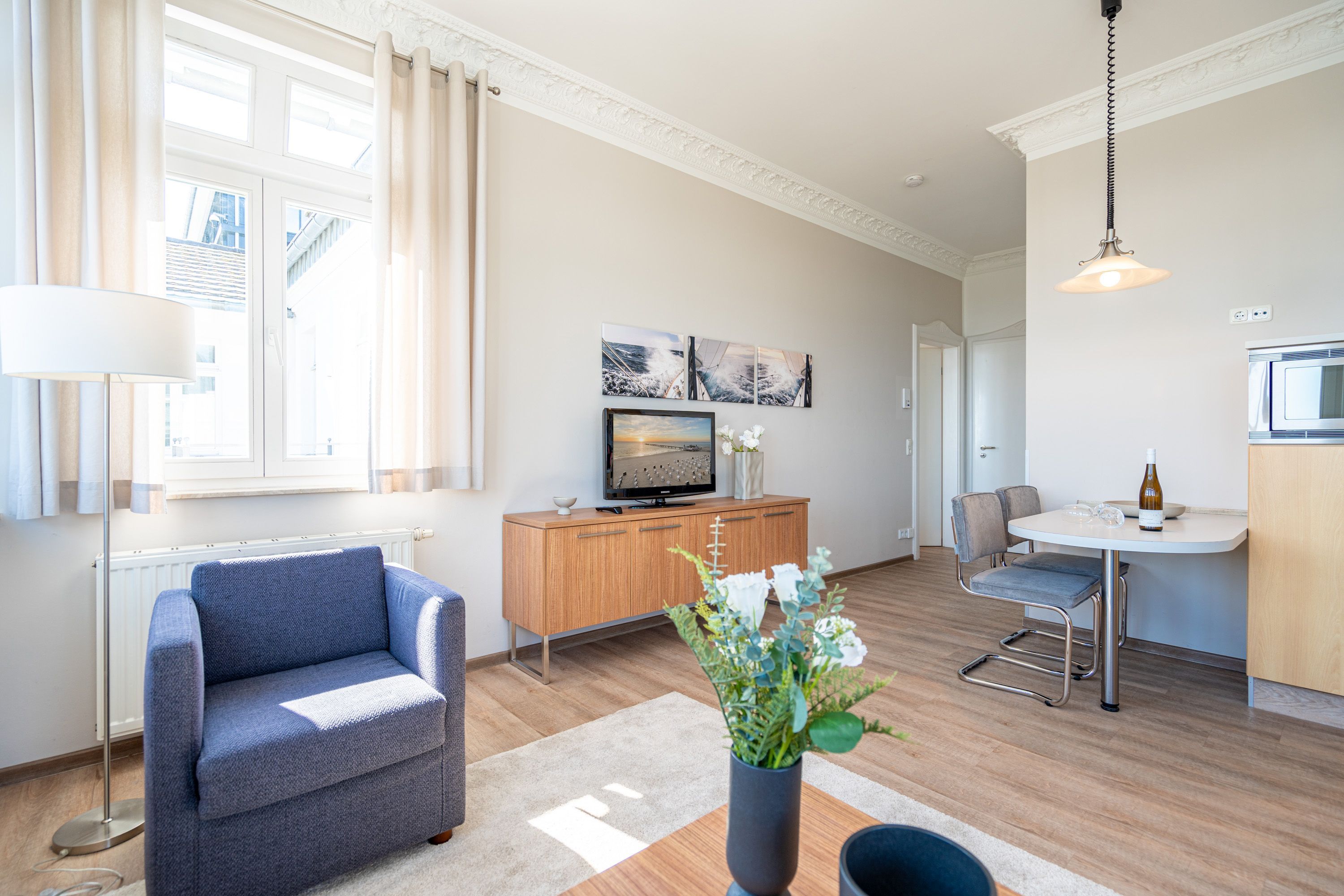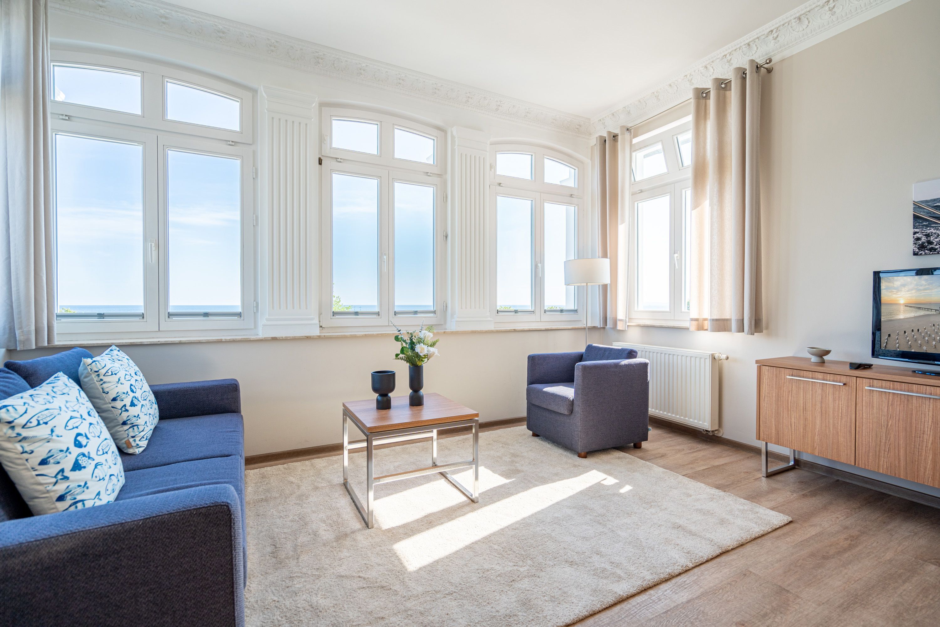 Die 2-Raum-Ferienwohnung Nr. C11 in der Villa Seedüwel bietet auf 41 qm gemütlichen Platz für zwei Personen und liegt im 2. Obergeschoss. Der offene Wohnbereich begeistert mit einem traumhaften Blick auf die Ostsee und ist mit einer Küchenzeile ausgestattet, die ein 2-Platten-Cerankochfeld, eine Mikrowelle und einen Kühlschrank mit Gefrierfach umfasst. Ein Essplatz für zwei Personen, eine Sitzgruppe und ein Flat-TV vervollständigen den Wohnbereich. Das Schlafzimmer verfügt über ein komfortables Doppelbett (1,80 m x 2,00 m) und einen Kleiderschrank. Auch von hier aus genießen Sie den Blick auf die Ostsee. Das innenliegende Bad ist mit einer Dusche und einem Waschbecken ausgestattet, und es gibt ein separates WC. Ein Stellplatz in der Tiefgarage ( Einfahrthöhe 2,03m) des benachbarten Hauses „Strandterrasse“ ist für Sie reserviert. WLAN steht Ihnen kostenfrei zur Verfügung.
