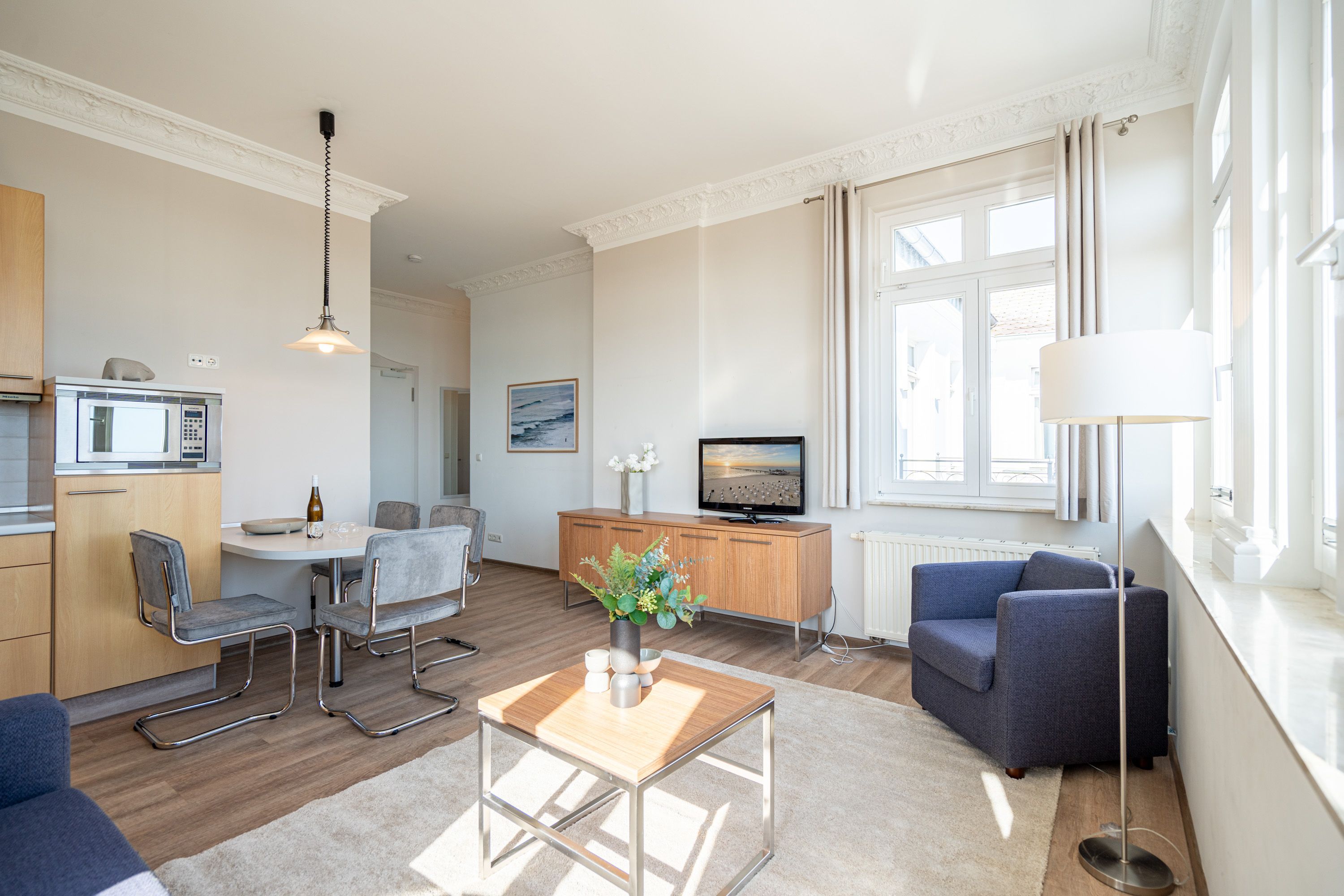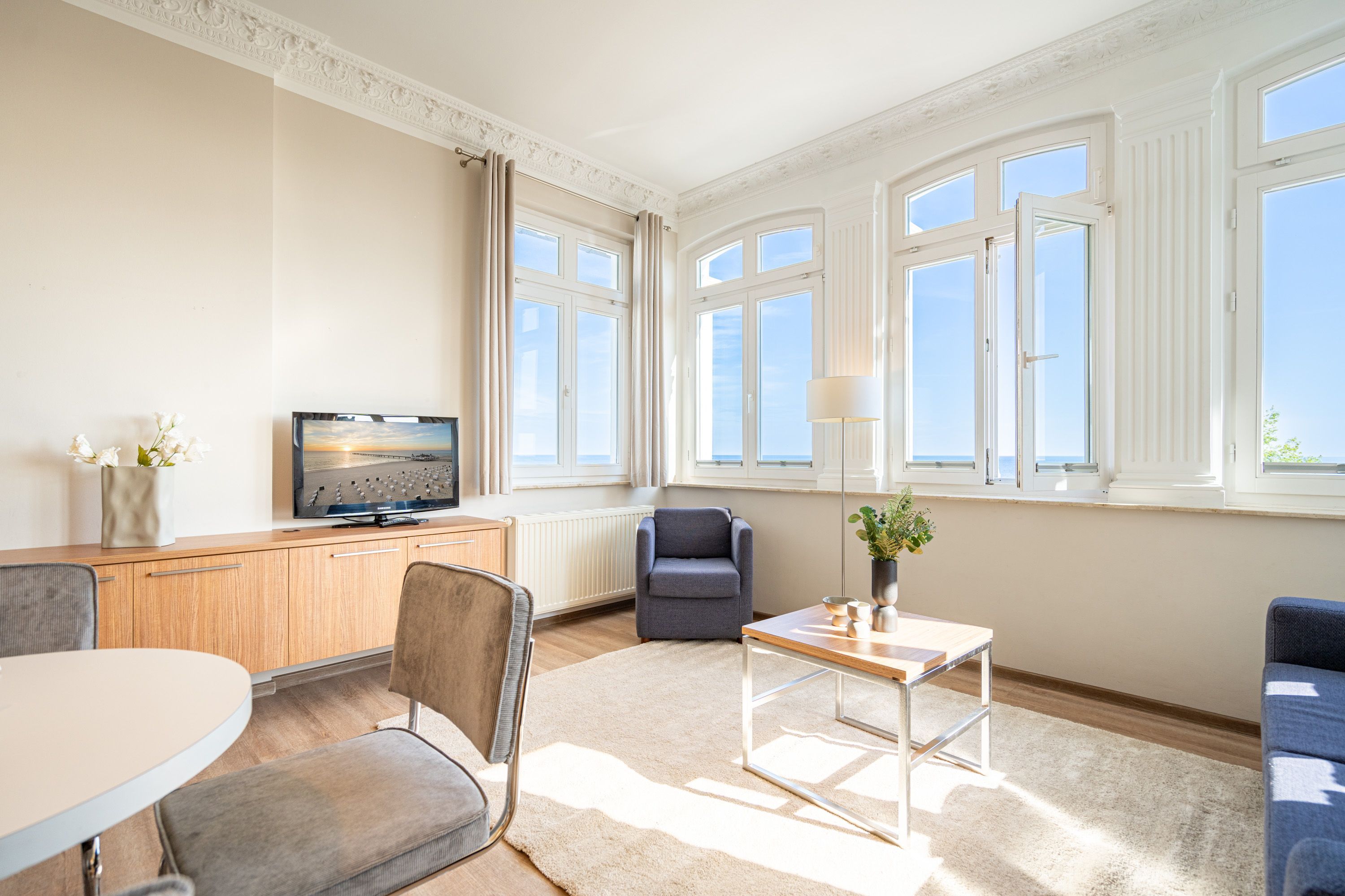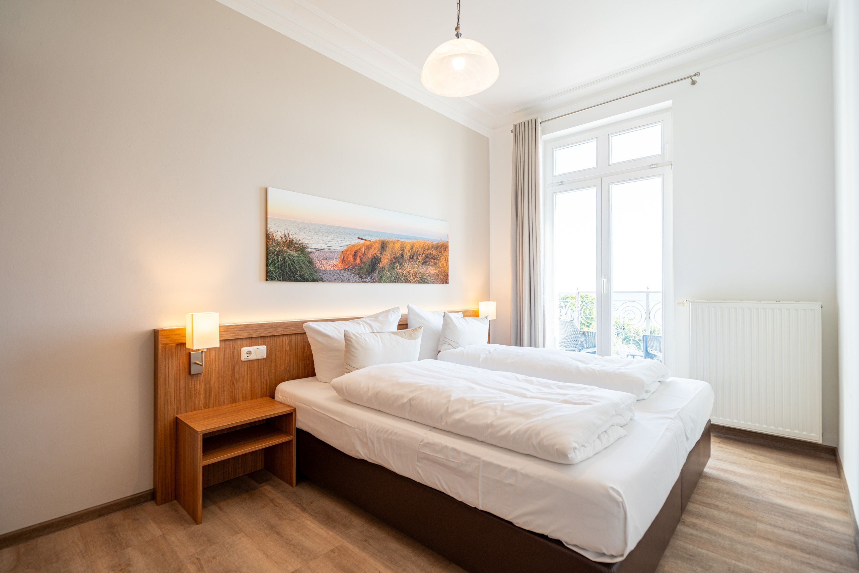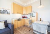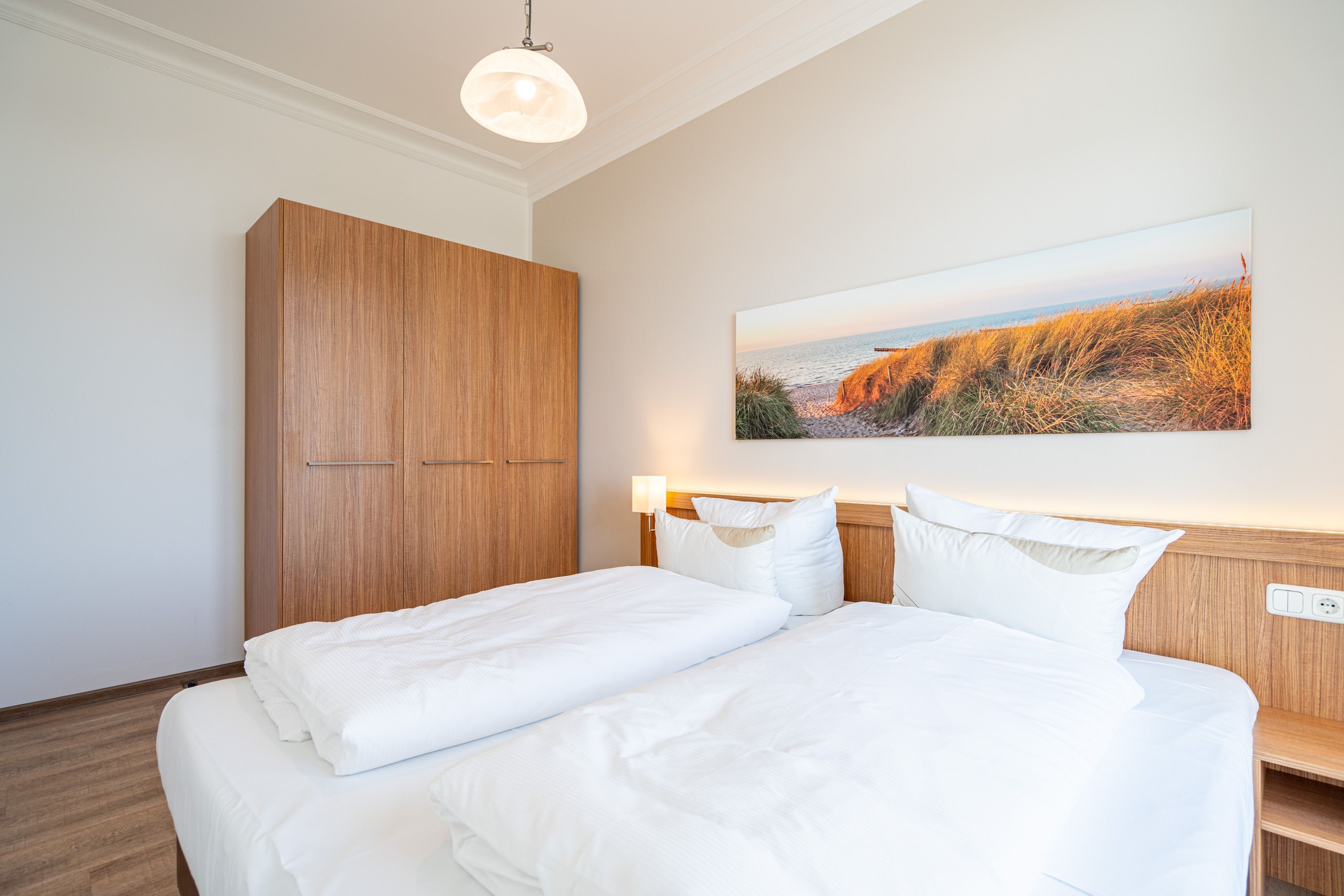 Die 3-Raum-Ferienwohnung Nr. C12 in der Villa Seedüwel bietet auf 52 qm Platz für 2 bis 4 Personen und befindet sich im 2. Obergeschoss. Der offene Wohnbereich besticht durch einen traumhaften Blick auf die Seebrücke und die Ostsee. Hier finden Sie eine gut ausgestattete Küchenzeile mit einem 2-Platten-Cerankochfeld, einer Mikrowelle und einem Kühlschrank mit Gefrierfach sowie einen Essplatz für vier Personen, eine gemütliche Sitzgruppe und einen Flat-TV. Das erste Schlafzimmer verfügt über ein komfortables Doppelbett (1,80 m x 2,00 m) und einen Kleiderschrank. Von hier aus gelangen Sie auf den kleinen Nord-Ost-Balkon, der einen schönen Blick auf die Ostsee bietet. Das zweite Schlafzimmer ist mit einem Etagenbett (0,90 m x 2,00 m) ausgestattet. Das innenliegende Bad umfasst eine Dusche und ein Waschbecken, zudem gibt es ein separates WC. Ein Stellplatz in der Tiefgarage ( Einfahrthöhe 2,03m) des benachbarten Hauses Strandterrasse ist für Sie reserviert. WLAN steht Ihnen kostenfrei zur Verfügung.