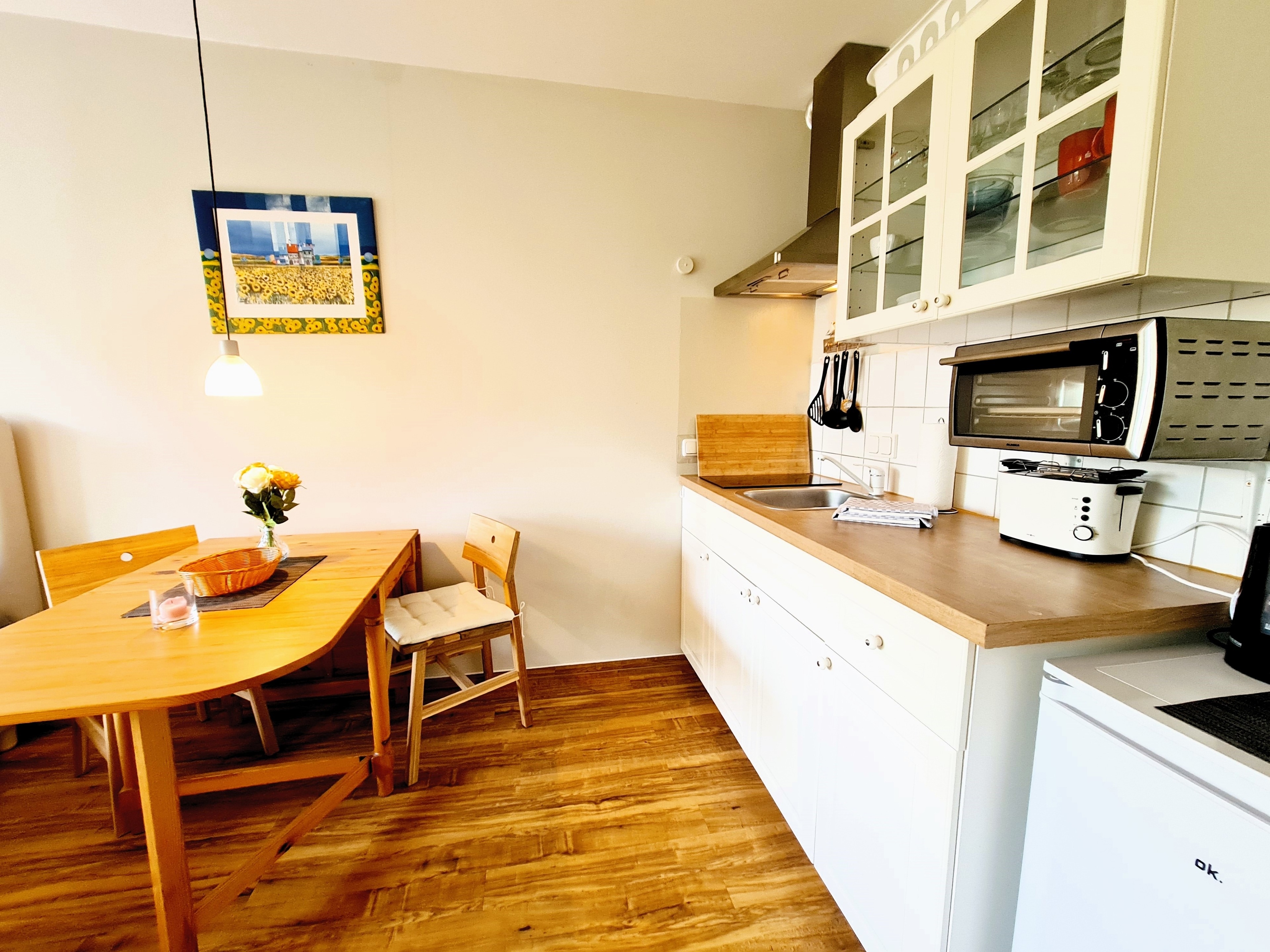 Die Wohnung befindet sich im ersten Stock des Hauses und verfügt über eine kleine Küche, mit allem was man für einen kleinen Urlaub an der Küste braucht.