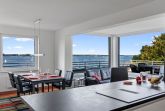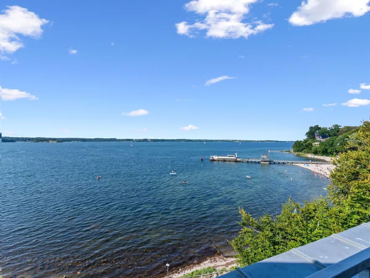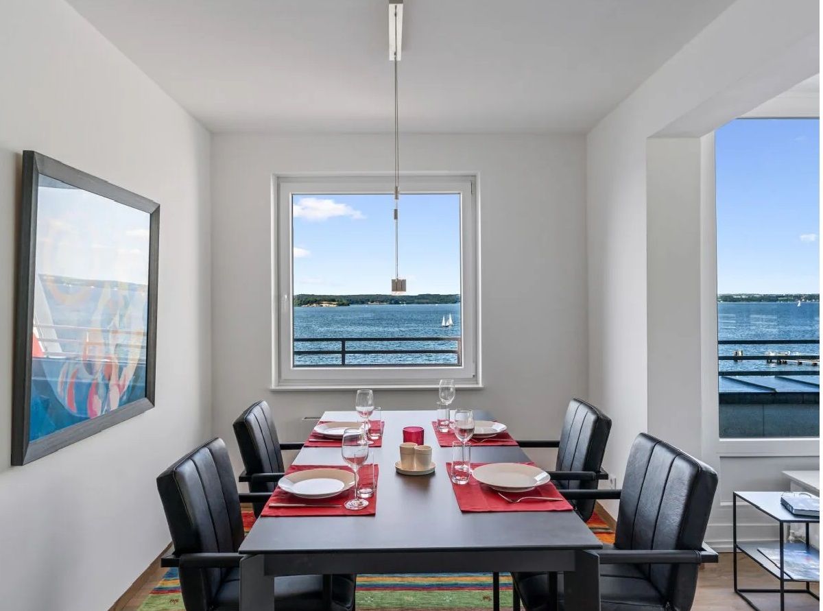 Ferienwohnung für 4 Personen in Top-Lage, direkt am Strand Sandwig in Glücksburg, Flensburger Förde, mit nicht einsehbarem Balkon und 40m² großer Dachterrasse zur Wasserseite. 2 Schlafzimmer, Wohn-Esszimmer und offene Küche mit Blick über die Förde bis hin zu den Ochseninseln in Dänemark. Bad und zusätzliches GästeWC. Großzügige Dachterrasse zum Frühstücken und auch für Yoga- oder Pilates-Übungen zu zweit oder ggf. auch mit Fitnesstrainer...? (Adressen zwecks Buchung können vermittelt werden). Yachtschule und Schwimmen in der Förde oder im Herbst/Winter in der 5 Minuten fußläufig gelegenen Fördeland-Therme? Erholung und Fitness pur!