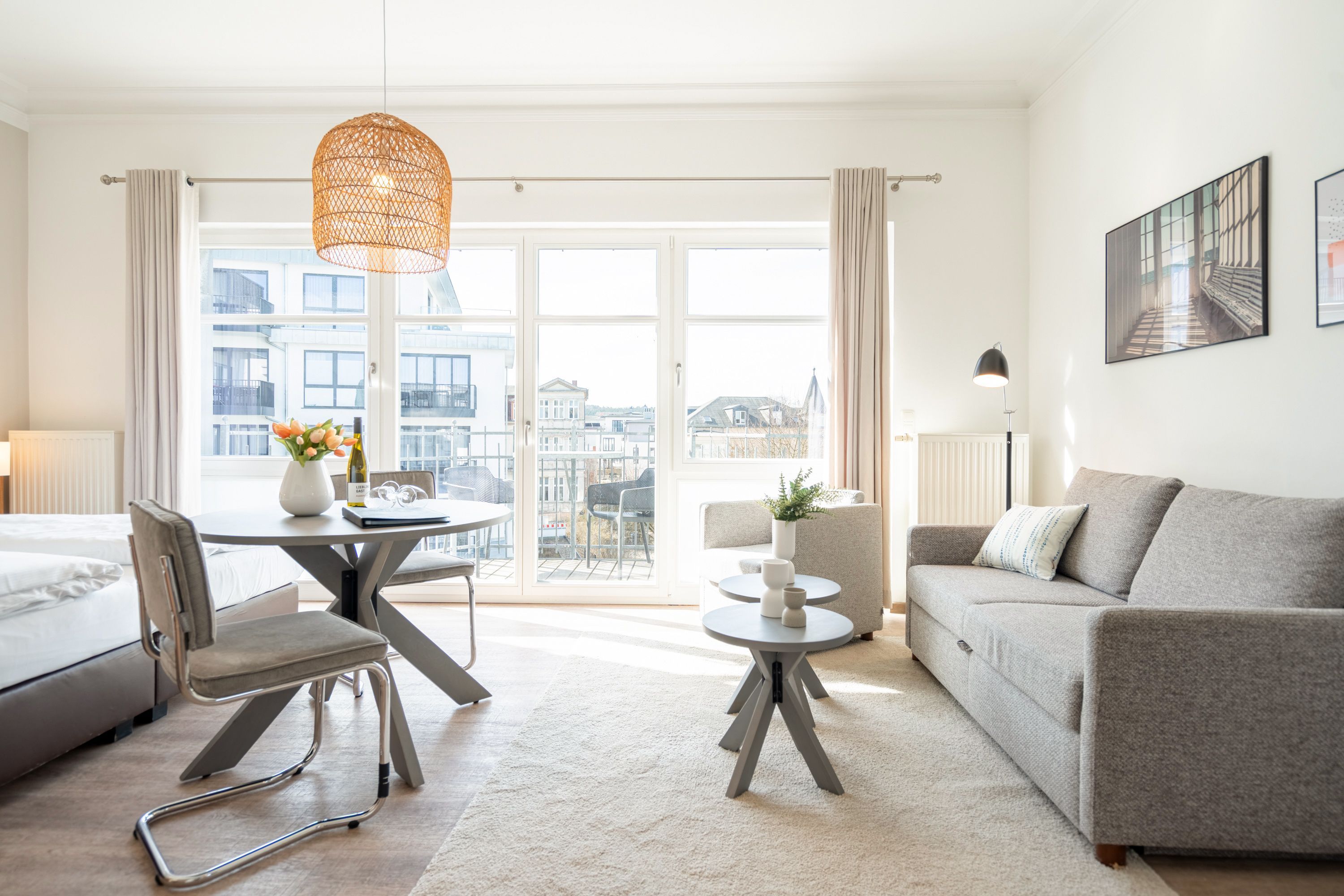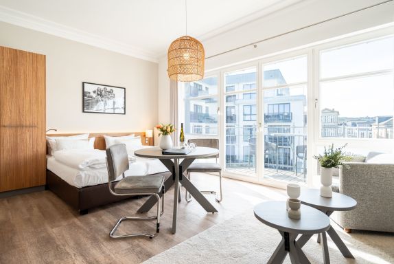 Die 1-Raum-Ferienwohnung Nr. C09 in der Villa Seedüwel bietet auf 35 qm komfortablen Platz für zwei Personen und befindet sich im Dachgeschoss. Der offene Wohnbereich ist mit einer Küchenzeile ausgestattet, die ein 3-Zonen-Induktionskochfeld, eine Mikrowelle und einen Kühlschrank mit Gefrierfach umfasst. Ein Essplatz für zwei Personen, eine gemütliche Sitzgruppe und ein Flat-TV sorgen für Komfort. Das Doppelbett (1,80 m x 2,00 m) befindet sich ebenfalls im Wohnbereich und wird durch eine Kommode sowie einen Kleiderschrank ergänzt. Von hier aus gelangen Sie auf den sonnigen Süd-West-Balkon. Das Tageslicht-Bad verfügt über eine Dusche, ein Waschbecken und ein WC. Ein Stellplatz in der Tiefgarage ( Einfahrthöhe 2,03m) des benachbarten Hauses Strandterrasse ist für Sie reserviert. WLAN steht Ihnen kostenfrei zur Verfügung.