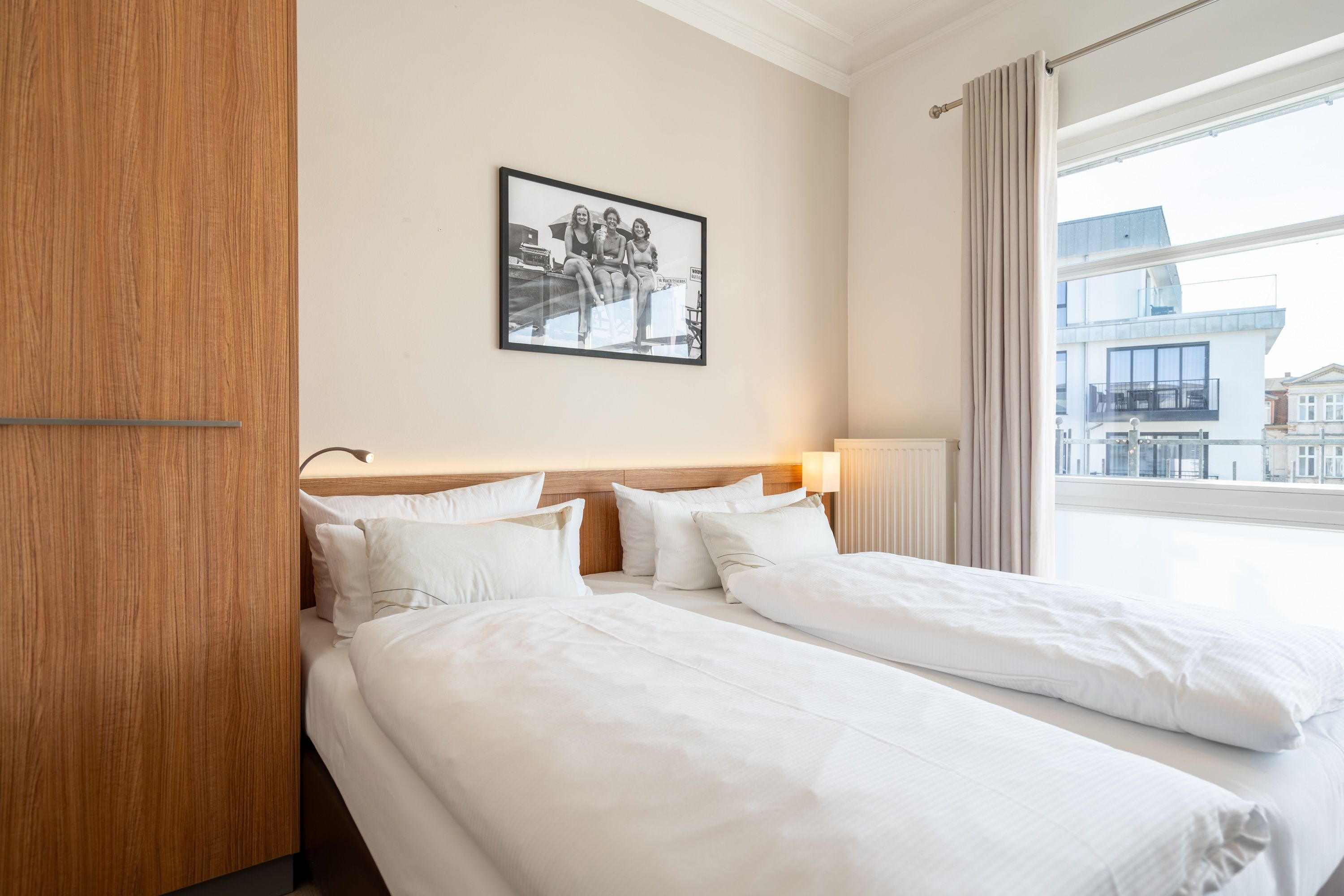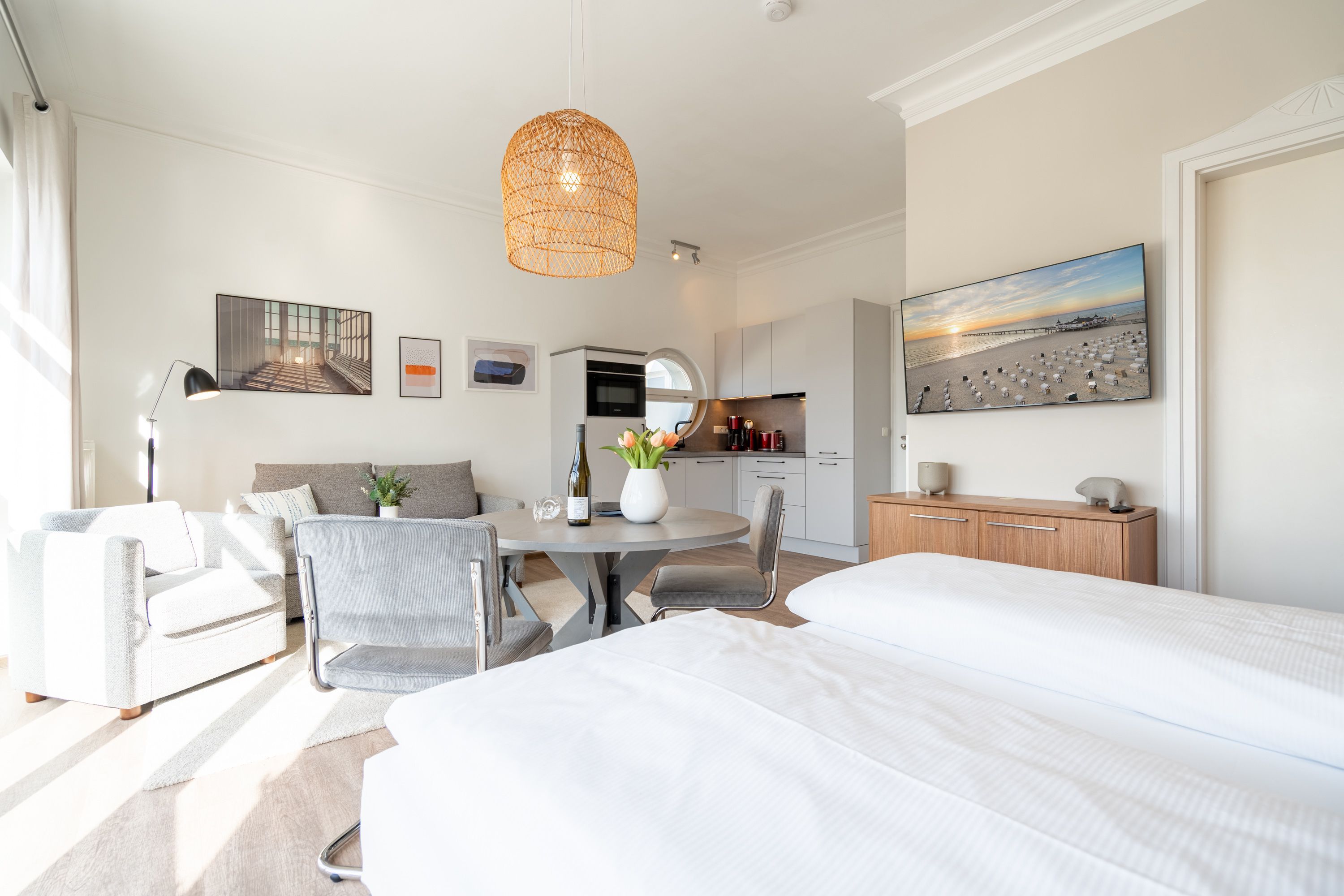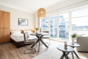 Die 1-Raum-Ferienwohnung Nr. C09 in der Villa Seedüwel bietet auf 35 qm komfortablen Platz für zwei Personen und befindet sich im Dachgeschoss. Der offene Wohnbereich ist mit einer Küchenzeile ausgestattet, die ein 3-Zonen-Induktionskochfeld, eine Mikrowelle und einen Kühlschrank mit Gefrierfach umfasst. Ein Essplatz für zwei Personen, eine gemütliche Sitzgruppe und ein Flat-TV sorgen für Komfort. Das Doppelbett (1,80 m x 2,00 m) befindet sich ebenfalls im Wohnbereich und wird durch eine Kommode sowie einen Kleiderschrank ergänzt. Von hier aus gelangen Sie auf den sonnigen Süd-West-Balkon. Das Tageslicht-Bad verfügt über eine Dusche, ein Waschbecken und ein WC. Ein Stellplatz in der Tiefgarage ( Einfahrthöhe 2,03m) des benachbarten Hauses „Strandterrasse“ ist für Sie reserviert. WLAN steht Ihnen kostenfrei zur Verfügung.