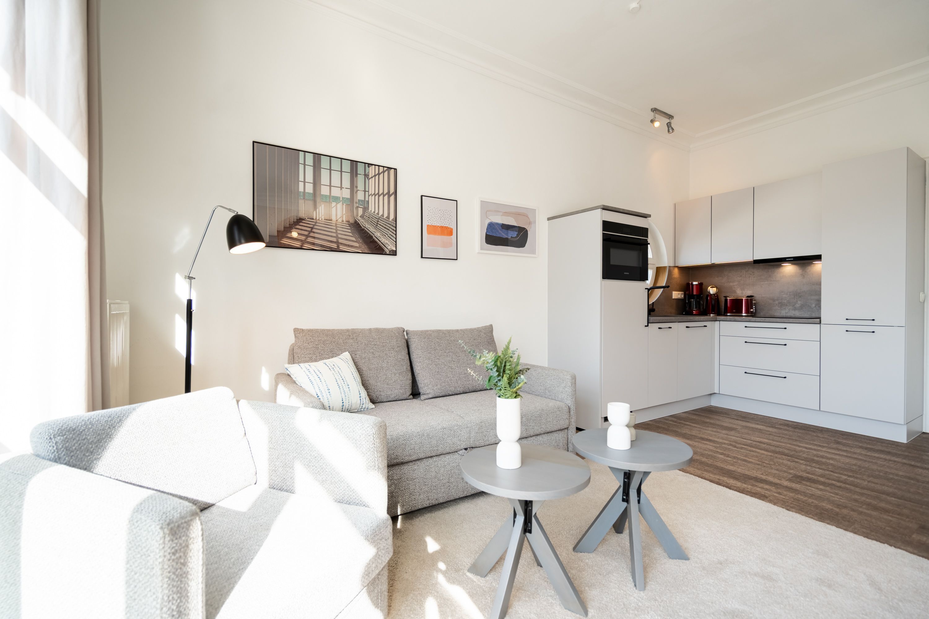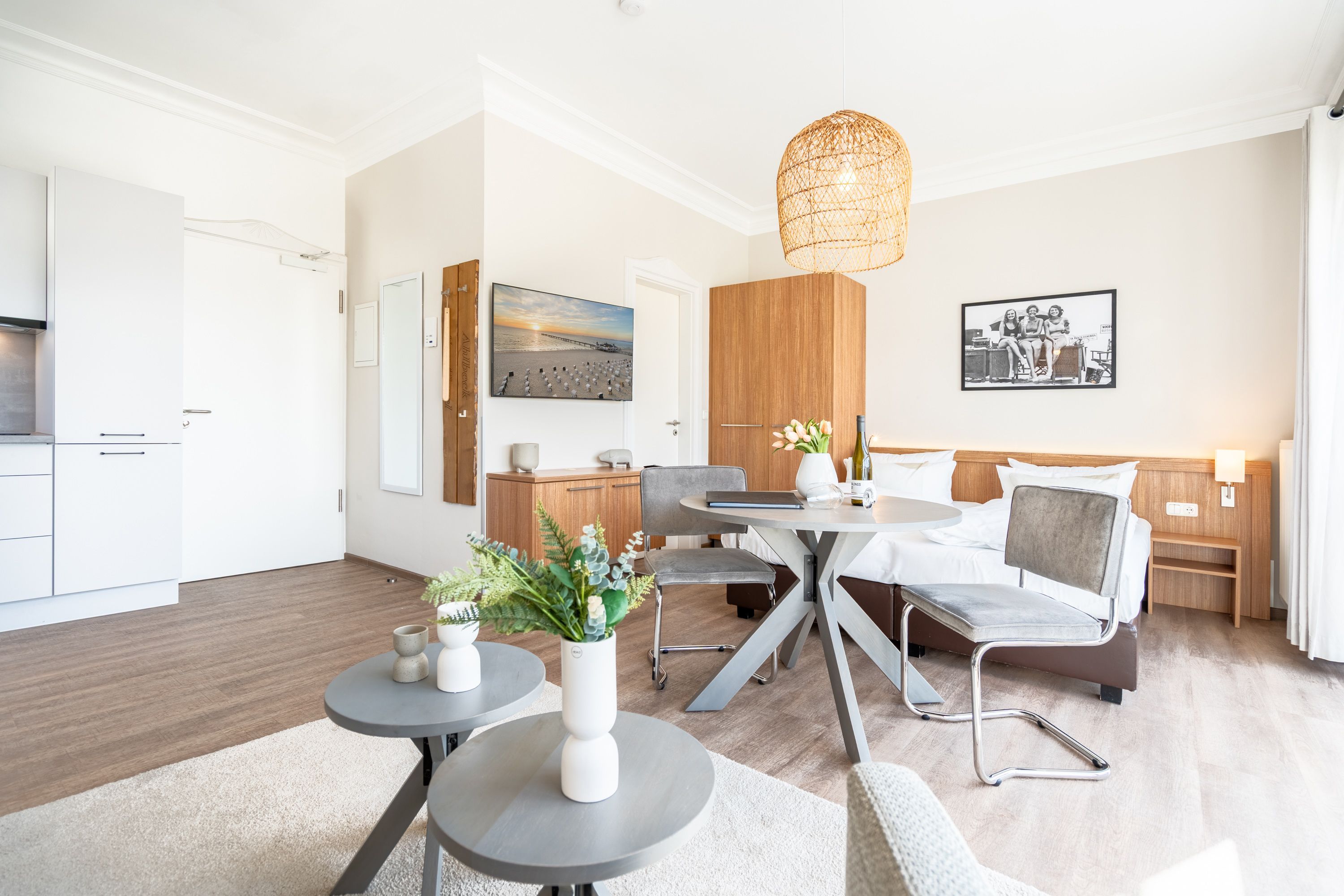 Die Villa Seedüwel überzeugt vor allem durch ihre außergewöhnliche Lage direkt an der Ahlbecker Seebrücke. Promenade, Strand und die historische Konzertmuschel als zentraler Treffpunkt für Veranstaltungen liegen praktisch vor der Tür. Der feinsandige Ostseestrand ist nur wenige Schritte entfernt. Auch das Umfeld passt: Restaurants, Cafés und Einkaufsmöglichkeiten befinden sich in unmittelbarer Nähe, teilweise sogar im Erdgeschoss des Hauses. Die Villa umfasst insgesamt 13 Ferienwohnungen mit einem bis drei Zimmern. Einige Apartments bieten einen direkten Blick auf die Seebrücke und die Ostsee. Für Ihren PKW steht ein Stellplatz in der Tiefgarage des benachbarten Hauses „Strandterrasse“ zur Verfügung (Zufahrt über die Kurstraße) mit direktem Zugang zur Villa. Ein Aufzug ist vorhanden, allerdings erst nach einigen Stufen im Eingangsbereich erreichbar. Zur Ausstattung gehören kostenfreies WLAN im gesamten Haus sowie ein abschließbarer Fahrradkeller. Zusätzlich können Sie im Nachbarhaus „Strandterrasse“ den Gemeinschaftswaschraum mit zwei Waschmaschinen und Trockner nutzen. Dort befindet sich auch eine Gemeinschaftssauna, die täglich von 11:00 bis 22:00 Uhr geöffnet ist.