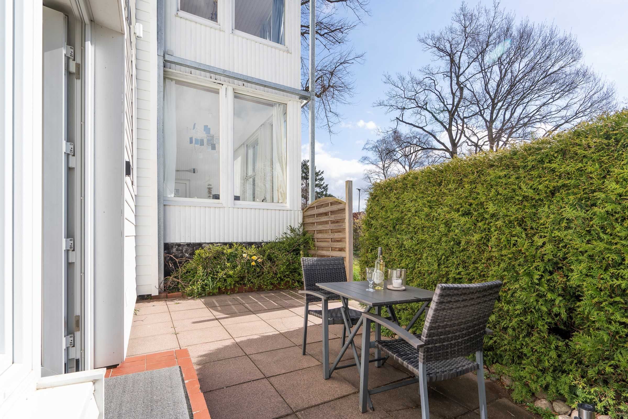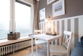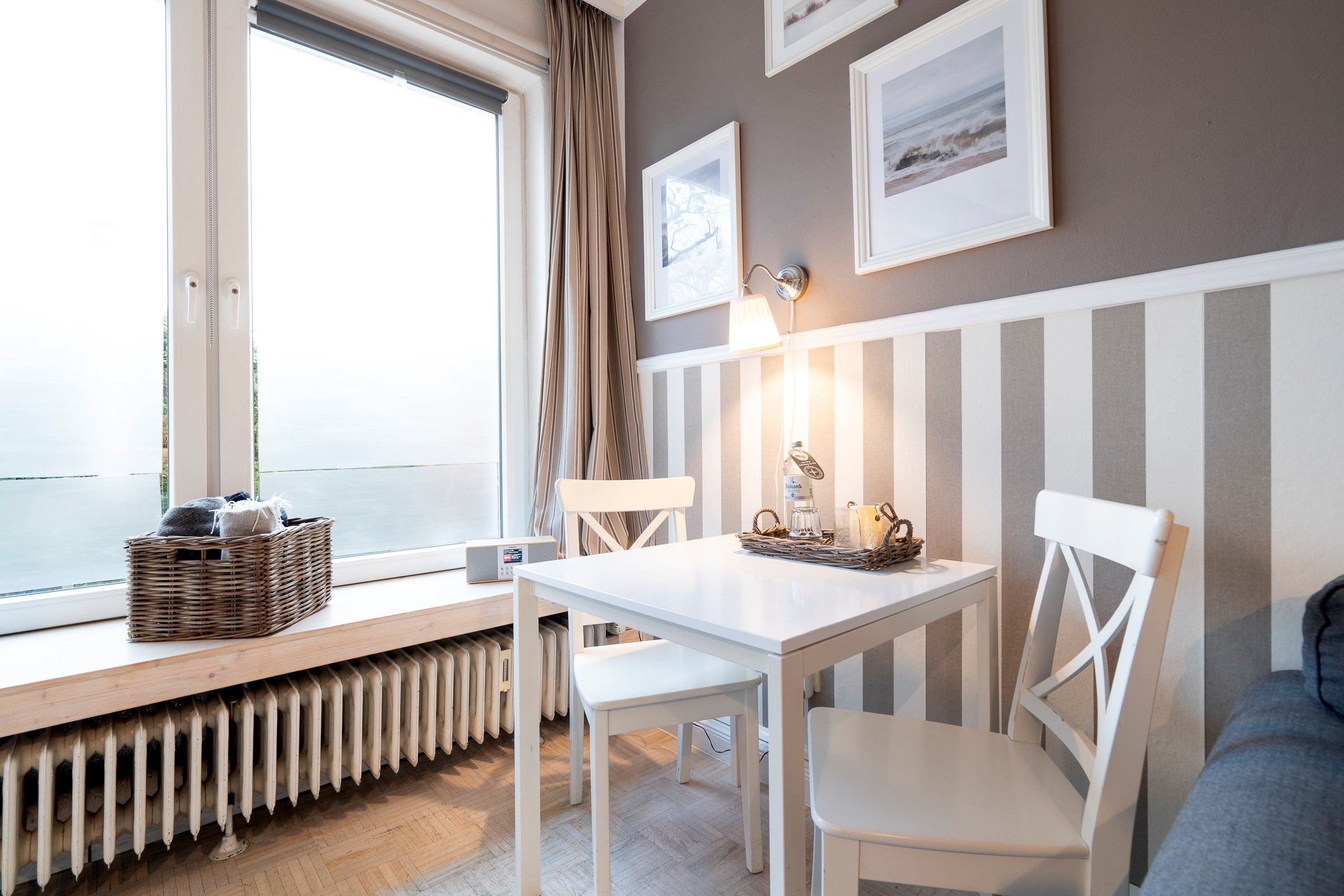 Die 1-Zimmer-Studio-Ferienwohnung ist im Winter 2023/24 neu renoviert und eingerichtet. Ob allein oder zu Zweit: hier finden unsere Gäste alles, was man braucht. Die Wohnung besteht aus einem Zimmer mit Küche, einem Vollbad und einer Terrasse mit Tisch und Stühlen. Es gibt ein 160 cm Doppelbett mit Strandpanorama, ein Sofa und einen Fernseher. In der Küchenecke finden sich neben einem 2-Platten-CeranKochfeld mit Mikrowelle und einem Kühlschrank mit Gefrierfach auch ein Wasserkocher und eine Kaffeemaschine. Es sind ausreichend Geschirr, Töpfe und Pfannen für 2 Personen vorhanden. Eine eigene Terrasse mit Tisch und Stühlen gehört auch zu der Wohnung.