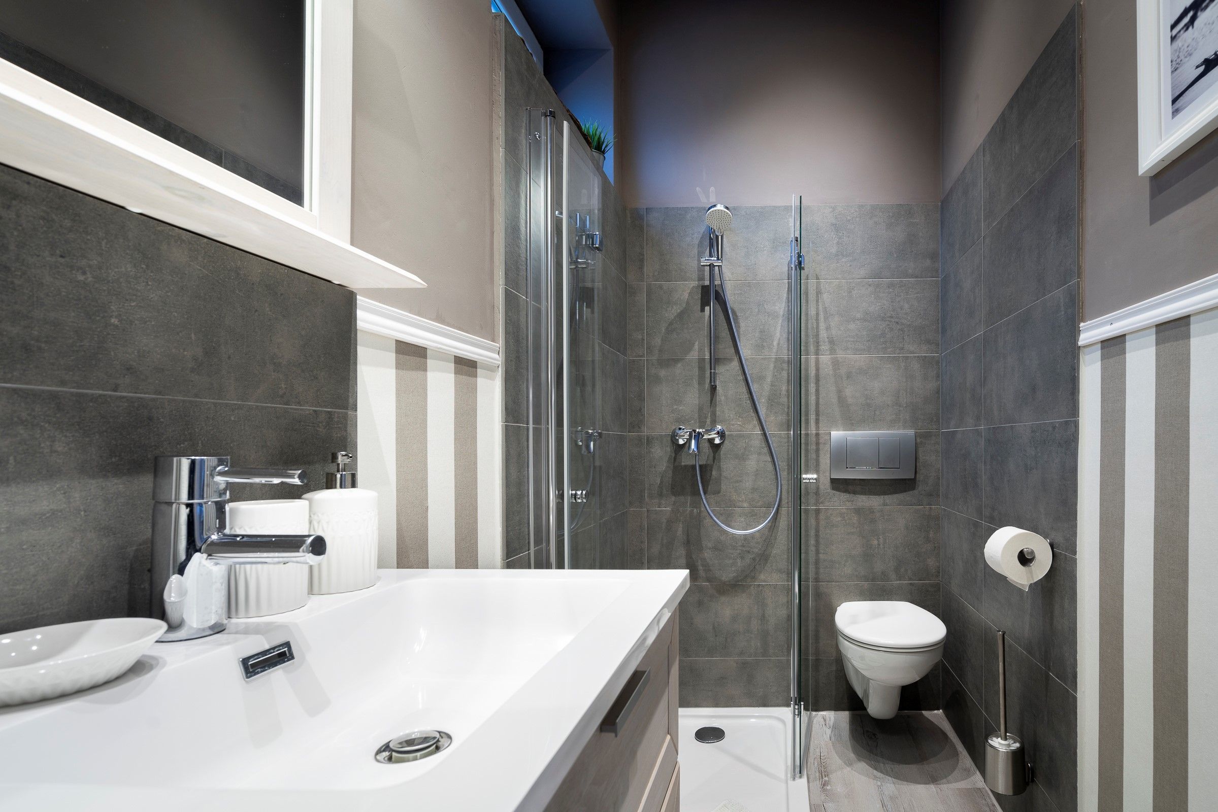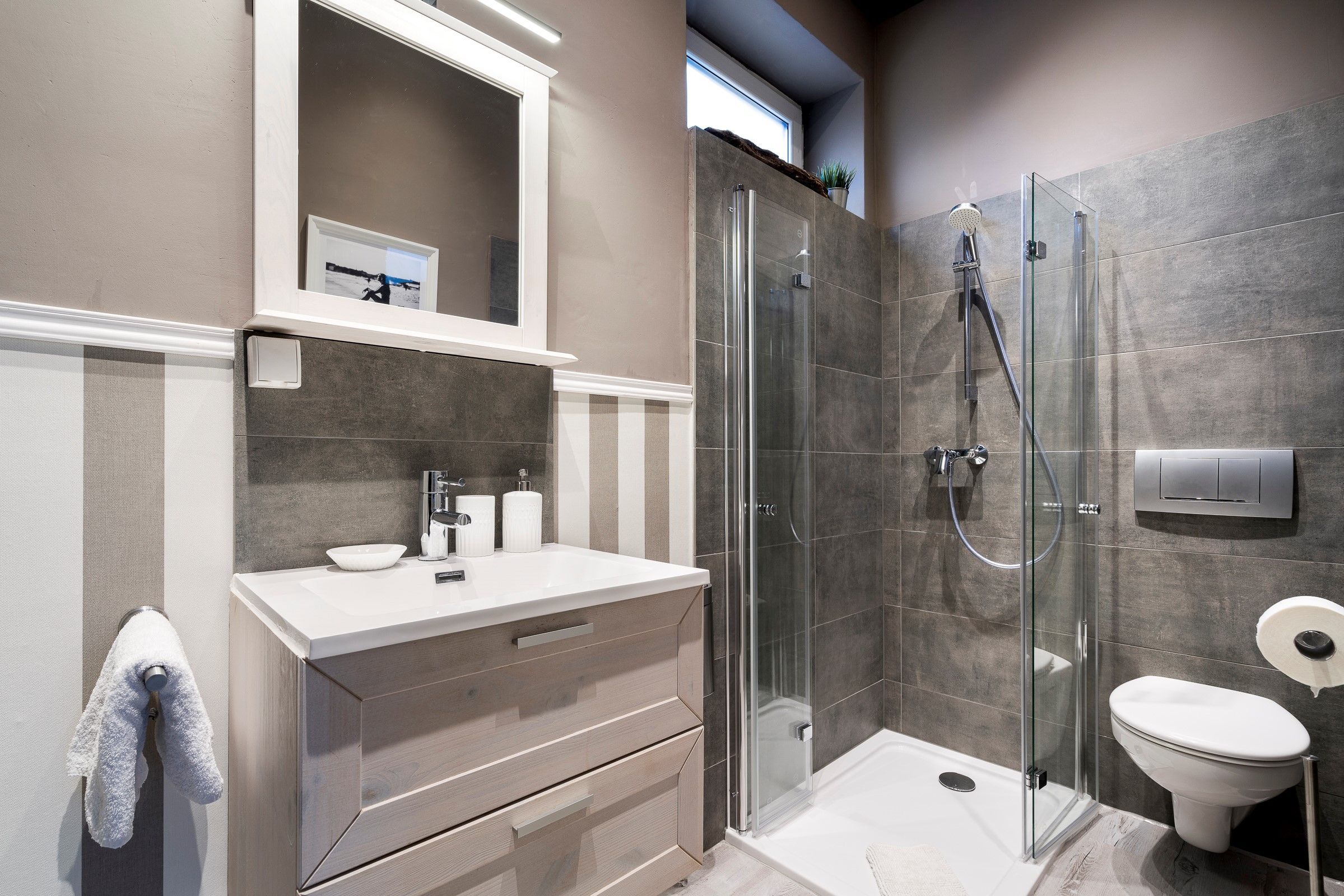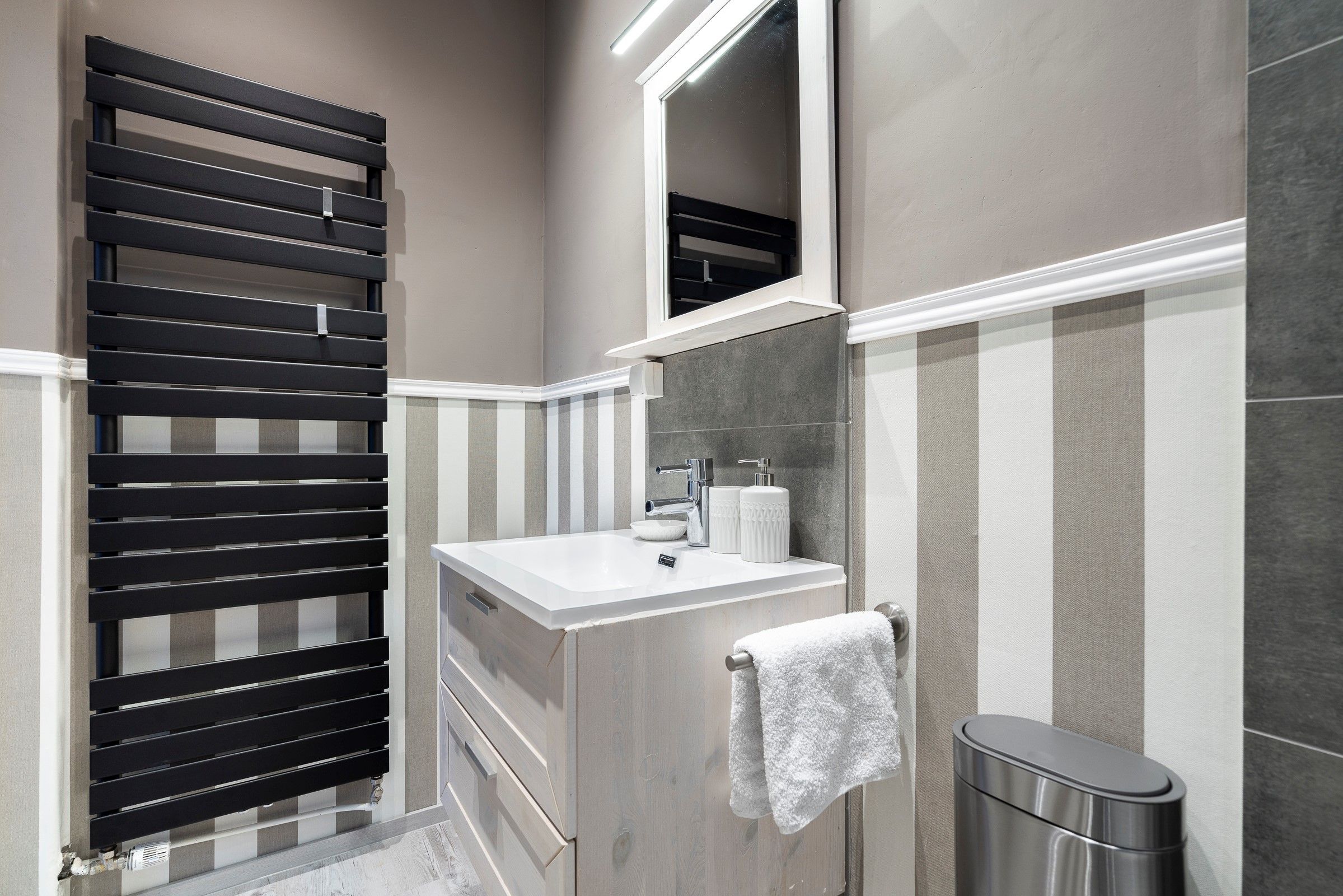Das Bad hat eine Badewanne mit Spritzschutz zum Duschen und einen großen Handtuch-Heizkörper. Mit hochwertigem Hänge-WC. Der Waschtisch ist aus Porzellan und Echtholz-Schrank mit einer Schublade mit Steckdose und einem Föhn.