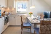 Die moderne und gut ausgestattete Küche grenzt direkt an den einladenden Essbereich, der Platz für drei Personen bietet und die gemütliche Sofaecke mit Sessel, Leselampe, TV und Stereo-Anlage.