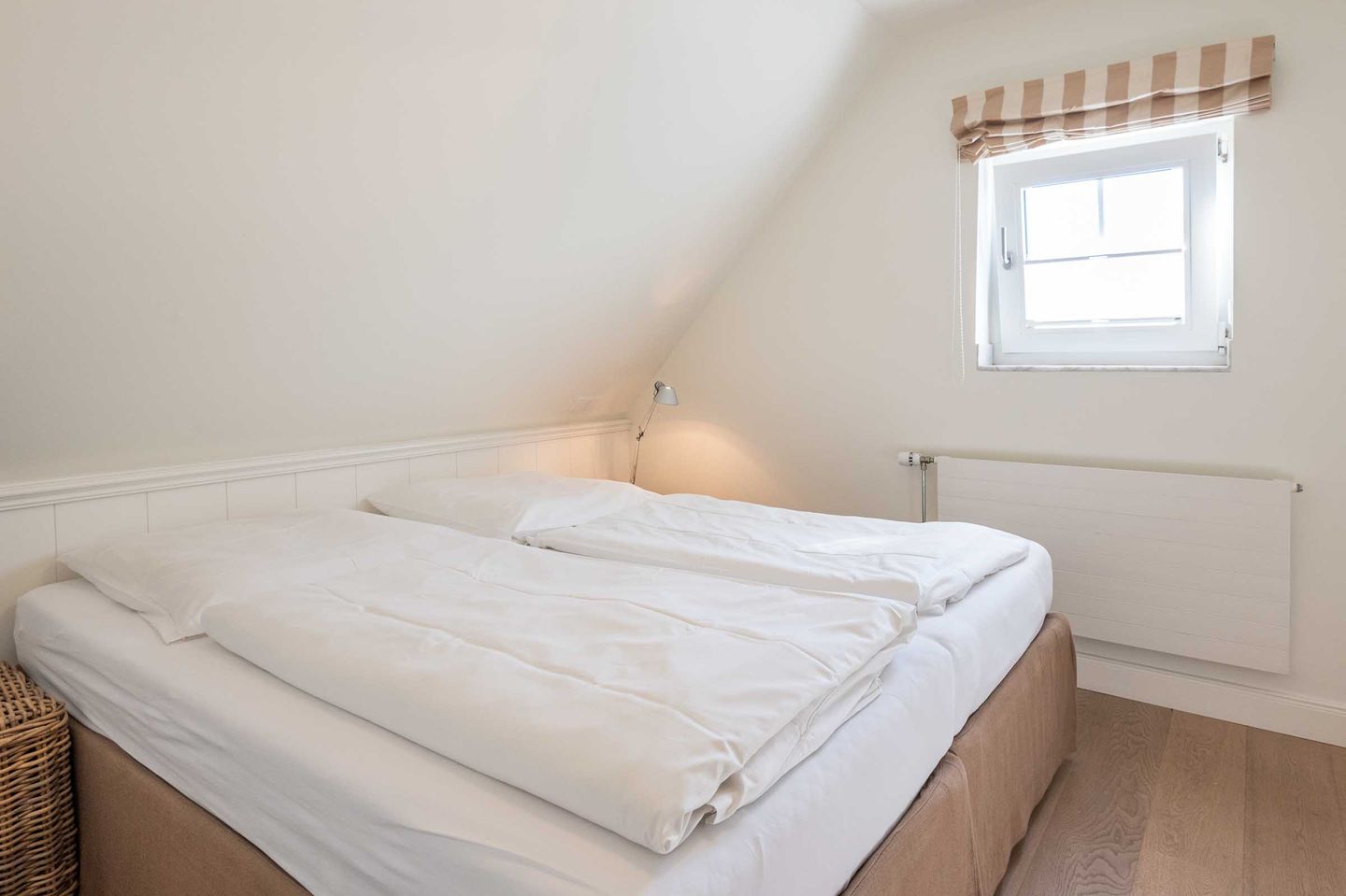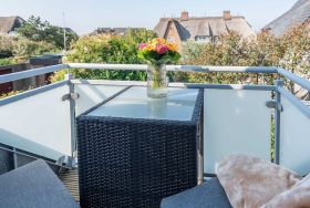 Von hier gelangen Sie auf den kleinen und möblierten West-Balkon, von dem Sie freien Blick auf den grünen Garten und die umliegenden Reetdachhäuser haben.