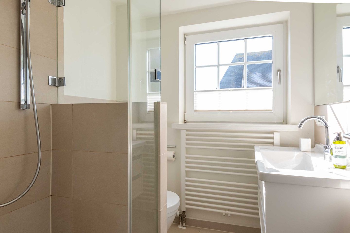 Badezimmer: Kleines und helles Bad mit bodentiefer Dusche, Waschbecken, Handtuchtrockner und Fenster.