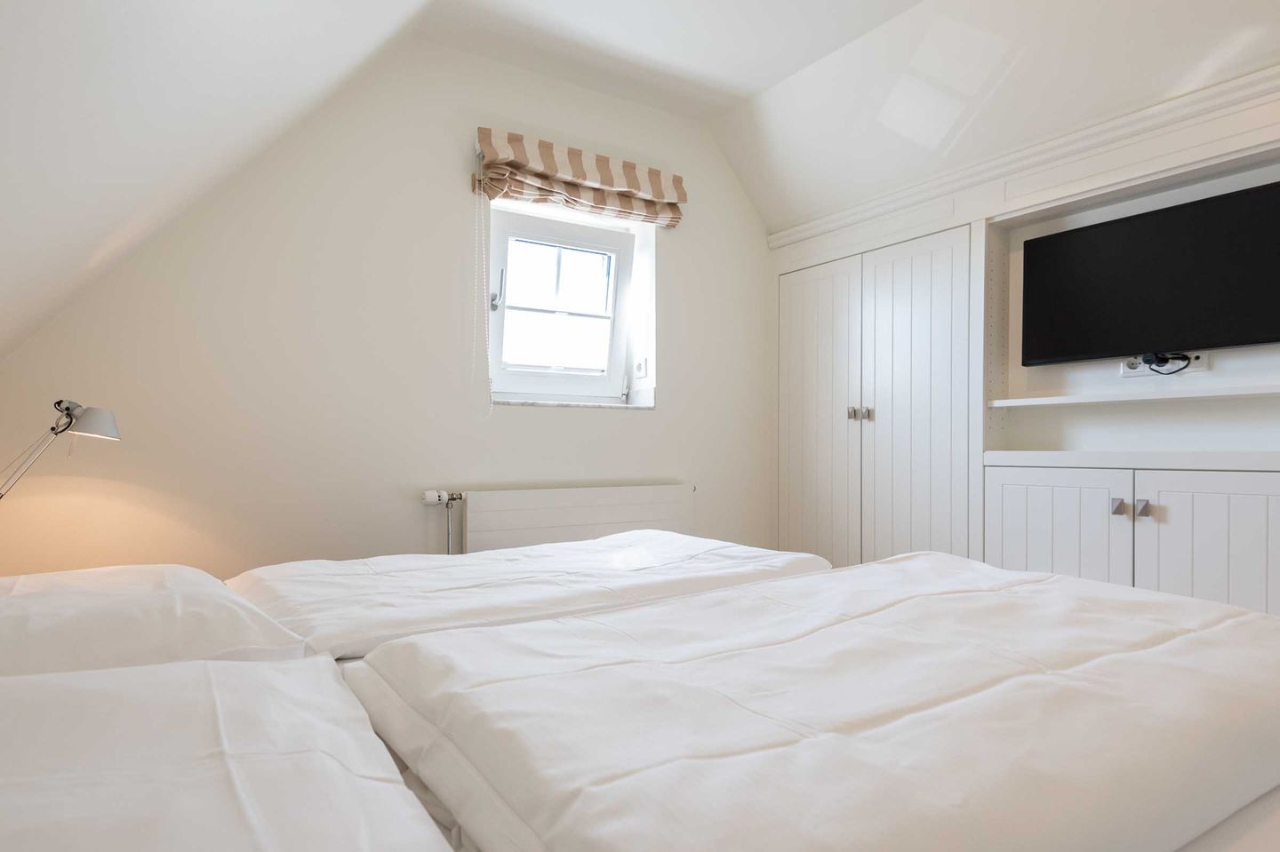 Schlafzimmer 1: Einzelbett (100 x 200 cm), TV, Einbauschrank und kleinem Schreibbereich, der auch das mobile Arbeiten aus dem Urlaub ermöglicht.