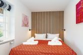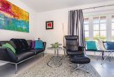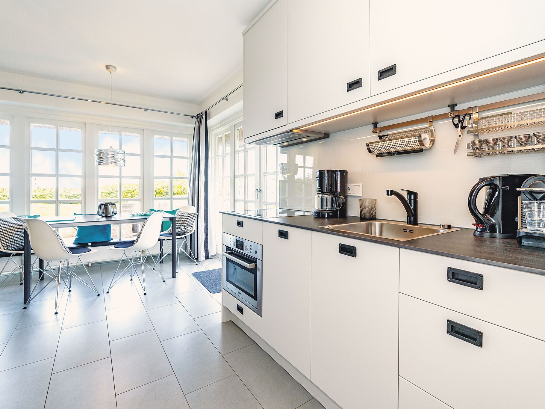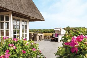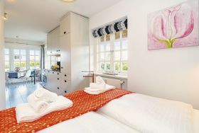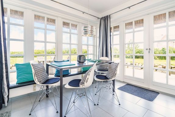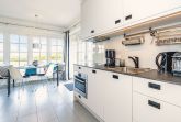Unser Käpt´n Cook 1 in der Kurhausstraße erstrahlt nun in noch frischerem Glanz. Sie betreten dieses Quartier im Erdgeschoss, wo neben einem kleinen Duschbad gleich gegenüber der offene WohnEssbereich folgt. Um den Esstisch vor der großen Fensterfront stehen klassische Eameschairs, von hier und der großen Terrasse hat man einen tollen Weit- und Meerblick bis zum Quermarkenfeuer. Die traumhaften Sylter Sonnenuntergänge kann man von hier zu jeder Jahreszeit genießen. Vor dem Kamin finden Sie einen Relaxsessel und ein ganz besonderes Sofa, ein wahres Verwandlungswunder - mal Longchair, mal Sofa. Hier lässt sich jede Wetterlage gut verbringen. Nun kann man auch im wahrsten Sinne des Wortes ganz urlaubslike im Bett frühstücken und das Meer sehen, denn ein offenes Doppelschlafzimmer schließt direkt an die voll ausgestattete Küchenzeile an. Die Wendeltreppe hinab erwarten Sie ein Einzel- und ein Doppelschlafzimmer, sowie ein weiteres schönes Duschbad. Alles hier ist ansprechend hell und wohnlich mit kleinen Farbakzenten gestaltet.