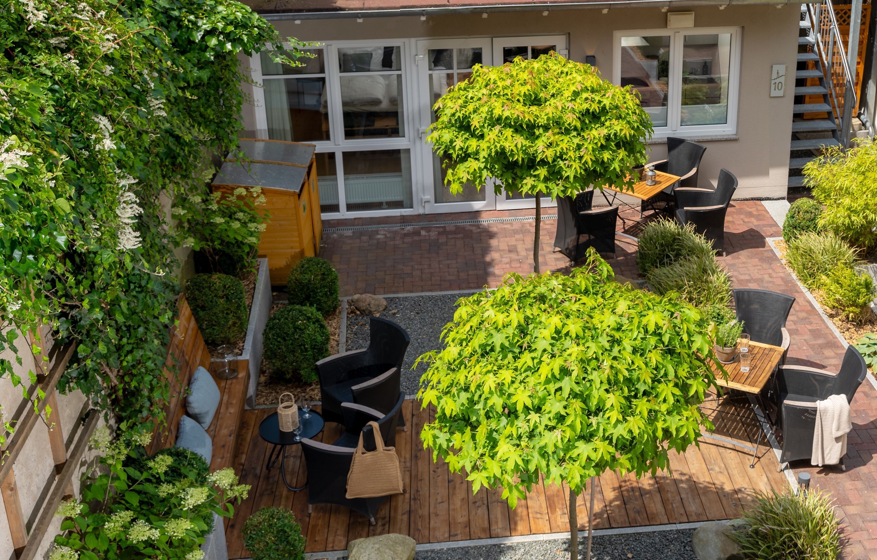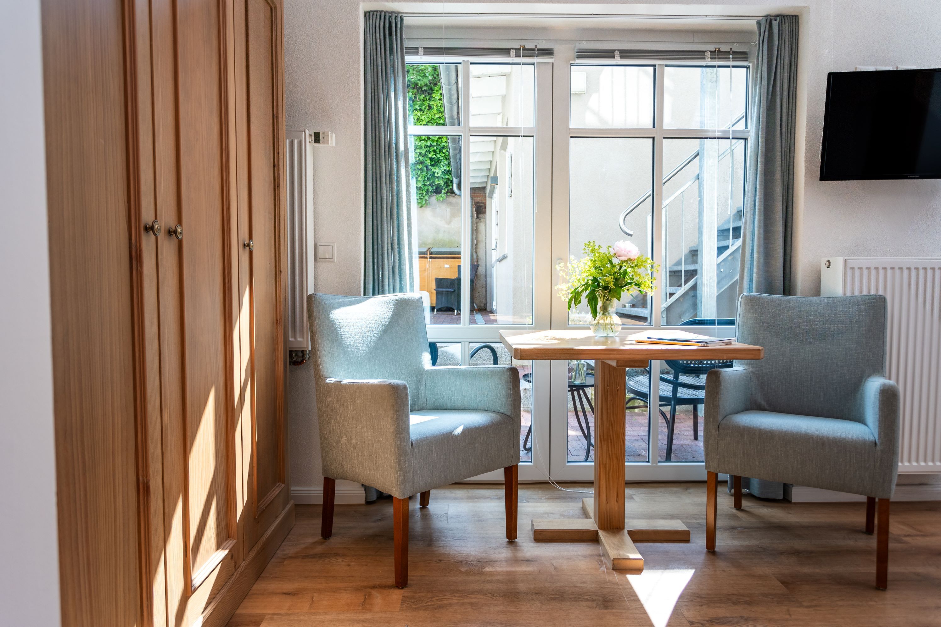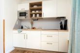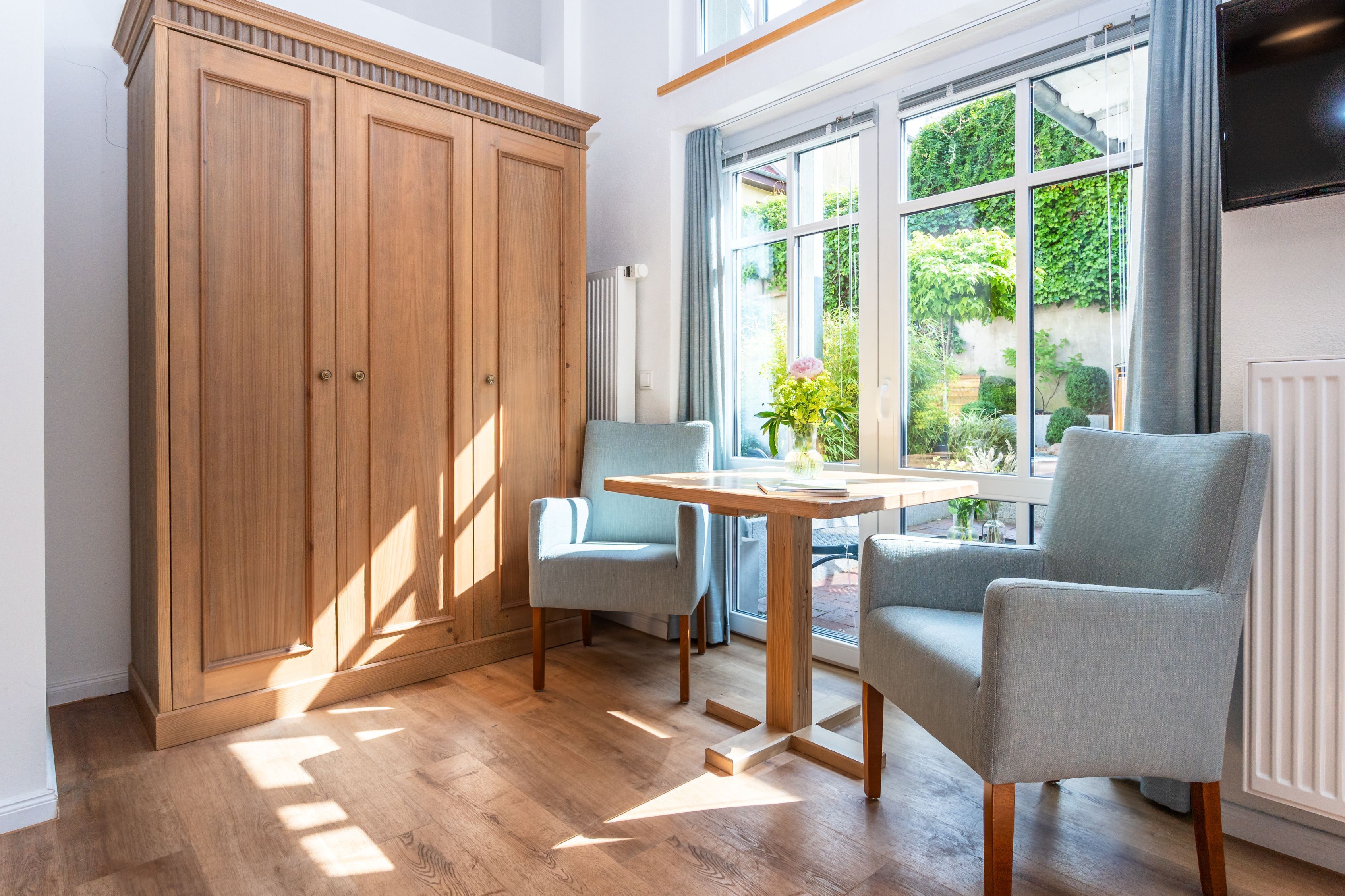 Unsere modernen 1-Raum-Apartments Classic befinden sich im Erdgeschoss mit Zugang über unseren Innenhof. Zur Ausstattung gehören ein komfortables Boxspringbett, eine kleine Sitzecke mit Tisch, eine praktische Küchenzeile und ein Badezimmer mit Dusche und WC.