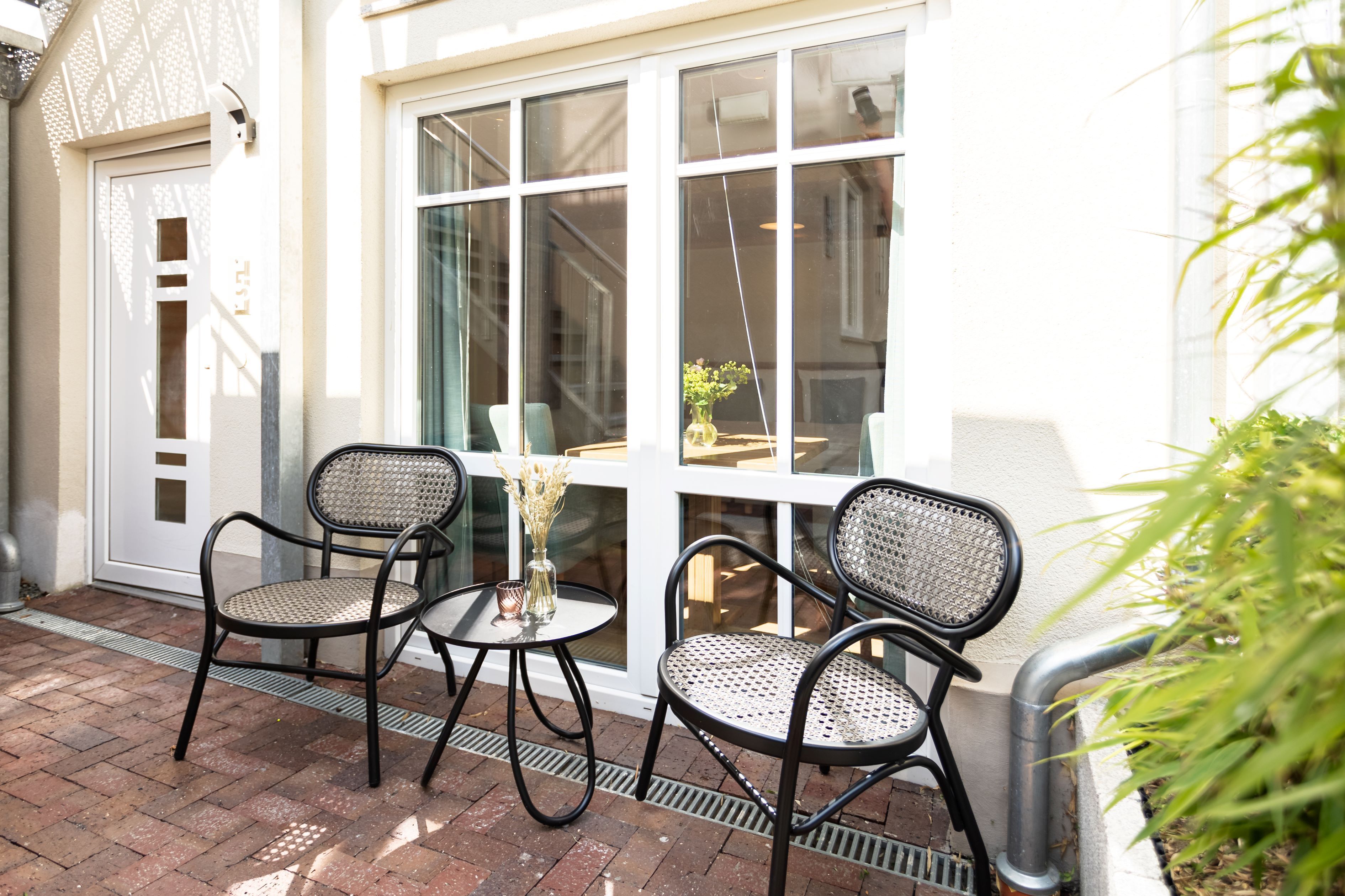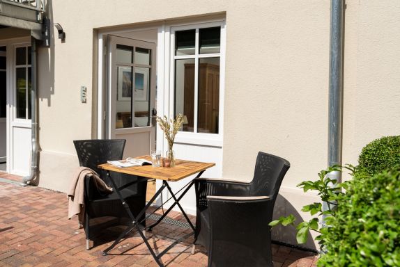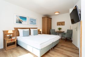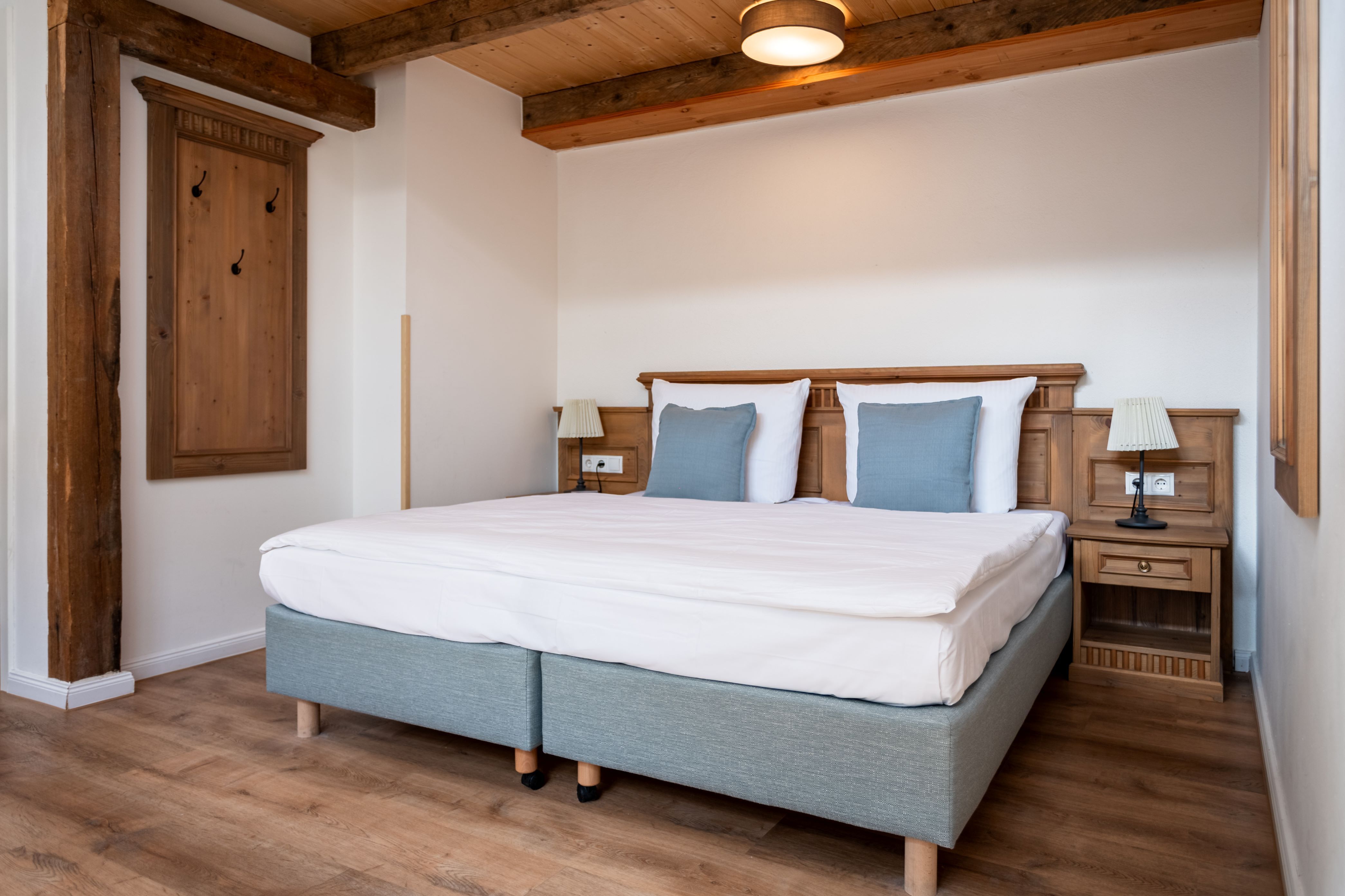 Unsere modernen 1-Raum-Apartments Classic befinden sich im Erdgeschoss mit Zugang über unseren Innenhof. Zur Ausstattung gehören ein komfortables Boxspringbett, eine kleine Sitzecke mit Tisch, eine praktische Küchenzeile und ein Badezimmer mit Dusche und WC.