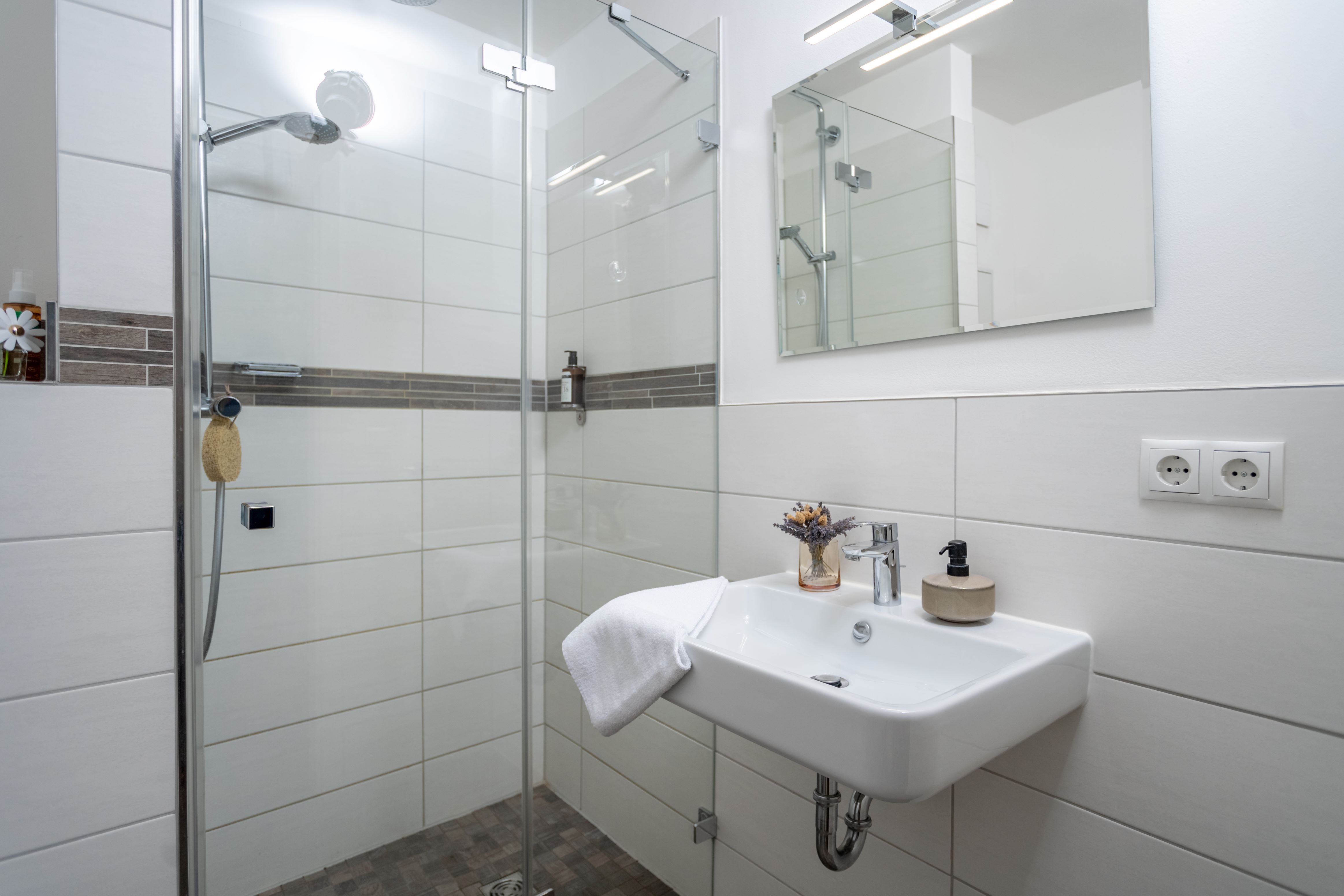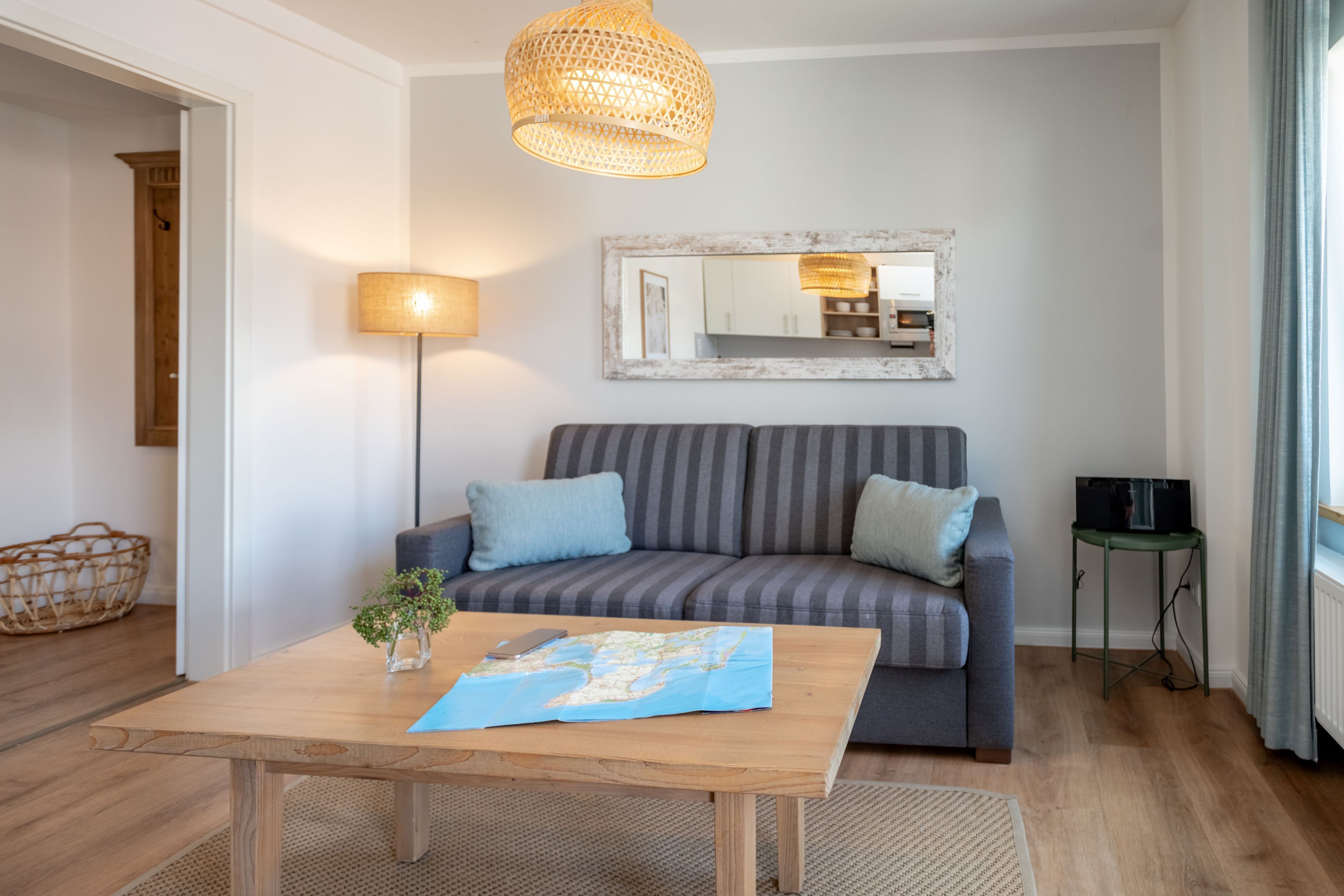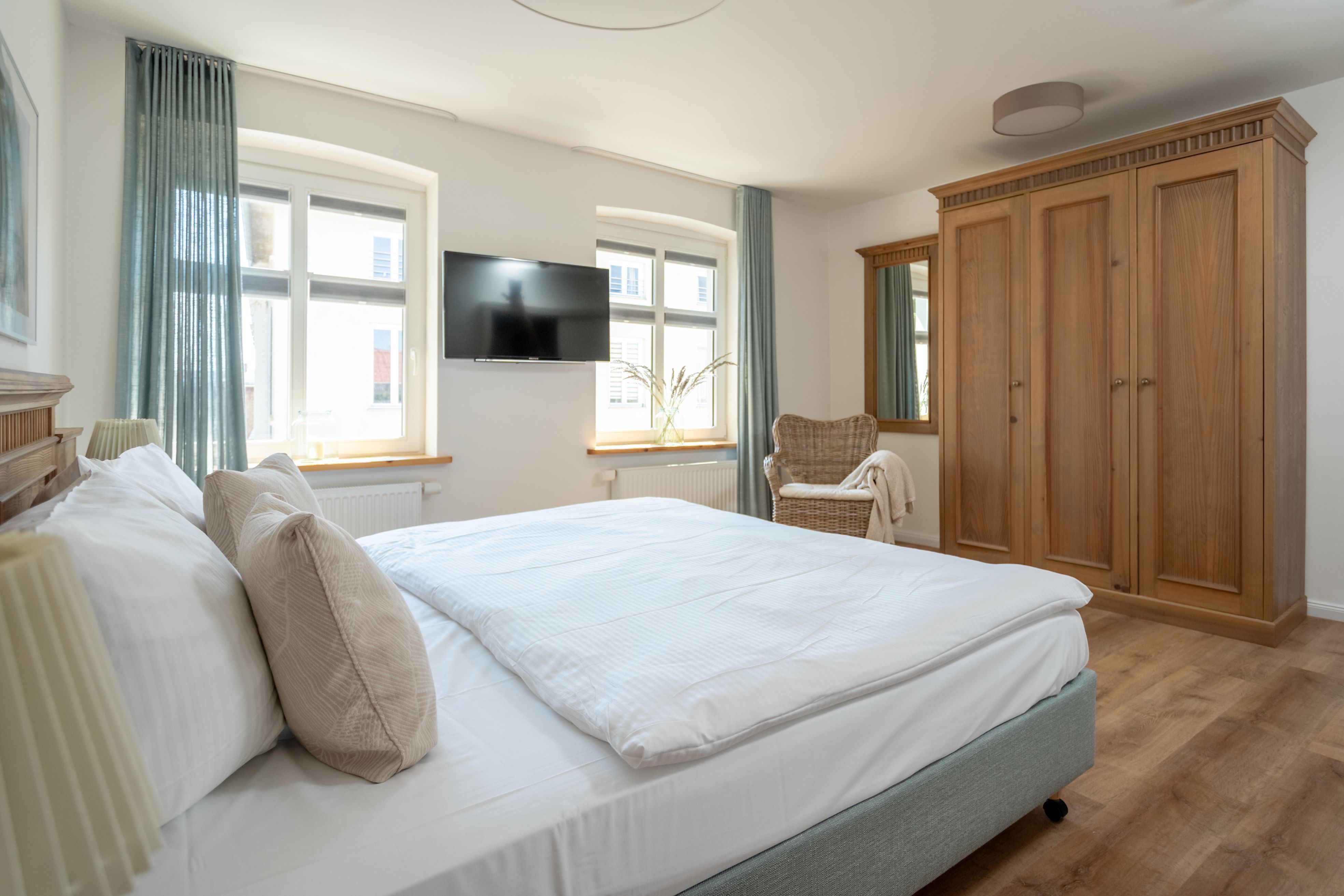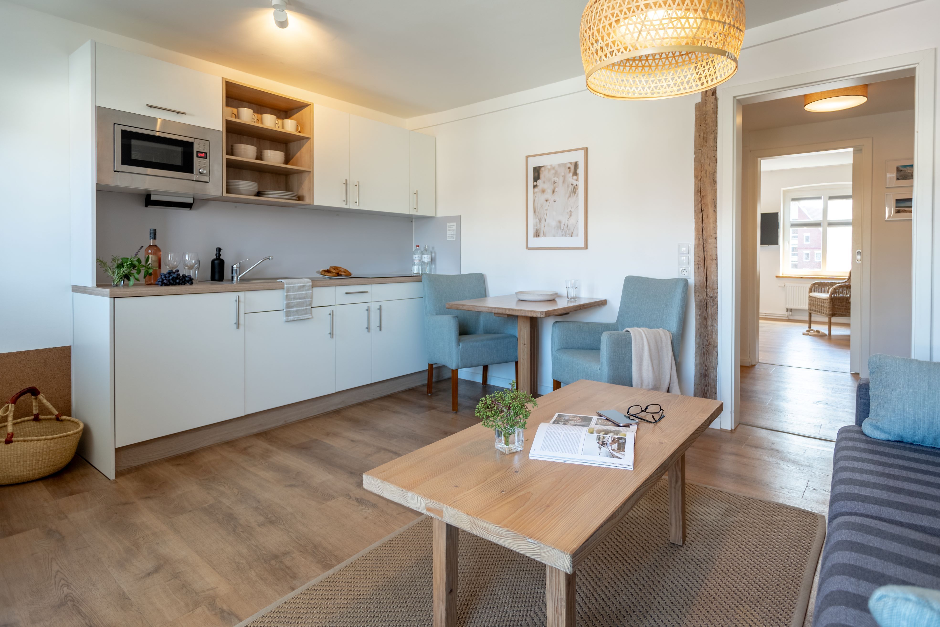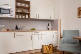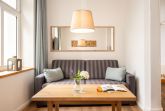 Unsere modernen Zwei-Raum-Apartments Classic befinden sich im Erdgeschoss sowie im 1. und 2. Obergeschoss. Zur Ausstattung gehören ein komfortables Boxspringbett in einem separaten Schlafzimmer, eine gemütliche Sitzecke mit Esstisch und Schlafcouch, eine praktische Küchenzeile und ein Badezimmer mit Dusche.