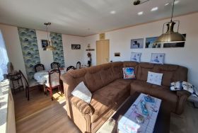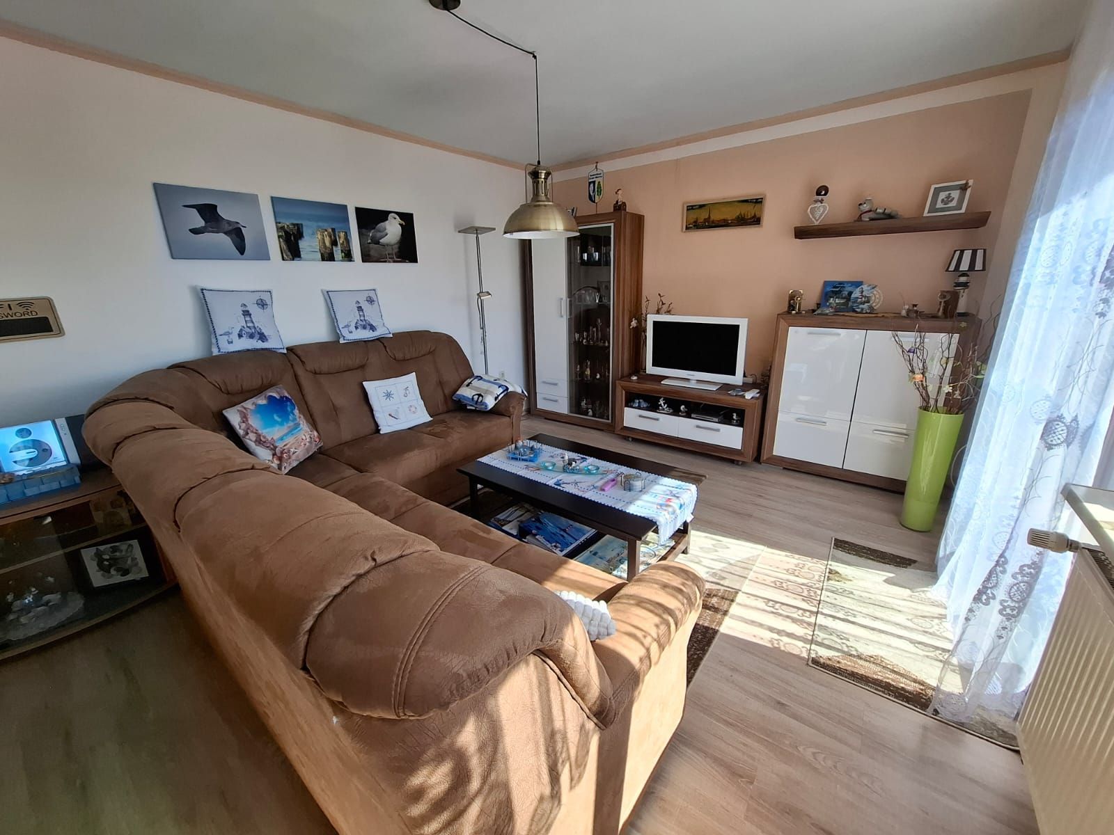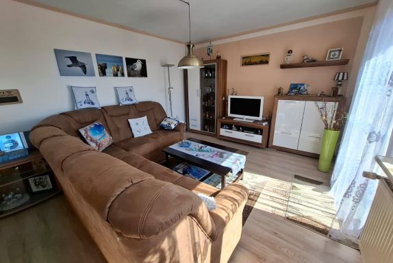 • Wohnzimmer: Schlafcouch mit 140x200 cm, TV-Flachbild, Anbauwand, Tisch, Leselampe, CD-Radio, Uhr, direkter Zugang zur Terrasse