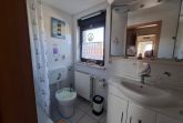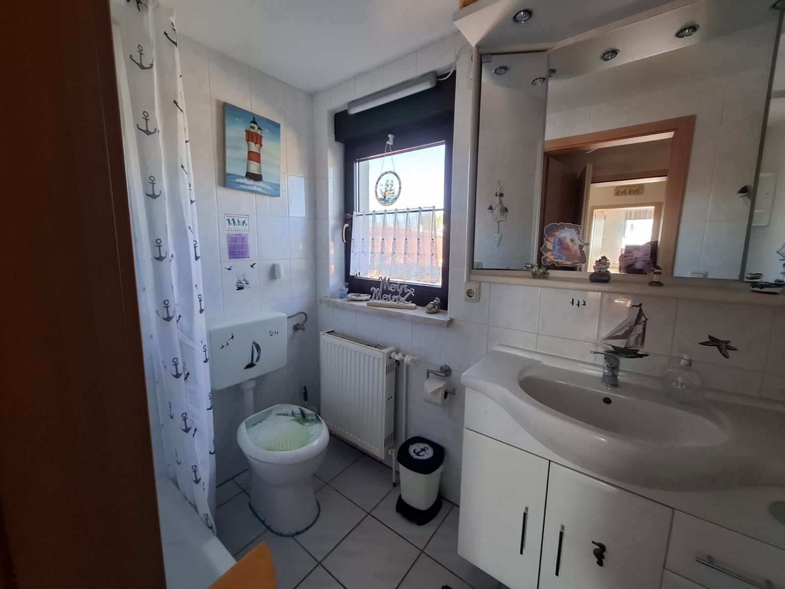 • Bad: mit Fenster, kleines Bad, Dusche mit Vorhang, Waschbecken, Toilette, Spiegelschrank, Schrank