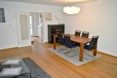 Wohnzimmer: 2 Stehlampen, 6 Stühle, Anrichte, Couch, Couchtisch, Esstisch, Flachbildschirm, Hocker, Sessel, Smart TV, TV-Unterschrank