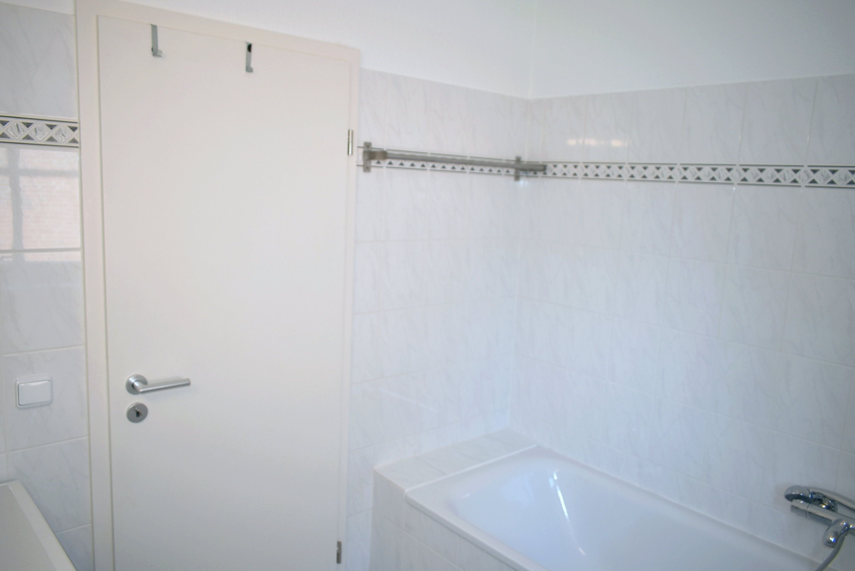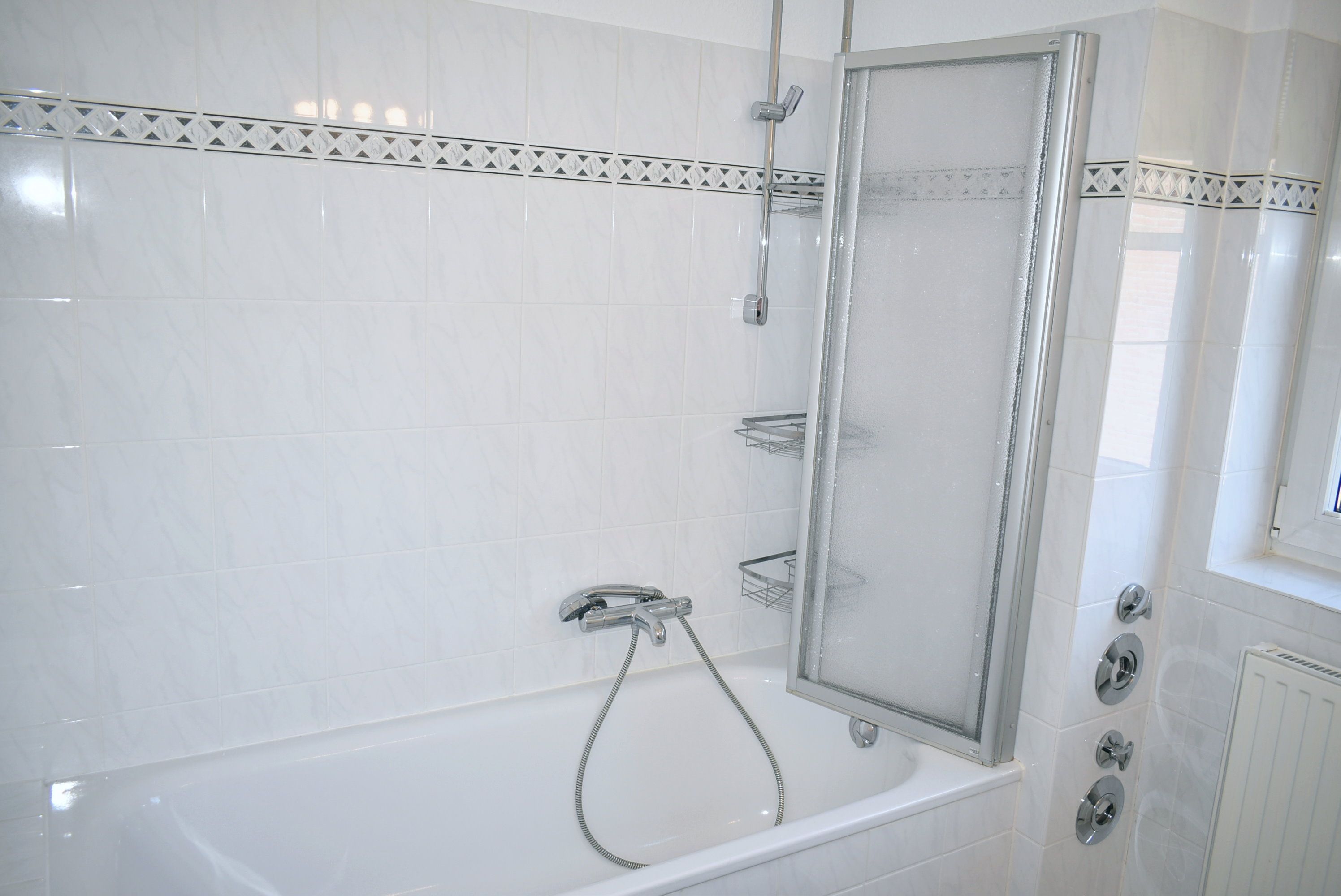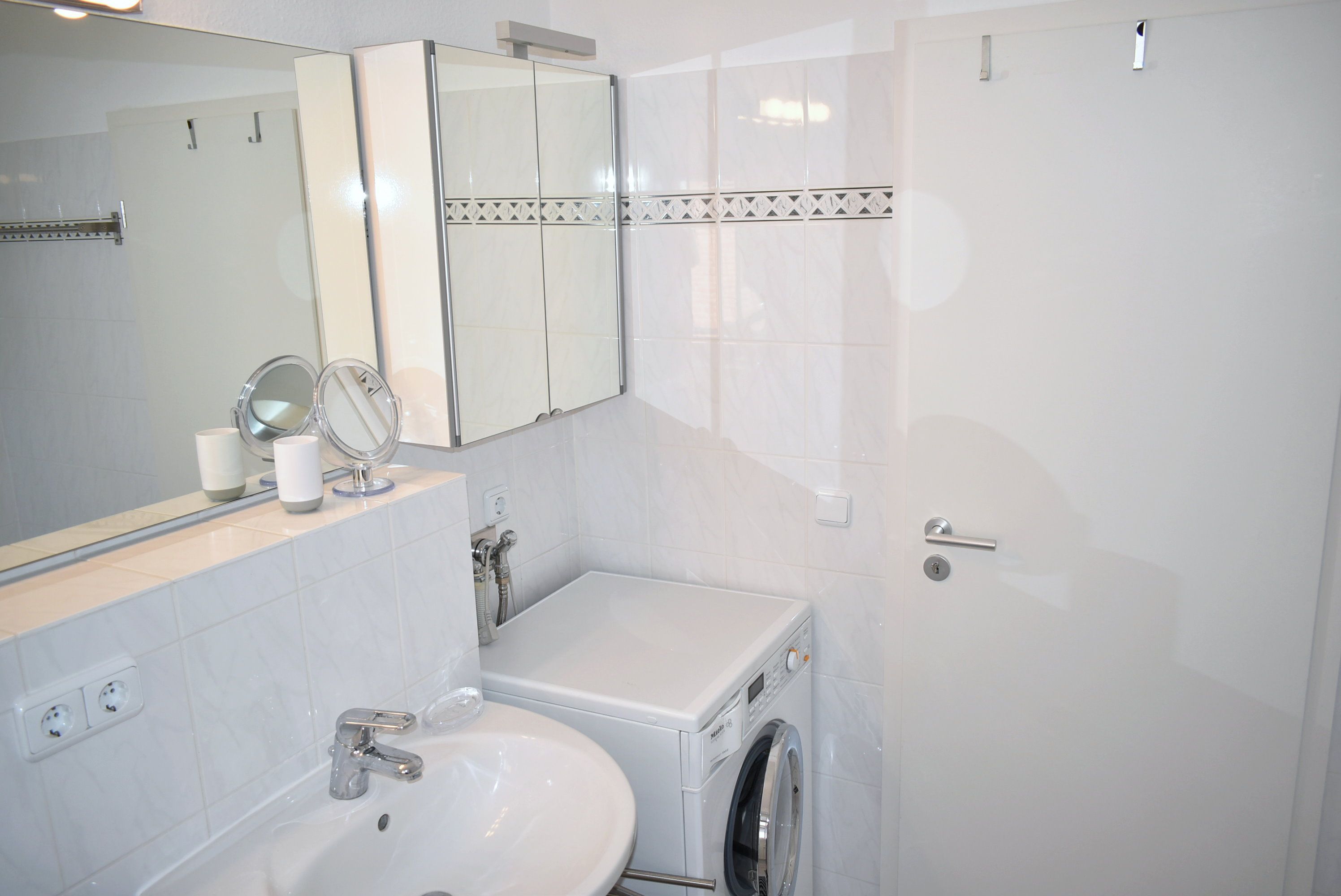 Bad 1: Badewanne, Duschwand, Hängeschrank, Spiegel, Waschbecken, Waschtrockner, WC
