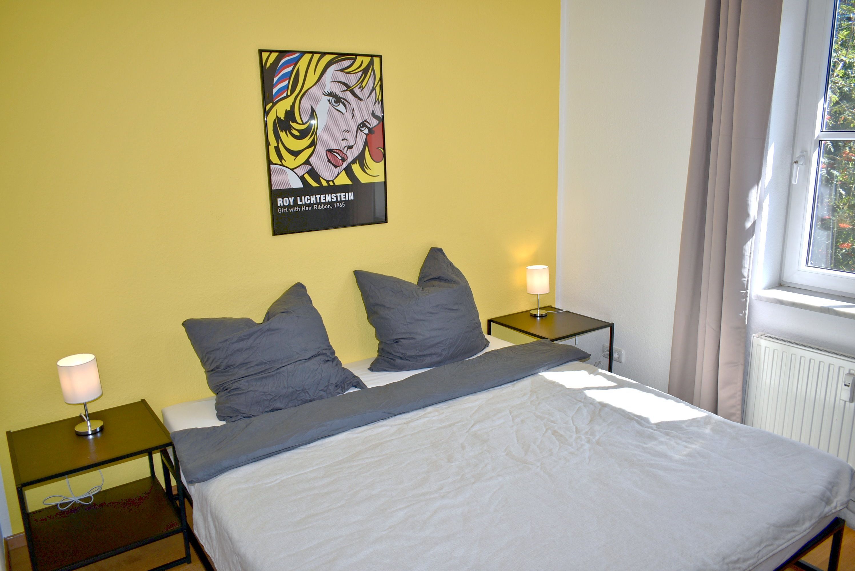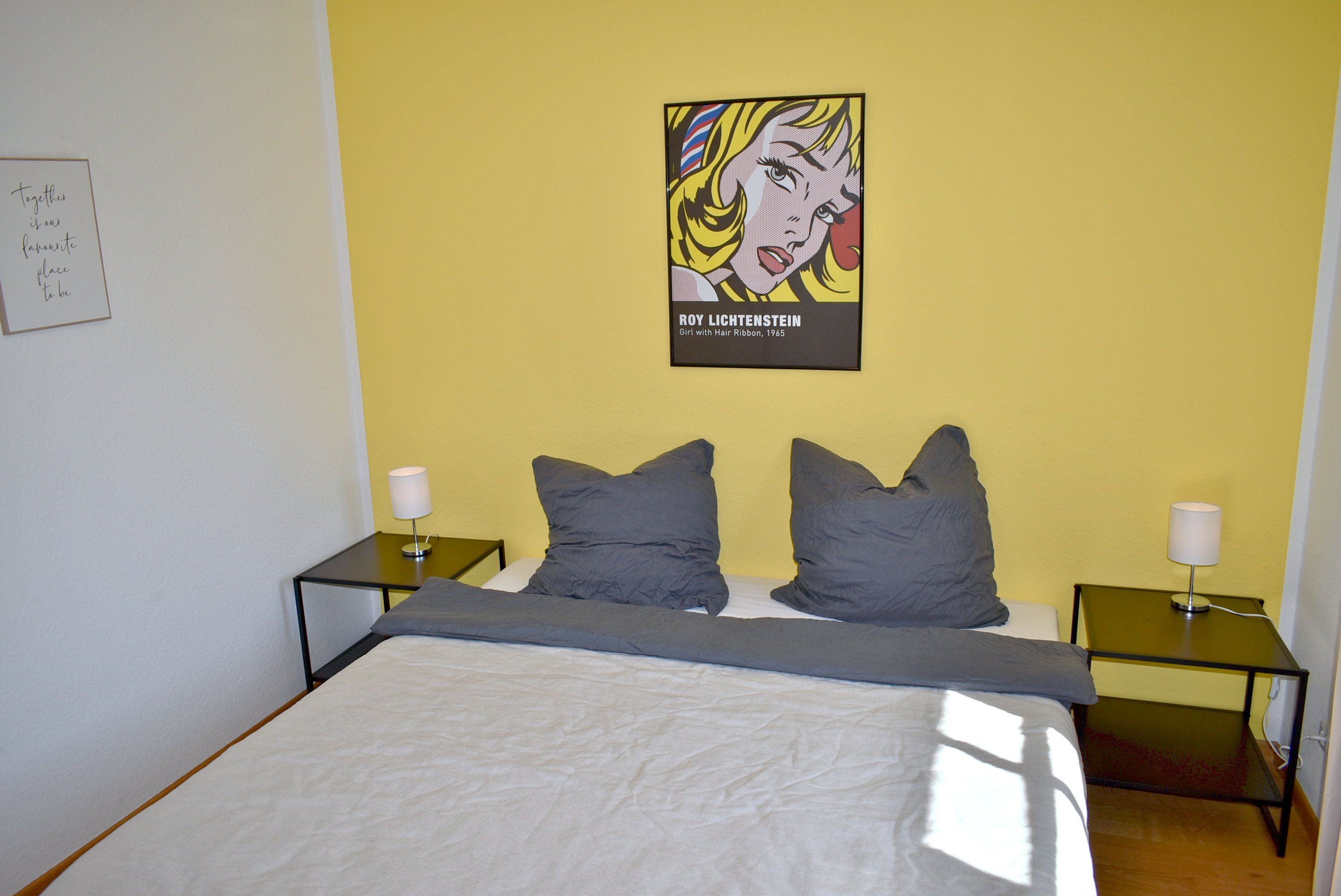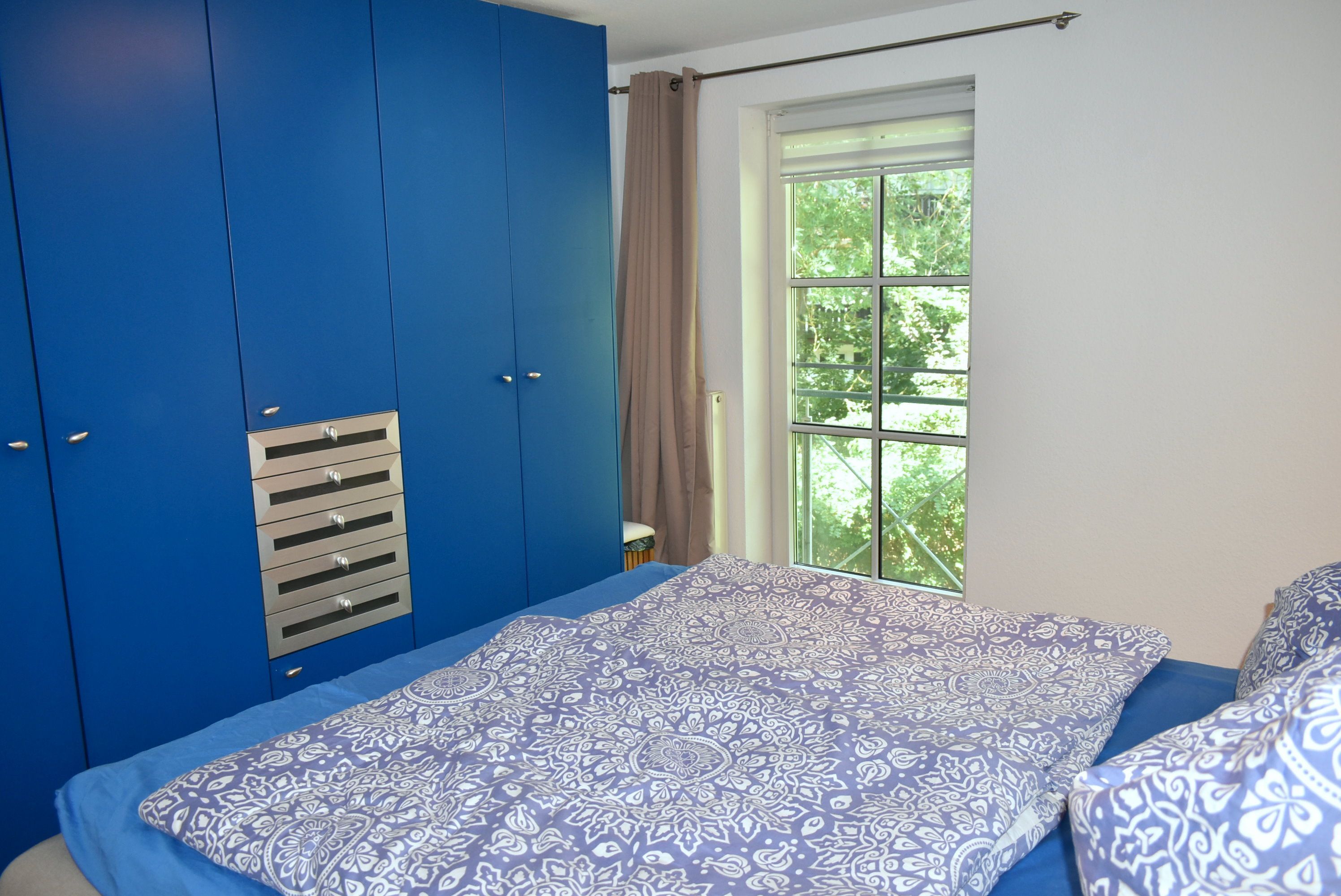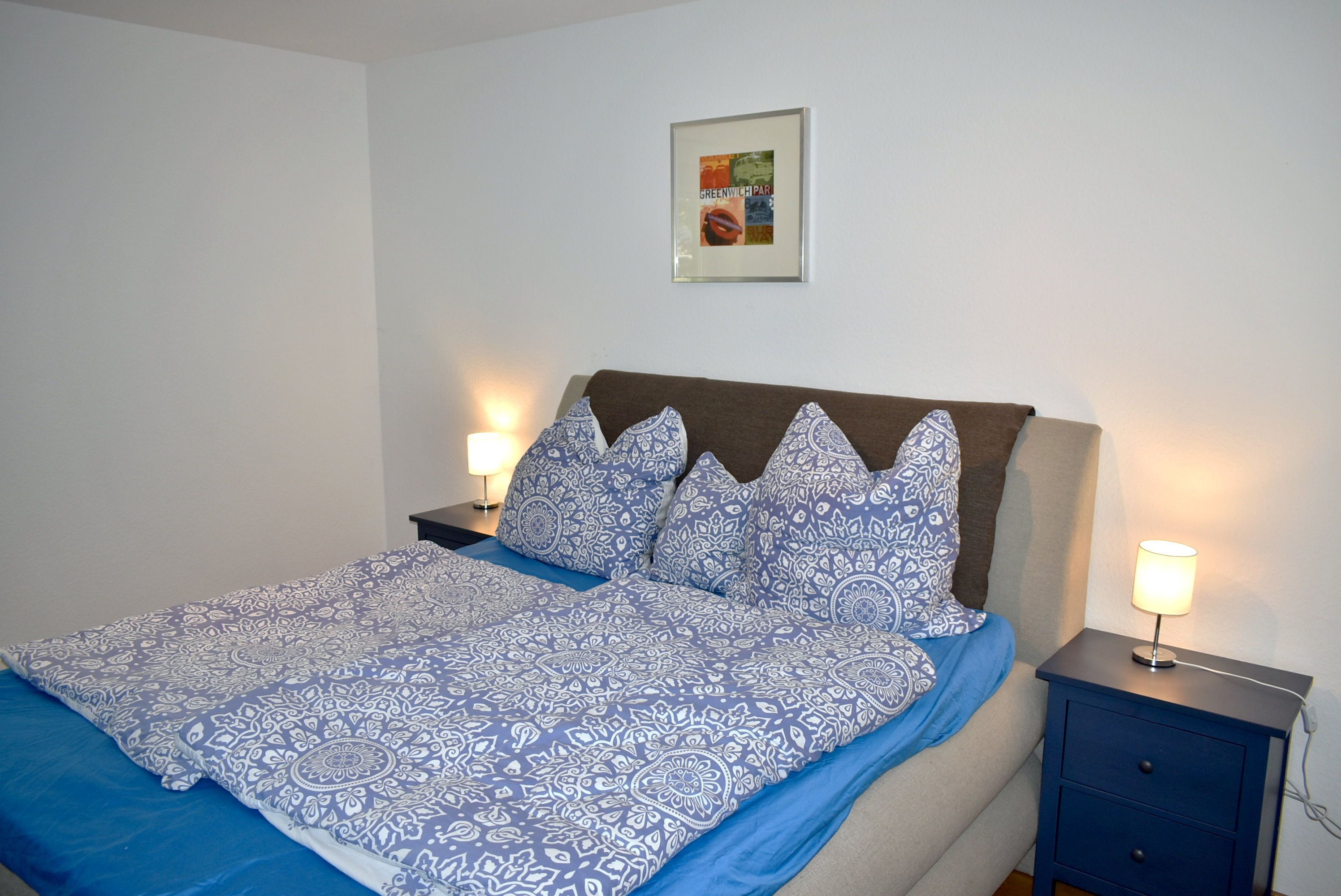 Schlafzimmer 1: 1 Topper 2,00 x 1,80m, 2 Nachttische, Boxspringbett 2,00 x 1,80 m, Fliegenschutzgitter, Hocker, Kleiderschrank