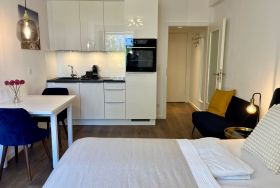Diese perfekt ausgestattete Wohnung bietet alles, was Sie für einen entspannten Urlaub benötigen. Der offene Wohn- und Schlafbereich schafft eine gemütliche Atmosphäre. Das komfortable Bett (160x200 cm), ein praktisches Sideboard und ein geräumiger Kleiderschrank sorgen dafür, dass Sie sich rundum wohlfühlen. Am Esstisch für 2-3 Personen können Sie ihre Mahlzeiten in entspannter Umgebung genießen. Die moderne Küche ist komplett ausgestattet und bietet alles, was Sie zum Kochen brauchen.