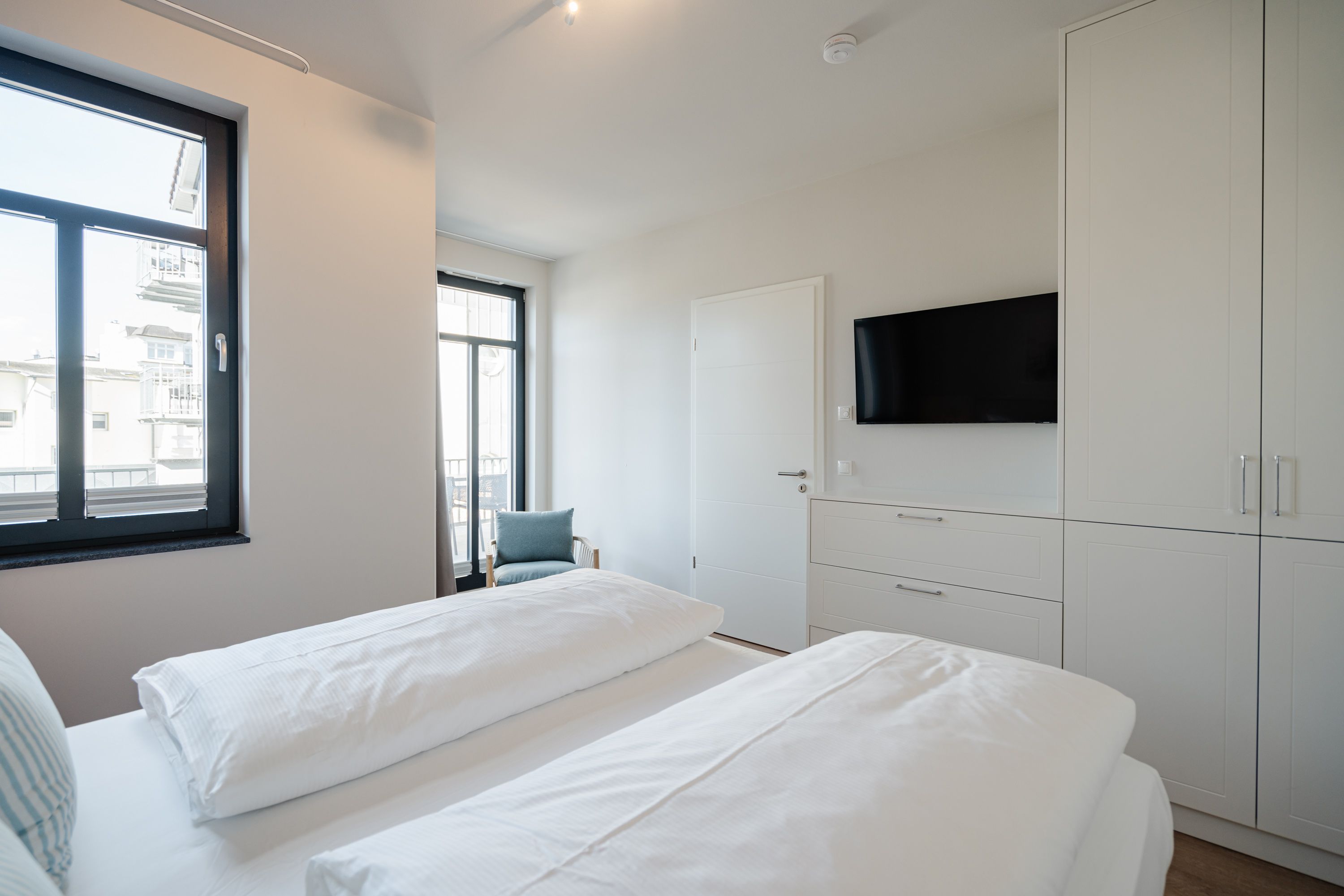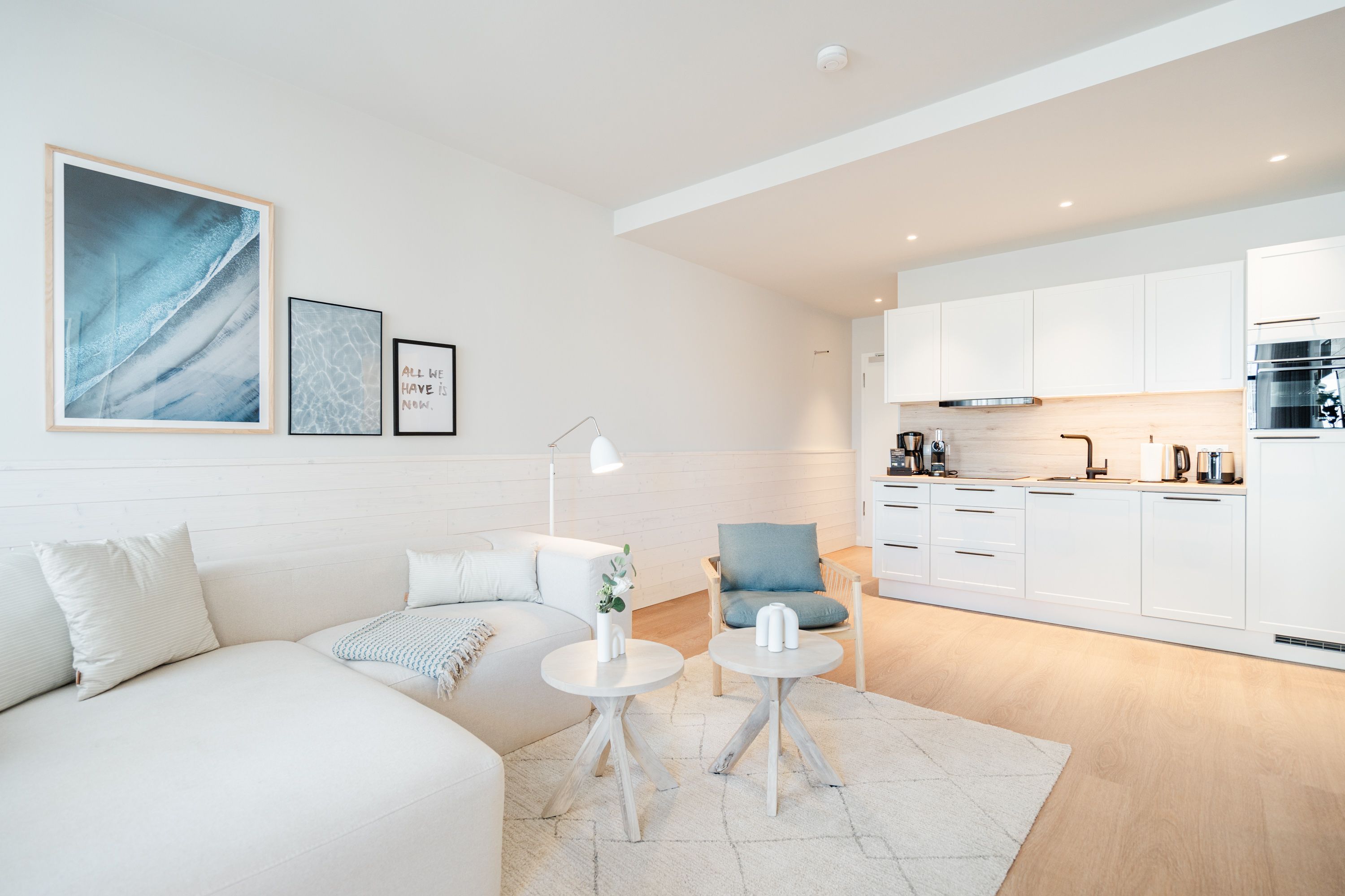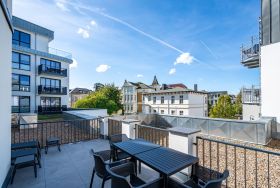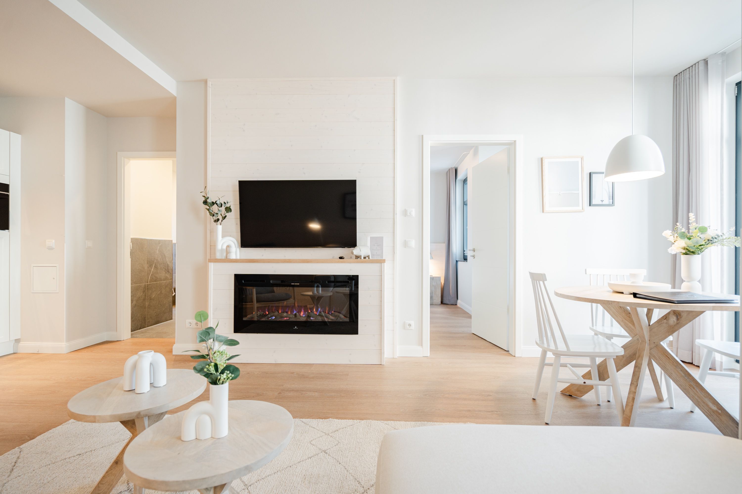 Wenn alles passt und das Ankommen sofort ein Wohlfühlen ist. Willkommen in dem 62 Quadratmeter großen 2-Raum-Appartement A1.1 im ersten Obergeschoss. Dieses charmante Domizil ist für 2 Personen der ideale Rückzugsort für eine entspannte und erholsame Auszeit an der Ostsee. Die haben Sie nämlich von der großzügigen Dachterrasse mit Sitzgelegenheit und Sonnenliege sogar direkt im Blick der perfekte Ort, um einen schönen Sonnentag zu genießen oder ihn hier bei einem kühlen Getränk ausklingen zu lassen. Das Appartement bietet allen Komfort, den Sie für einen schönen Urlaub benötigen. Helles Holz, warme Sandtöne und moderne Möbel sorgen für eine entspannte Atmosphäre. Alles passt wunderbar zusammen und ist harmonisch aufeinander abgestimmt. Treten Sie ein in den offenen Wohn- und Essbereich, der mit einer voll ausgestatteten Küchenzeile, einer gemütlichen Sofa-Sitzgruppe und einem 50-Zoll-Flachbildfernseher ausgestattet ist. Ein Elektrokamin (ohne Wärmeerzeugung) schafft romantische Gemütlichkeit. Schon einmal mit Meerblick gefrühstückt? Vom Esstisch aus haben Sie einen seitlichen Blick auf die Ahlbecker Seebrücke und die dahinter liegende Ostsee. Das Schlafzimmer des Appartements lädt mit seinem komfortablen Boxspringdoppelbett (1,80m x 2,00m) zu erholsamen Nächten ein. Das Meeresrauschen beschert zusätzlich wundervolle Träume. Ein geräumiger Kleiderschrank und eine Kommode bieten viel Stauraum für die Urlaubsgarderobe. Auch hier finden Sie einen 43-Zoll-Flachbildfernseher. Von beiden Zimmern aus haben Sie einen Zugang auf die Dachterrasse. So können Sie schon direkt nach dem Aufwachen einen tiefen Atemzug voller Ostseeluft nehmen. Das moderne Tageslichtbad ist mit einer Dusche, einem WC und einem Waschtisch ausgestattet. Ihr Auto steht sicher auf dem zum Appartement gehörenden PKW-Stellplatz in der Tiefgarage, die Sie bequem über den Fahrstuhl erreichen können.
