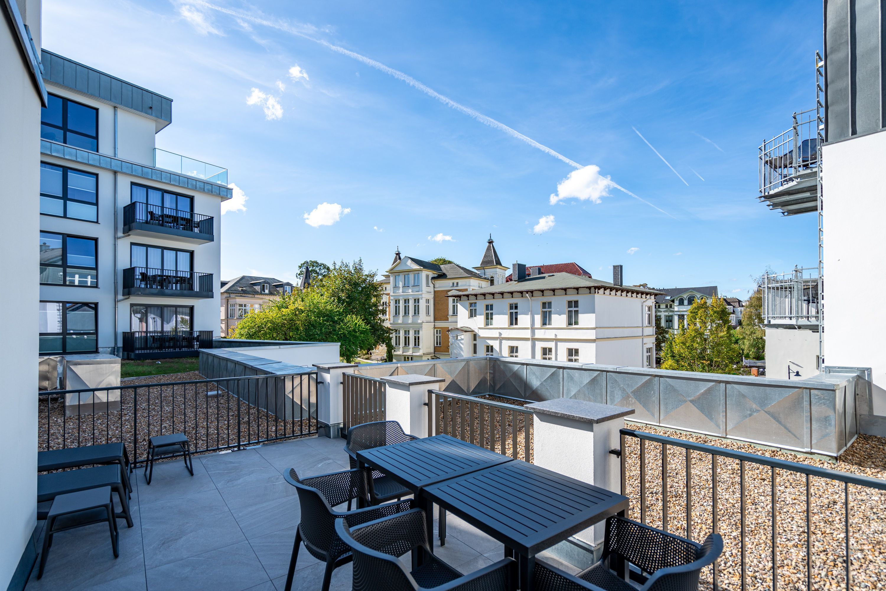 Die 2024 fertig gestellte Strandterrasse liegt direkt an der belebten Strandpromenade und bietet einen einzigartigen Ausblick auf die Grand Dame der historischen Seebrücken sowie die historische Konzertmuschel, einem beliebten Treffpunkt für Kunst und Kultur. Dahinter liegt die Ostsee ein Panorama, das zu den schönsten in den Kaiserbädern gehört. Es ist wie das Abtauchen in eine andere Zeit. In eine Zeit, in der man mit Stock, Sonnenschirm und Hut fürs „Sehen und gesehen werden“ über die Promenade schlenderte; aber auch in eine Zeit, in der damals wie heute Zeit einmal für eine kurze Weile keine Rolle spielt. Weil man angekommen ist im Loslassen, Entspannen und Genießen. Es ist dieser besondere Geruch nach Meeresluft und Freiheit, der in Erinnerung bleibt. Dazu die Bilder, die man mitnimmt. Von langen Strandspaziergängen, vom Lachen in fröhlich schäumenden Ostseewellen, von der Zeit in einem wunderschönen Urlaubsdomizil. Denn genau das ist die Strandterrasse mit ihren 56 modernen und exklusiven Ferienappartements direkt gegenüber der Ahlbecker Seebrücke. Die Ein-, Zwei- oder Dreizimmerwohnungen zwischen 40 und 70 Quadratmeter groß sind von einer Innenarchitektin gemeinsam mit unserem Erfahrungsschatz an Gästewünschen mit viel Liebe zum Detail und ganz individuell konzipiert worden. Entspannung und Wohlfühlen stehen an erster Stelle. Alles ist aufeinander abgestimmt und sorgt für eine gemütliche Atmosphäre. Wählen Sie zwischen einem Domizil in einem hellen, sandfarbenen Designkonzept oder einem Appartement mit anthrazitfarbenen Farbakzenten. Alle Appartements verfügen gleichermaßen über eine stilvolle und komfortable Einrichtung, die passgenau angefertigt worden ist, sowie über moderne Küchen und Bäder. Jedem Schlafzimmer ist ein eigenes Bad mit Dusche zugeordnet (außer App. B4.5). Die Appartements besitzen fast alle einen Balkon viele schauen sogar zur Ostsee hinaus. Die meisten Feriendomizile haben einen Elektrokamin und Infrarotsaunen. Im Erdgeschoss befindet sich ein separater Gemeinschaftsraum für Fahrräder. Außerdem besteht die Möglichkeit, im Gemeinschaftswaschraum 2 Waschmaschinen & Trockner zu nutzen. Ergänzt wird das Angebot durch eine Gemeinschaftssauna, die täglich von 11:00 bis 22:00 Uhr nutzbar ist. In der Tiefgarage (Einfahrtshöhe 2,03 Meter) steht für jede Wohnung 1 Pkw-Stellplatz zur Verfügung. Ist alles zur Zufriedenheit untergebracht? Dann kann der Urlaub ja beginnen. Und beim Blick vom Balkon über die Ostsee treffen sich zum Sonnenaufgang das Heute und das Damals. Gelassenheit legt sich beim Gang hinunter an den Strand auf die Seele. Jetzt darf die Zeit stehenbleiben.