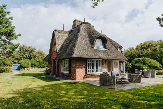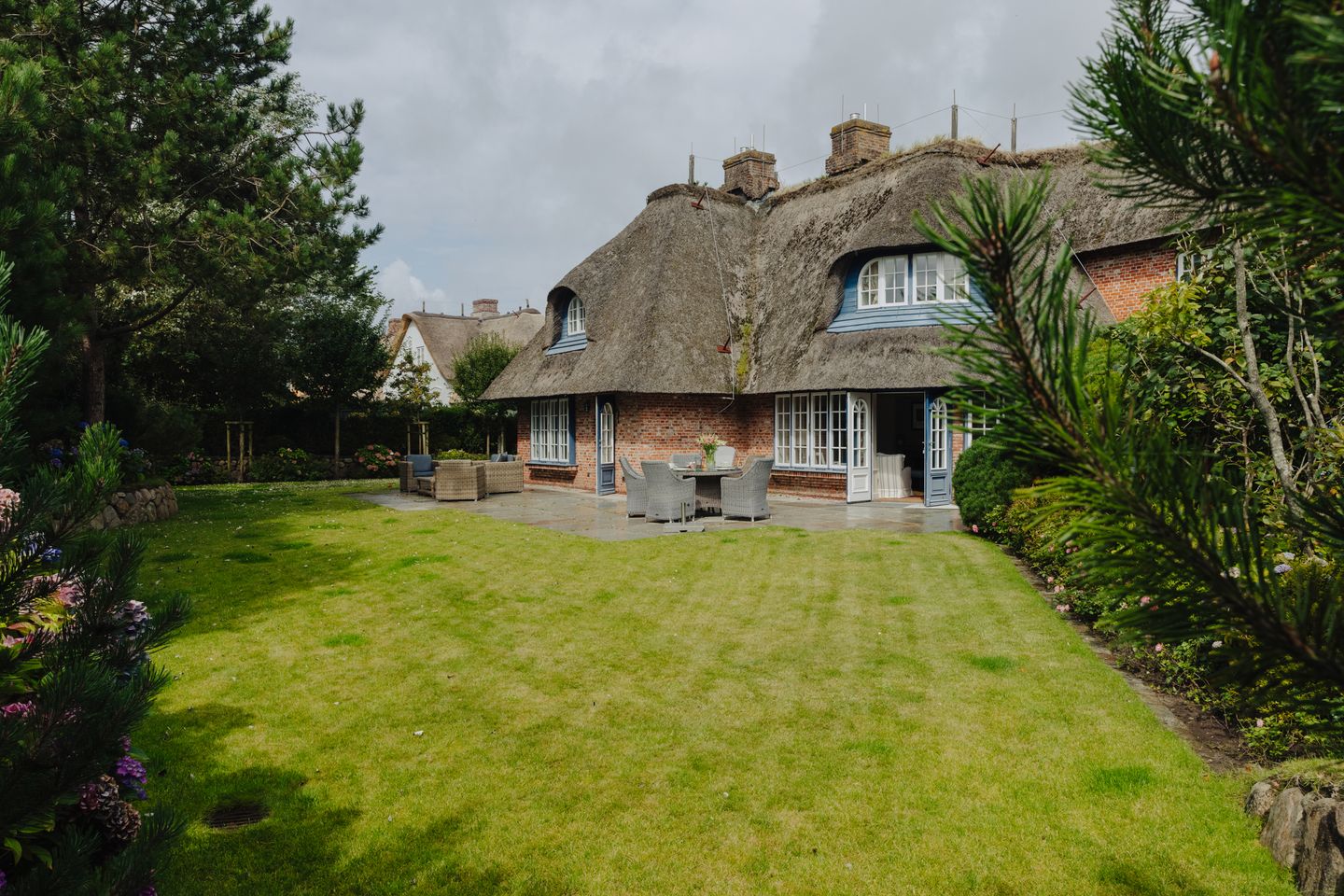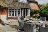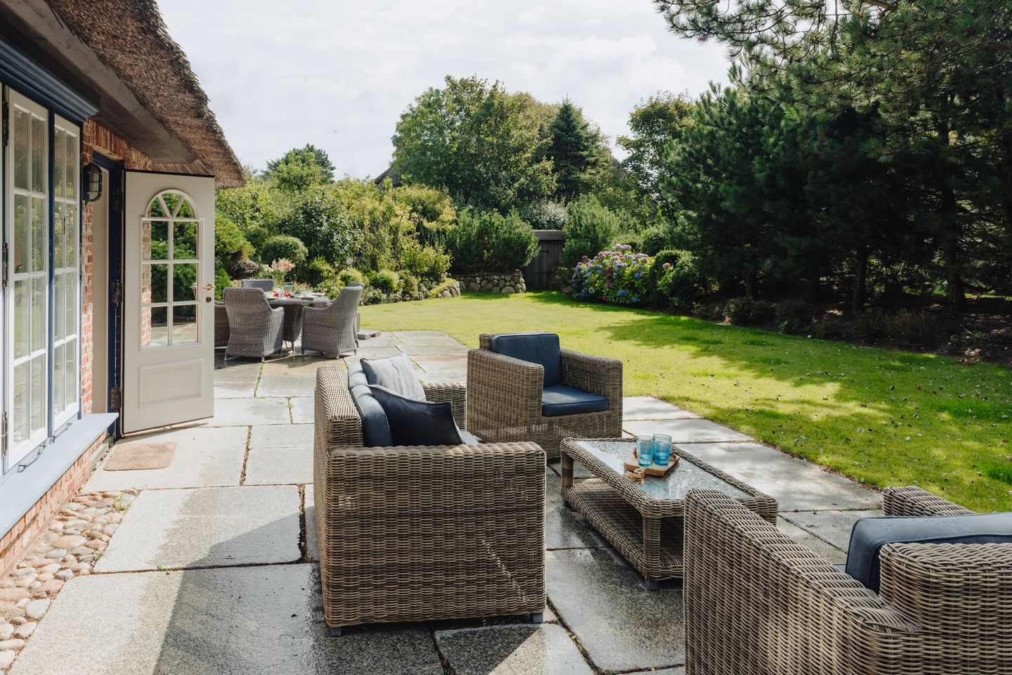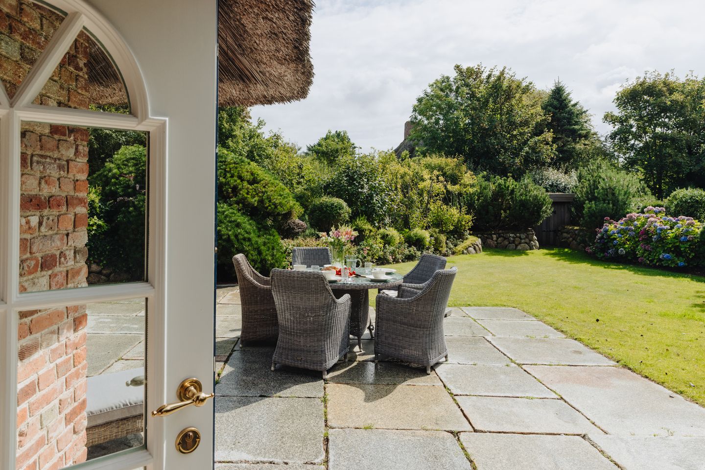 Die Terrasse ist der perfekte Ort, um ungestörte Stunden im Freien zu verbringen, umgeben von üppigem Grün, das einen privaten Rückzugsort auf Sylt schafft.