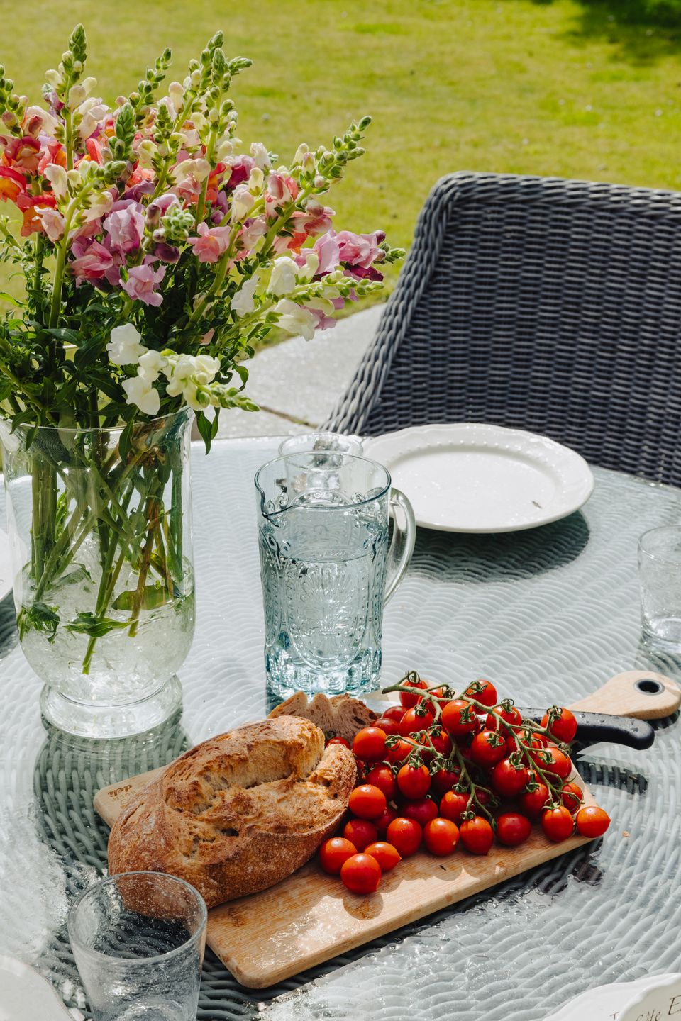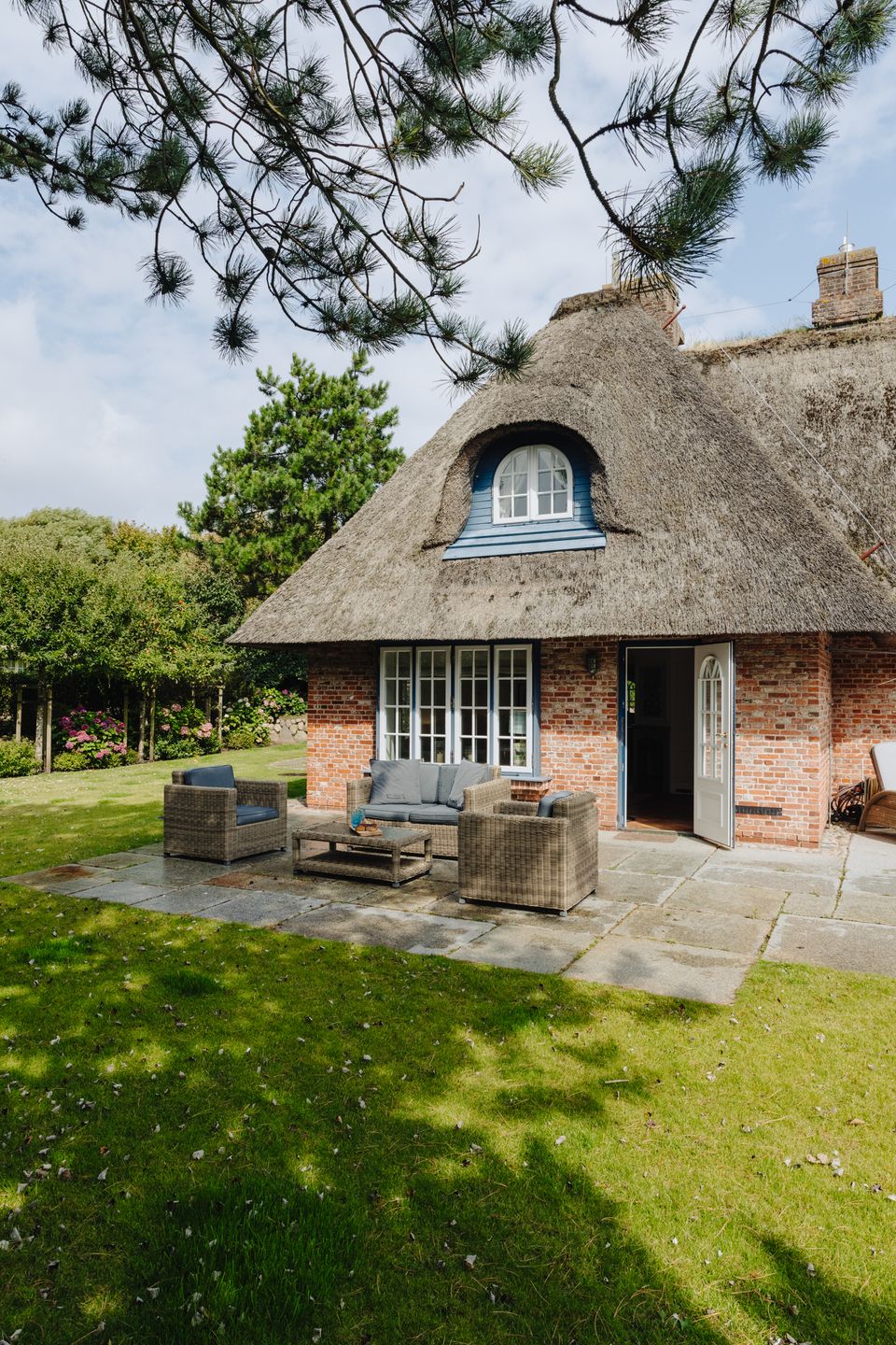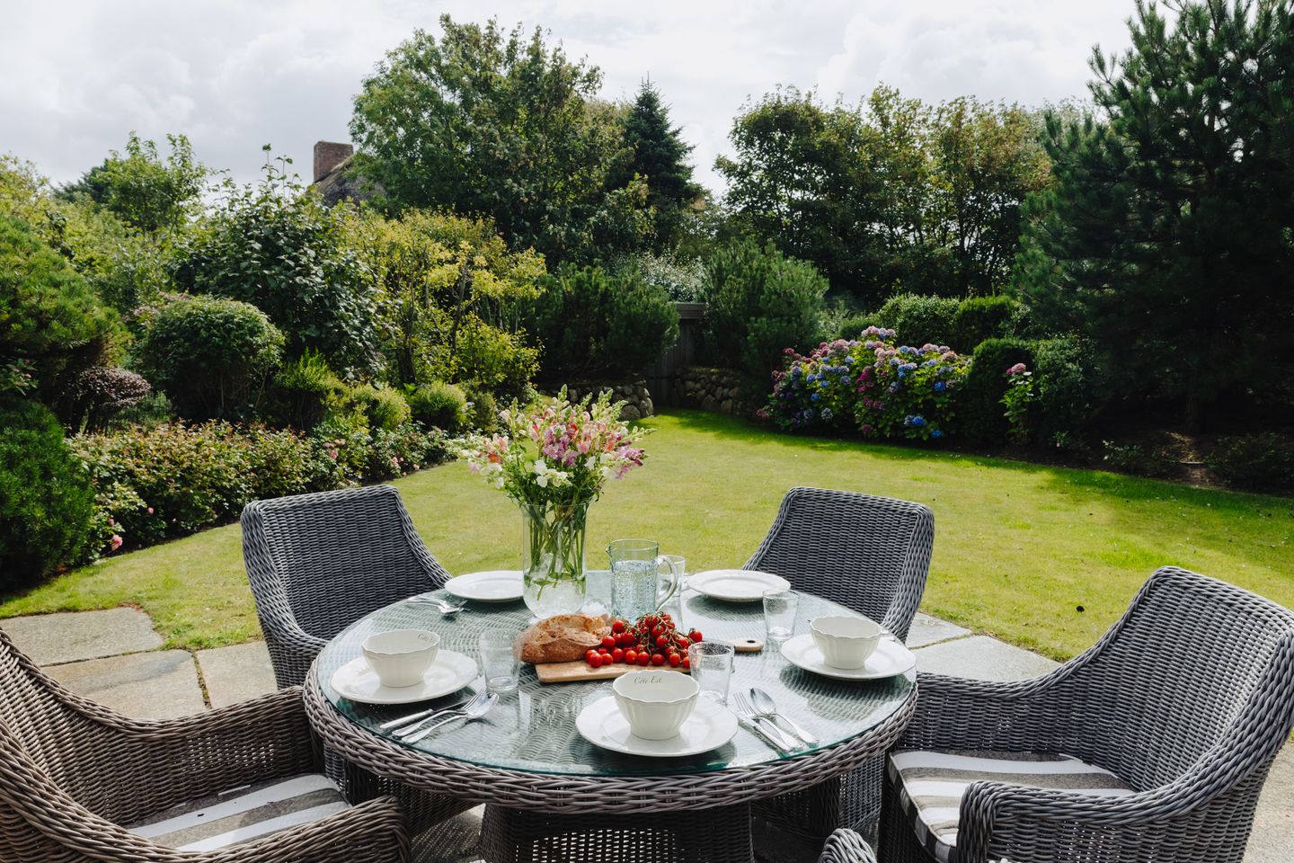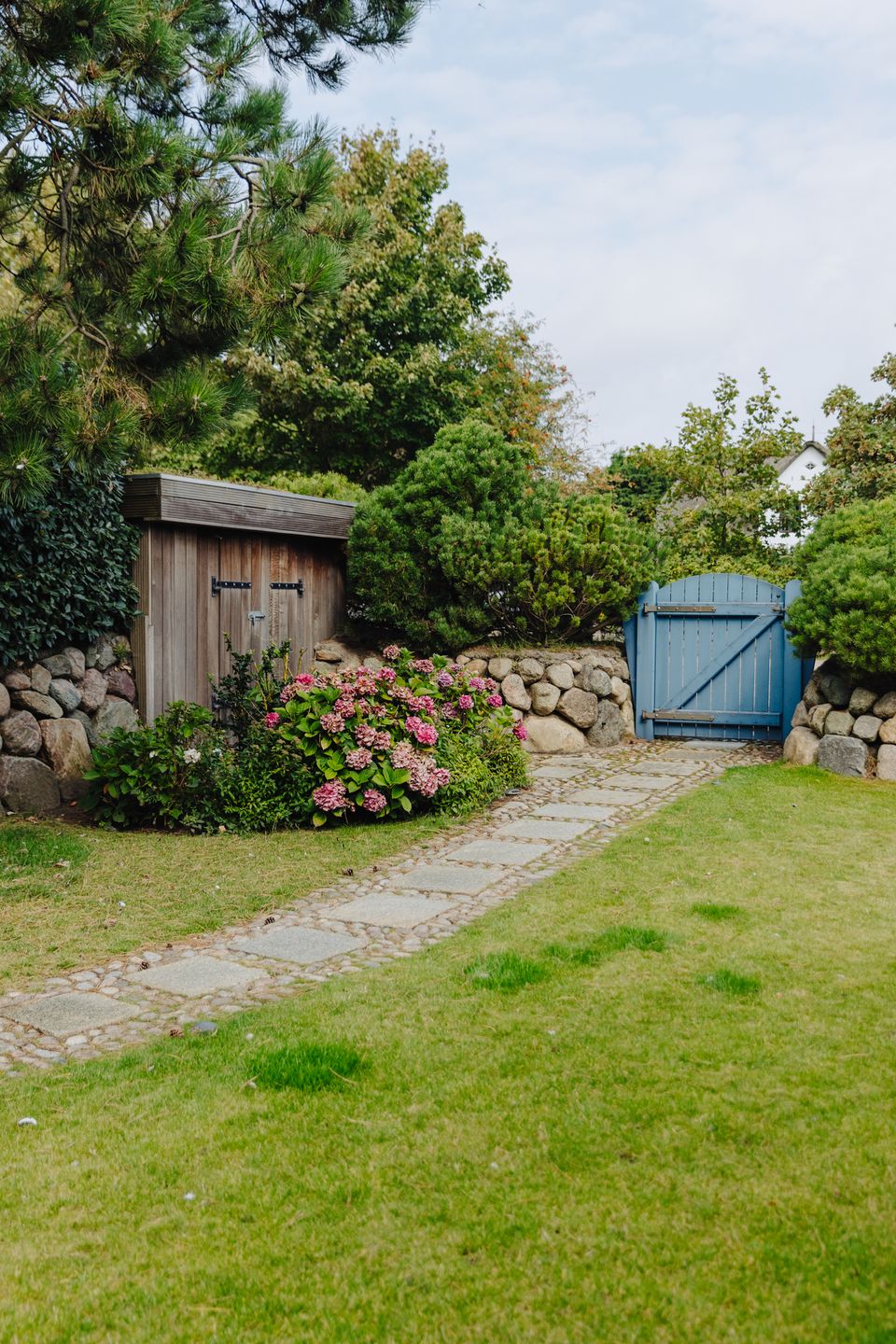 Die Terrasse ist der perfekte Ort, um ungestörte Stunden im Freien zu verbringen, umgeben von üppigem Grün, das einen privaten Rückzugsort auf Sylt schafft.