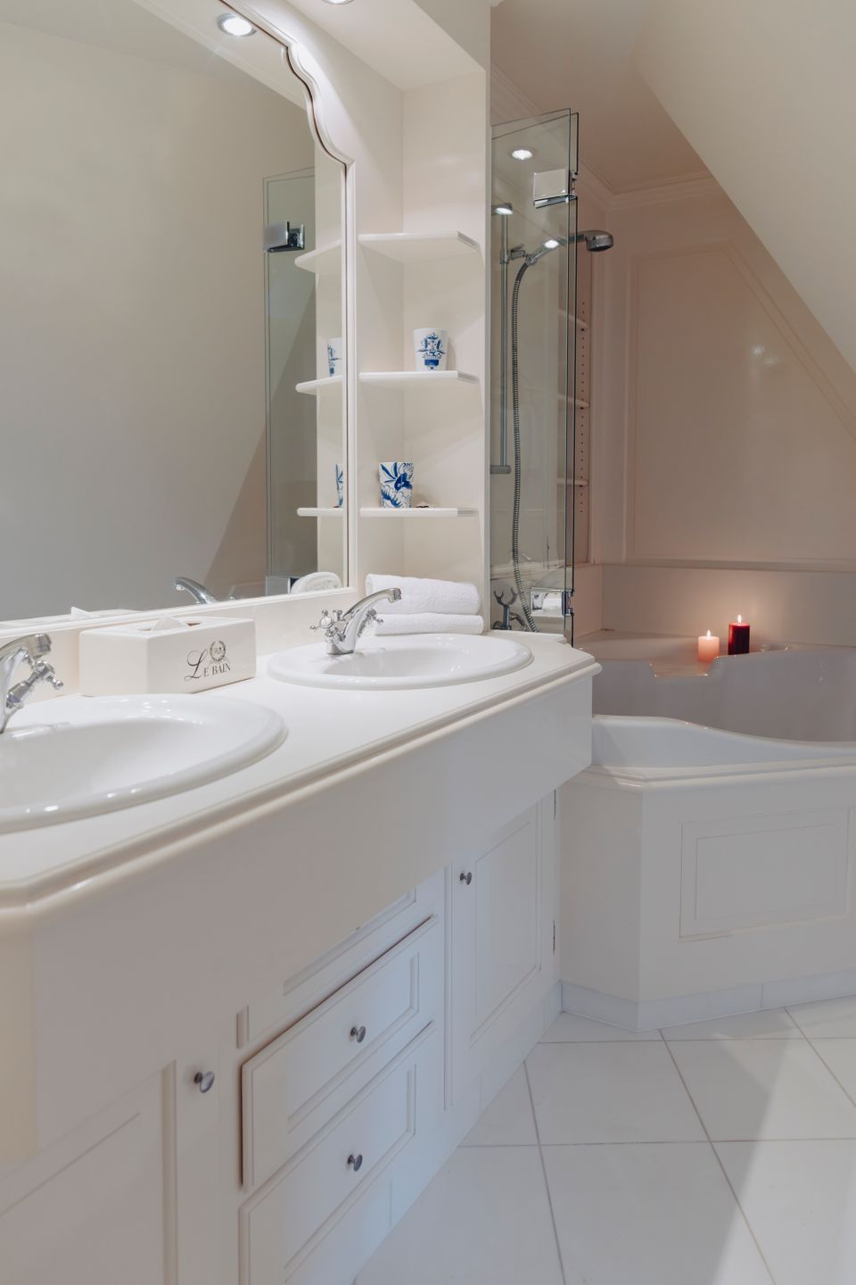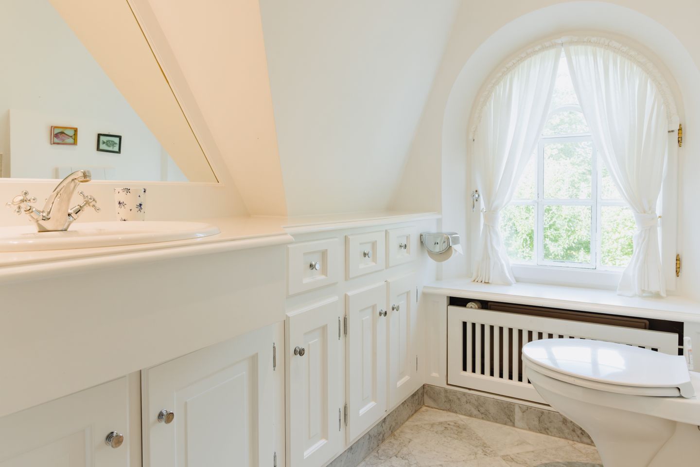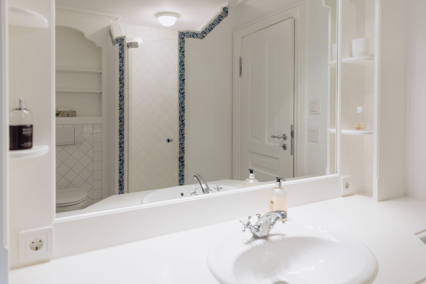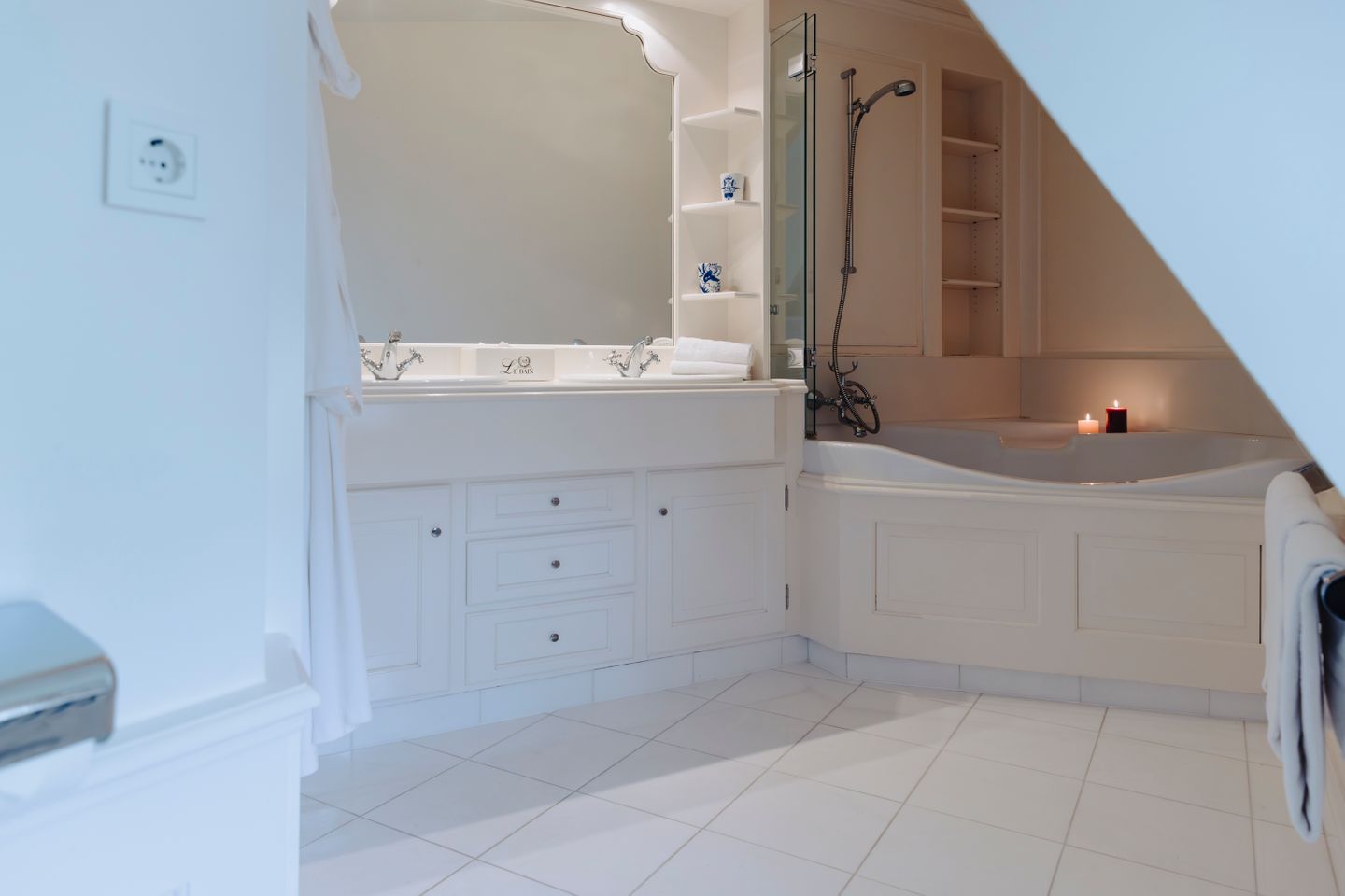 Eines der Badezimmer verfügt über eine großzügige Badewanne, die zum Relaxen bei Kerzenschein einlädt, umgeben von der einzigartigen Ästhetik der friesischen Kacheln.