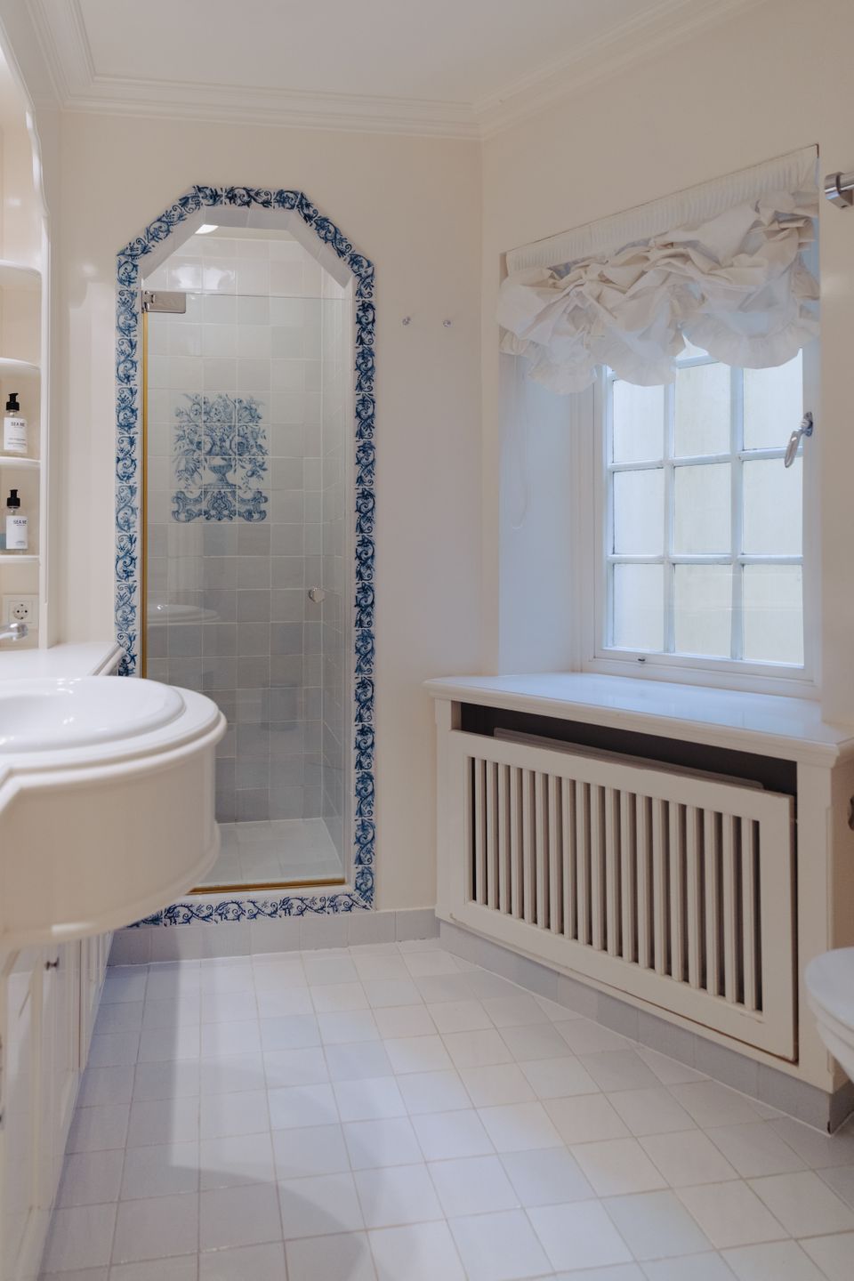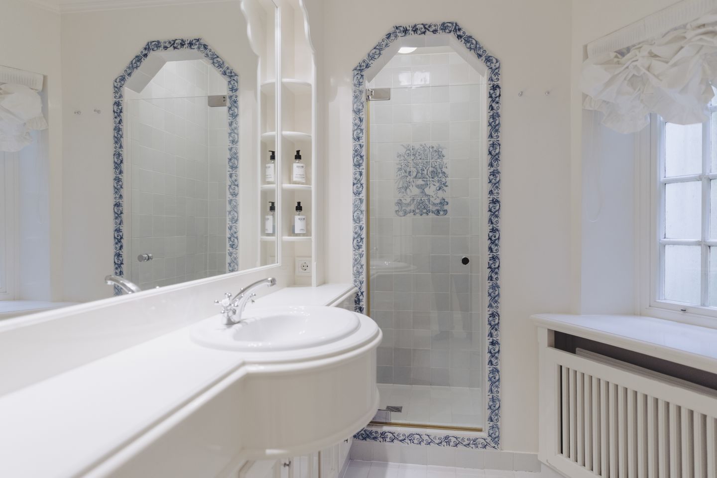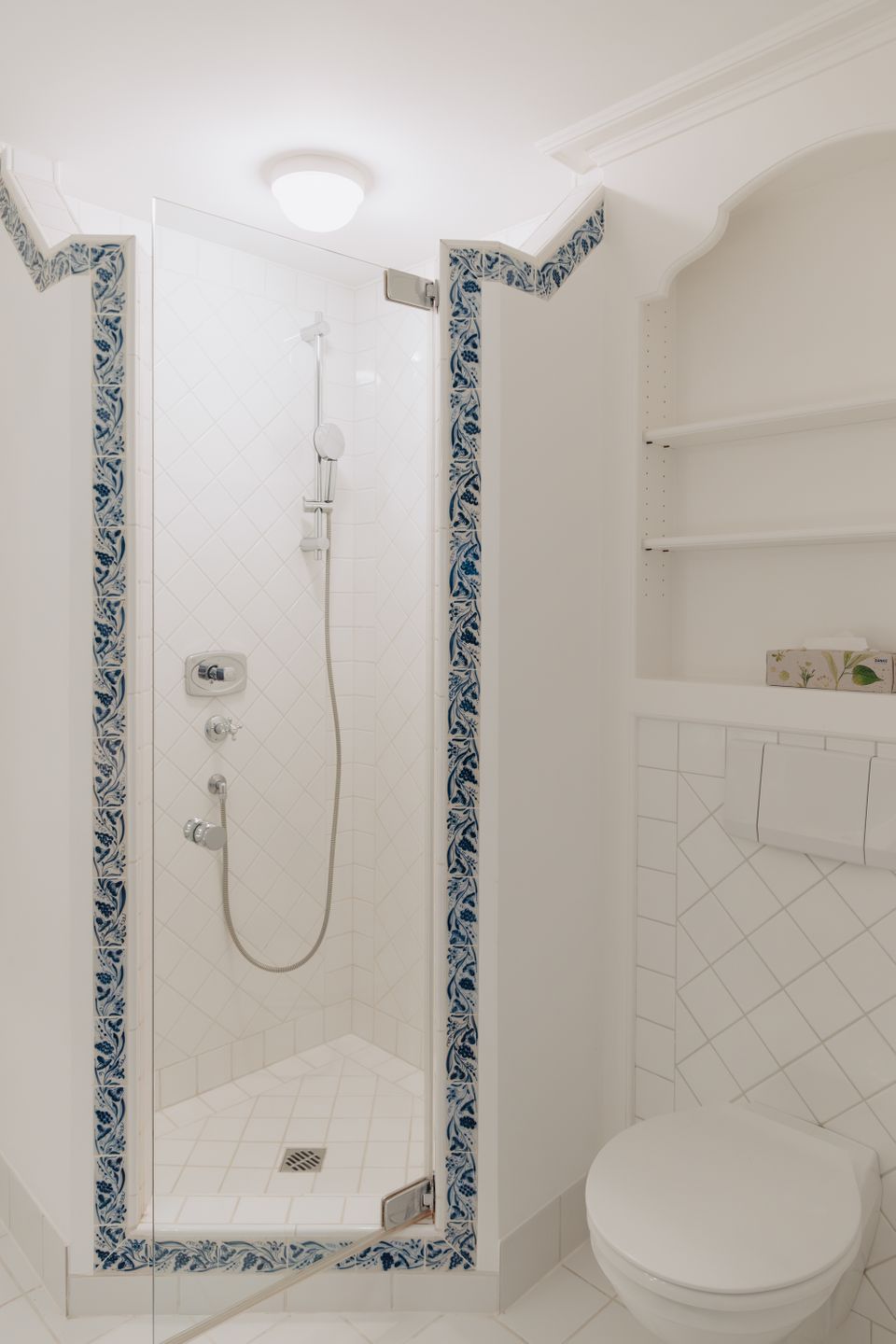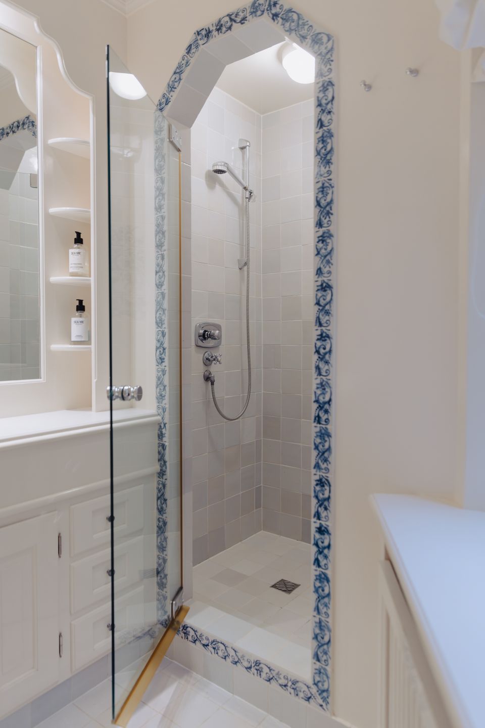 Zwei weitere Bäder sind mit komfortablen Duschen ausgestattet, die ebenfalls mit kunstvollen Fliesen verziert sind und ein besonderes Duscherlebnis bieten.