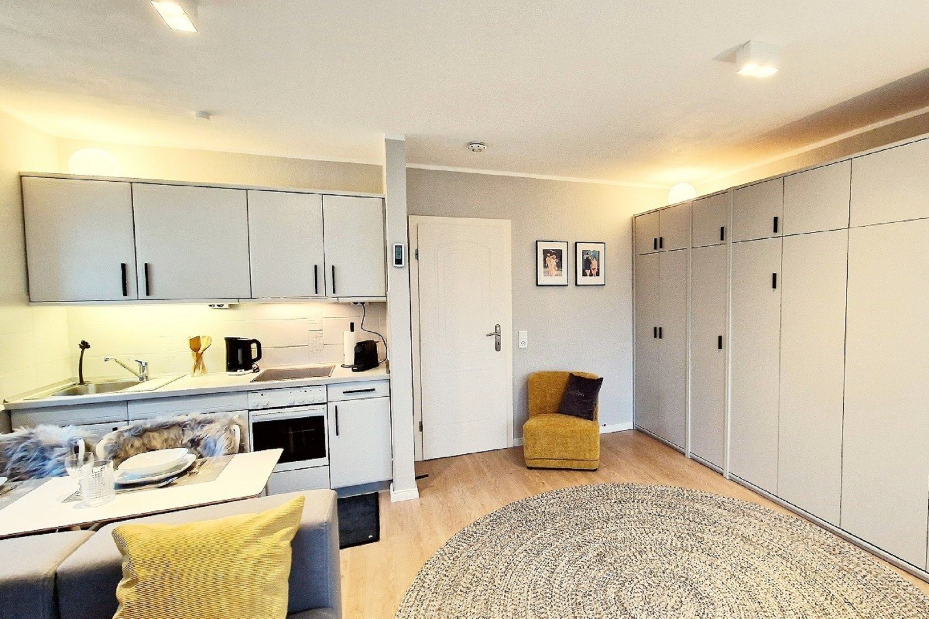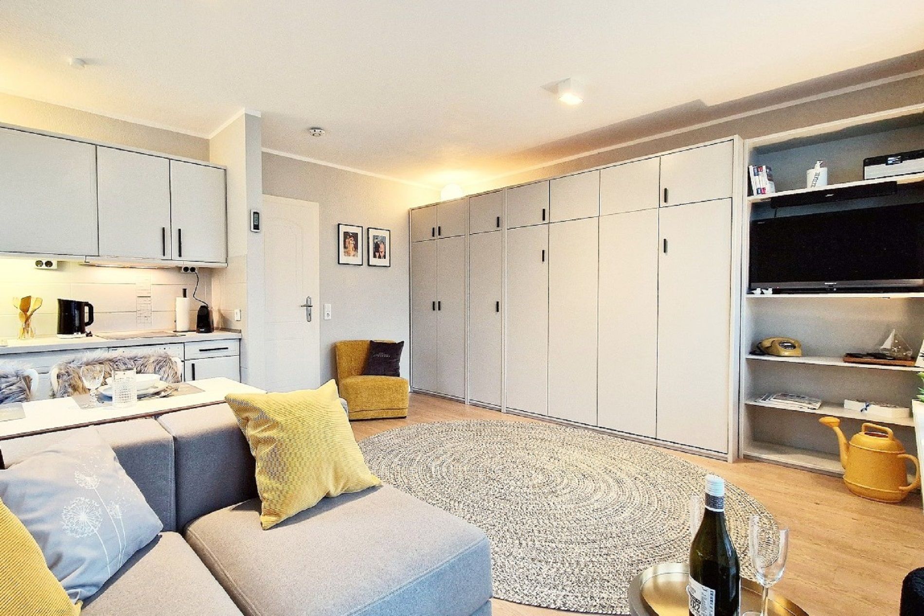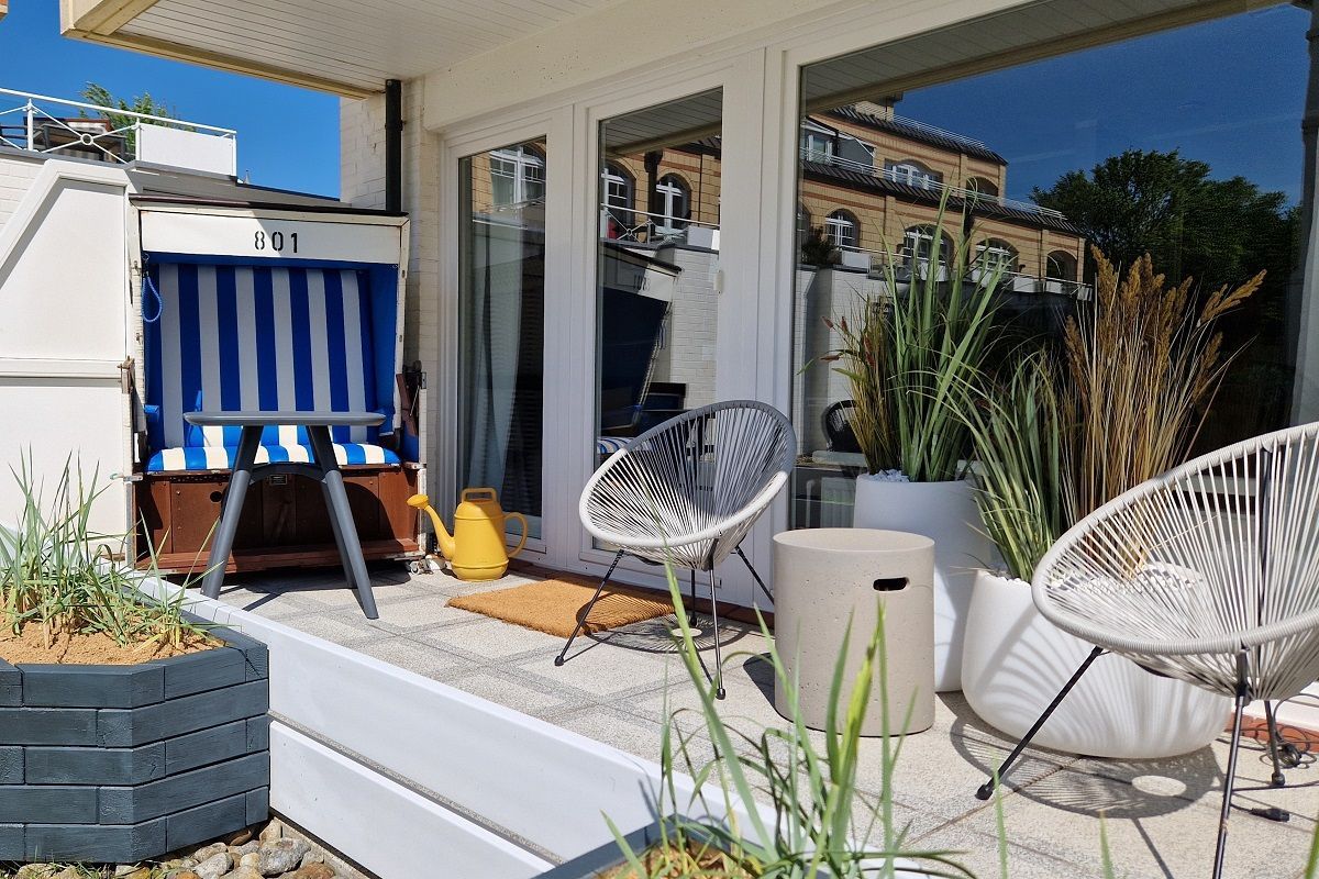Großzügige 1-Zimmer-Ferienwohnung (ca. 32 qm) im EG für 2 Personen mit Westterrasse (Nachmittagssonne, mit Strandkorb und Terrassenstühlen) und eigenem PKW-Stellplatz in der Tiefgarage.