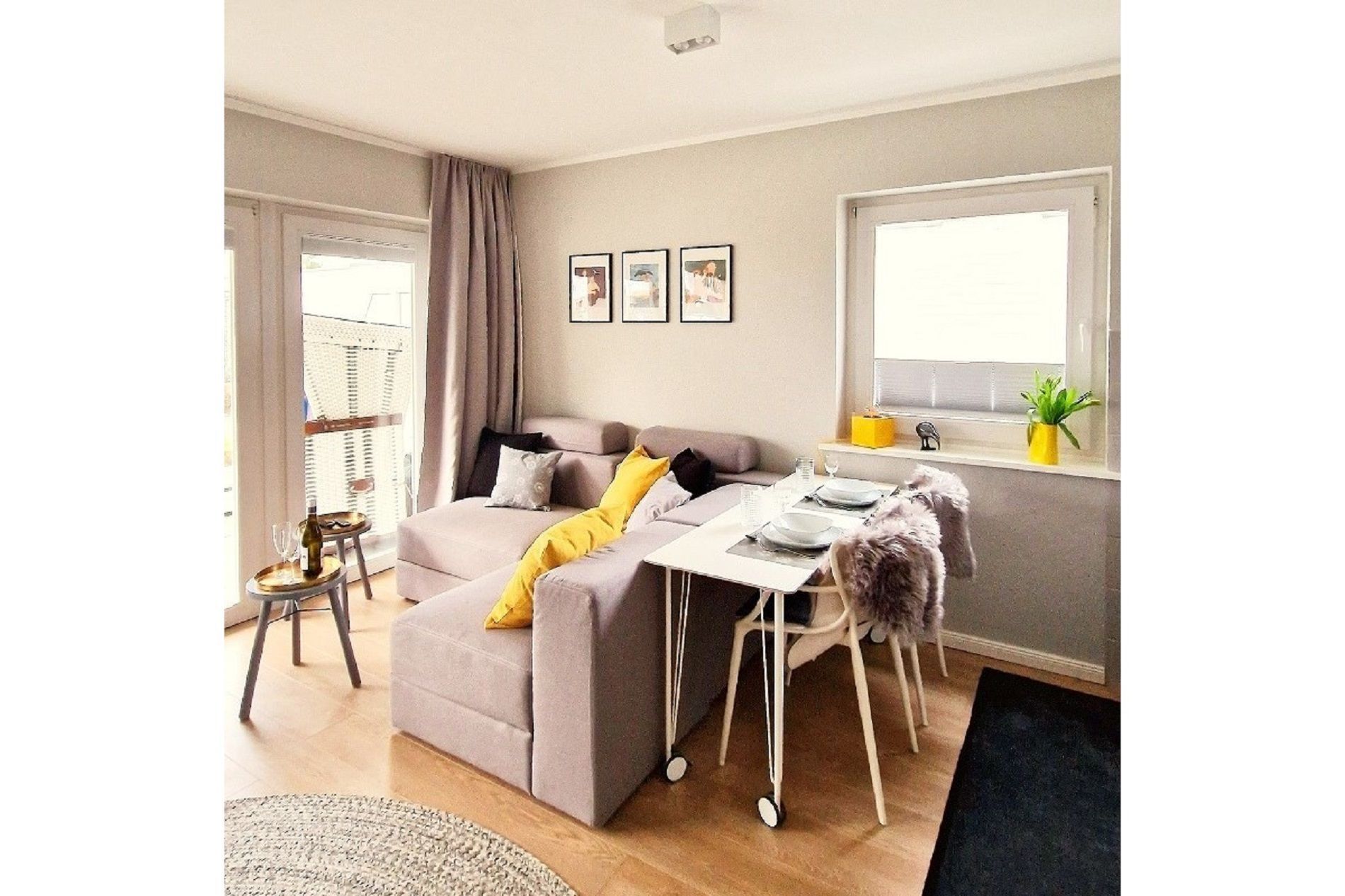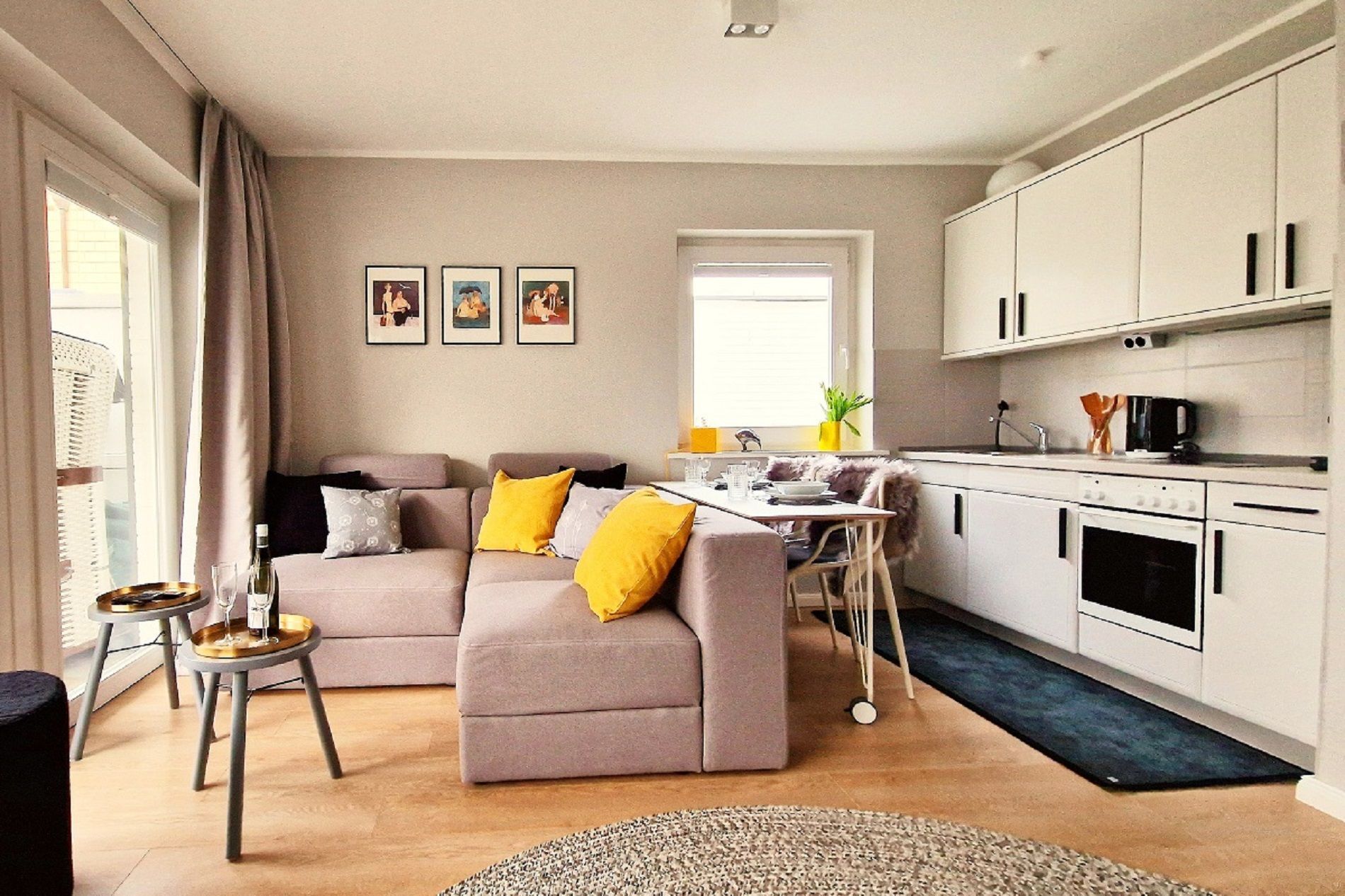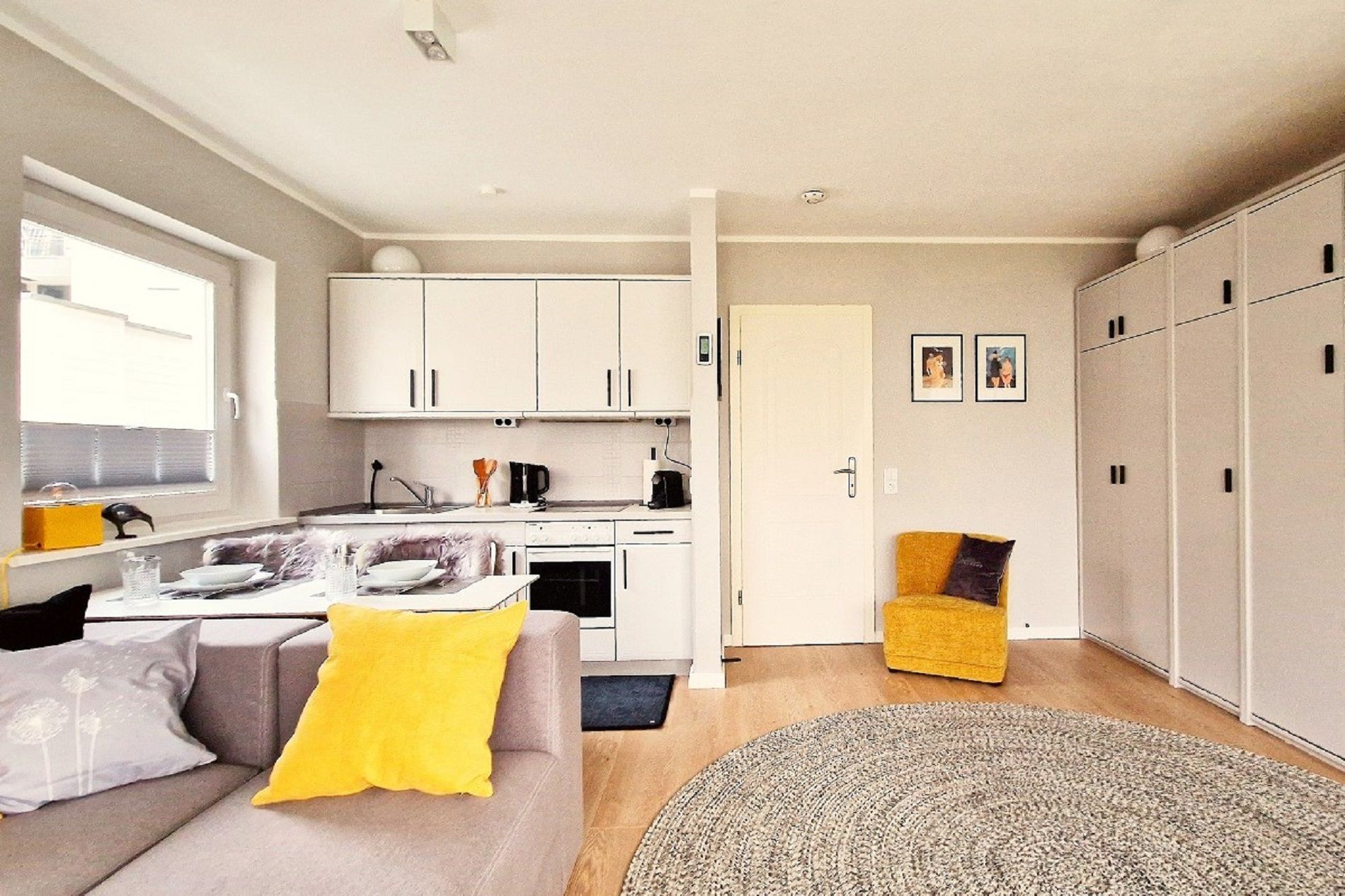 Großzügige 1-Zimmer-Ferienwohnung (ca. 32 qm) im EG für 2 Personen mit Westterrasse (Nachmittagssonne, mit Strandkorb und Terrassenstühlen) und eigenem PKW-Stellplatz in der Tiefgarage.