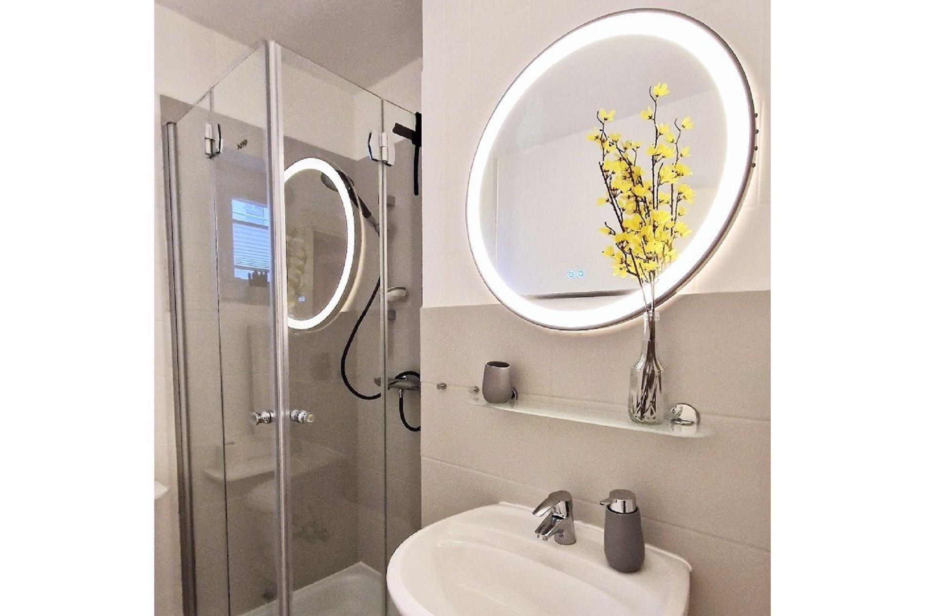 Die helle Küchenzeile besitzt ein Cerankochfeld mit 4 Feldern, Nespressomaschine und einen Kühlschrank mit 3*-Gefrierfach.