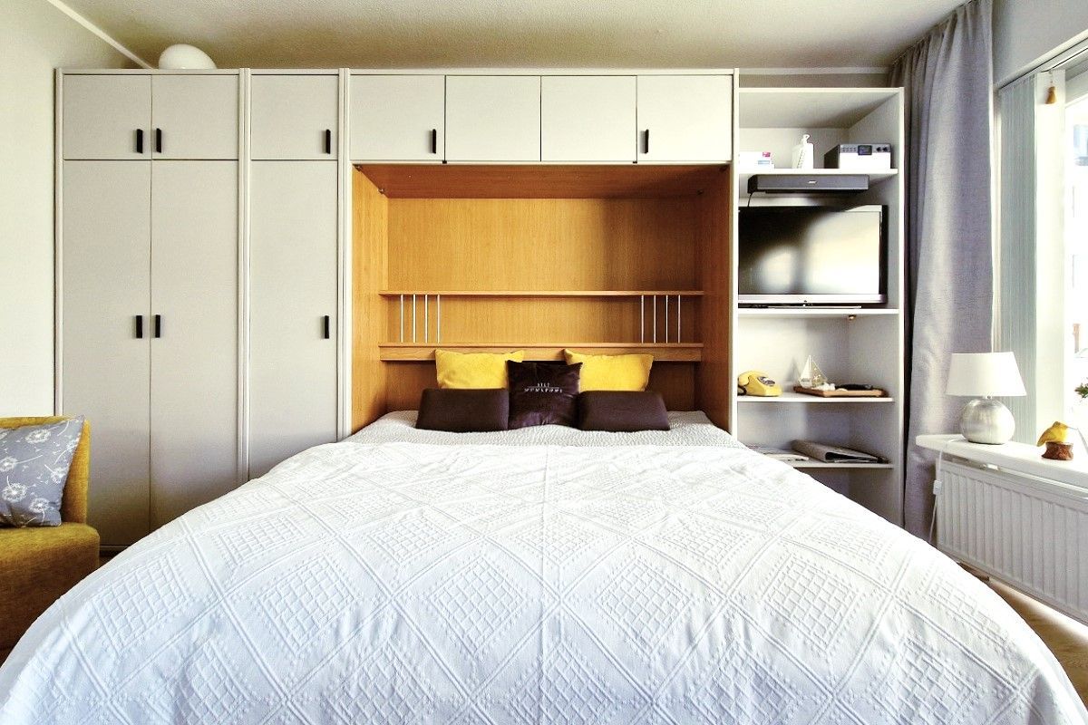 Der Wohn-/Schlafraum mit Laminat in Holzoptik ist mit einer Eckcouch, einem Sessel, einem Doppelschrankbett (mit zwei Einzelmatratzen 0,80 x 1,96 m, im Ganzen ausklappbar), einem separatem Essplatz, Kabel-Flachbild-TV, Bose-Soundbar (verbunden mit dem TV) und Internetradio mit Bluetooth und W-Lan ausgestattet.