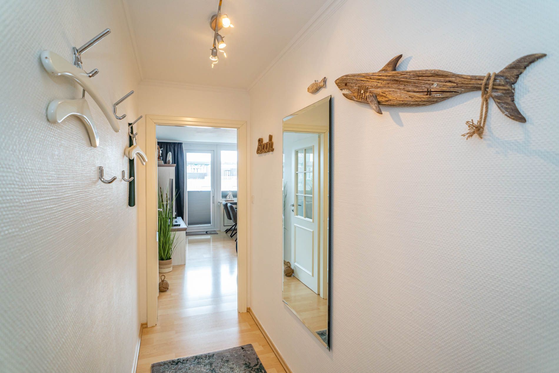 Vom Vorflur mit Garderobe und Küchenzeile gelangt man in das geschmackvoll von den Eigentümern eingerichtete Wohnzimmer (mit Austritt zum Balkon), in das Schlafzimmer mit Doppelbett und in das moderne Duschbad/WC.