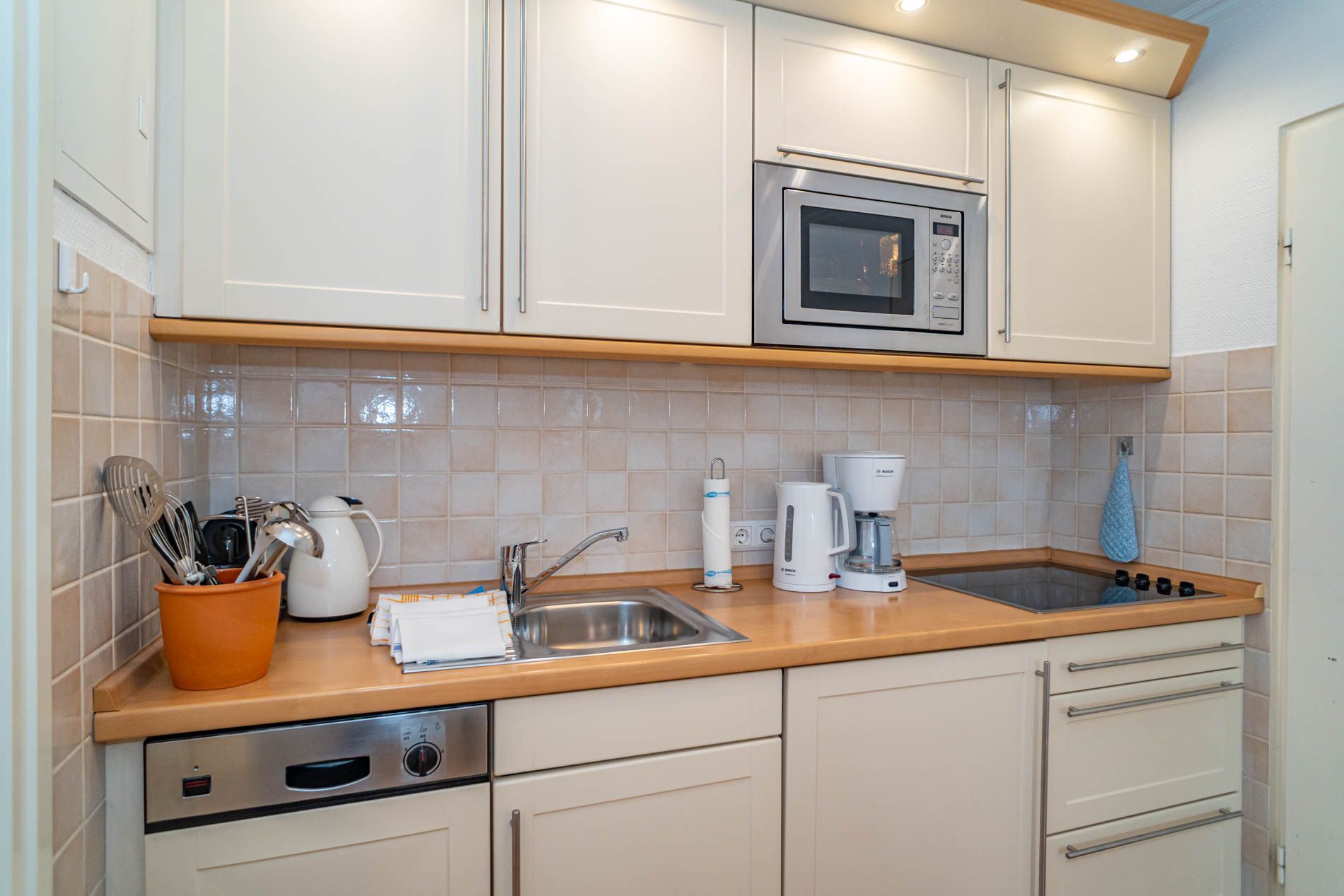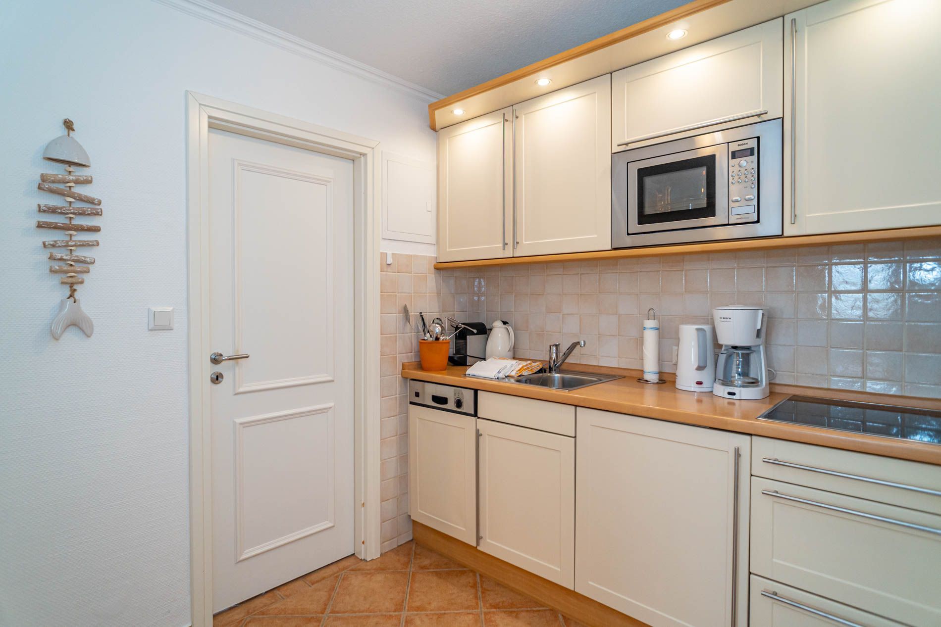 Die Küchenzeile hat einen Geschirrspüler, ein Cerankochfeld, eine Mikrowelle mit Grill und einen Kühlschrank mit 3-Sterne-Gefrierfach. Kaffeemaschine, Nespresso-Kapselmaschine, Wasserkocher, Eierkocher und Toaster gehören zur Grundausstattung.