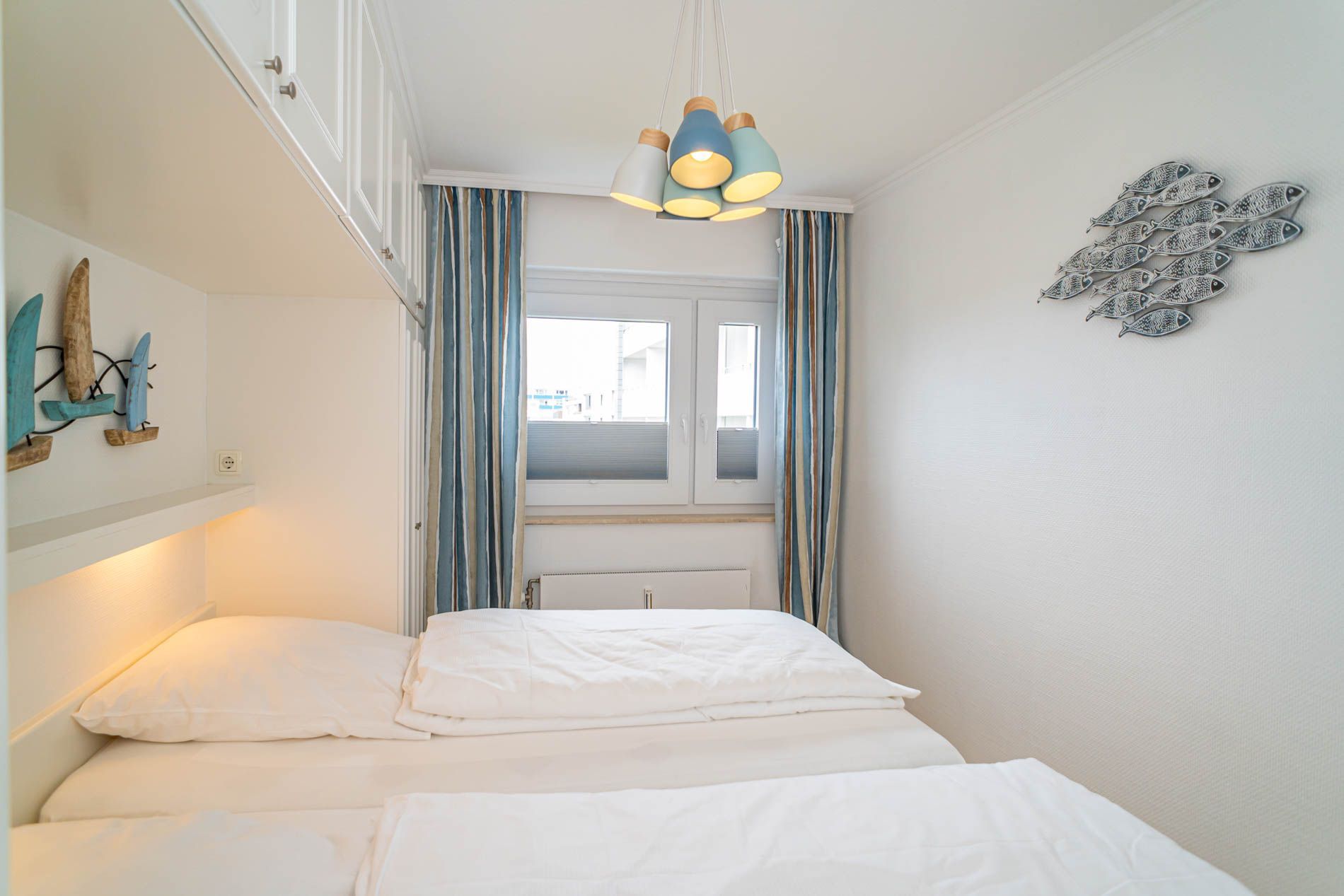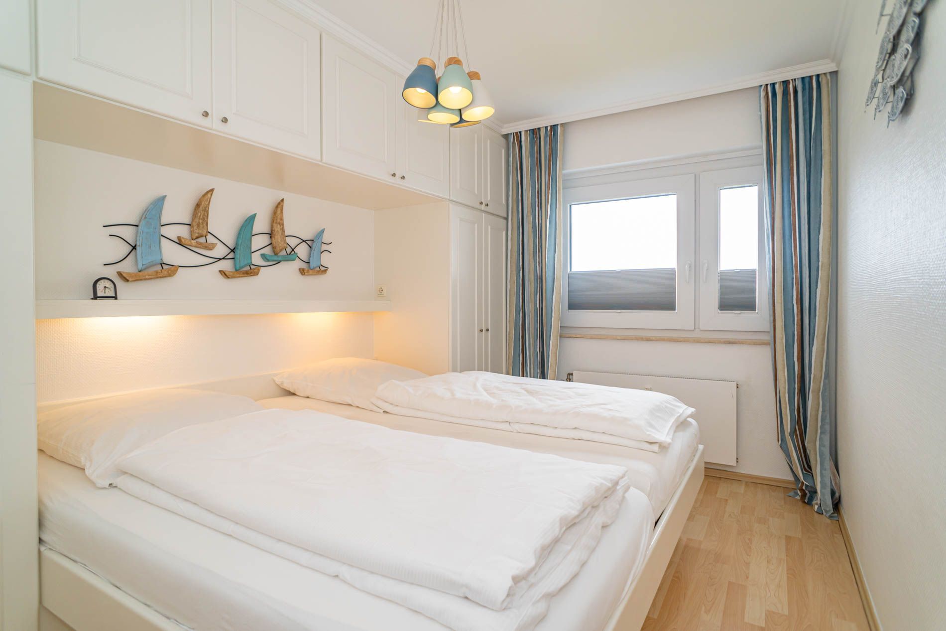 Das Schlafzimmer hat ein Doppelbett in der Größe 2,00 x 2,00 Meter mit zwei Einzelmatratzen.