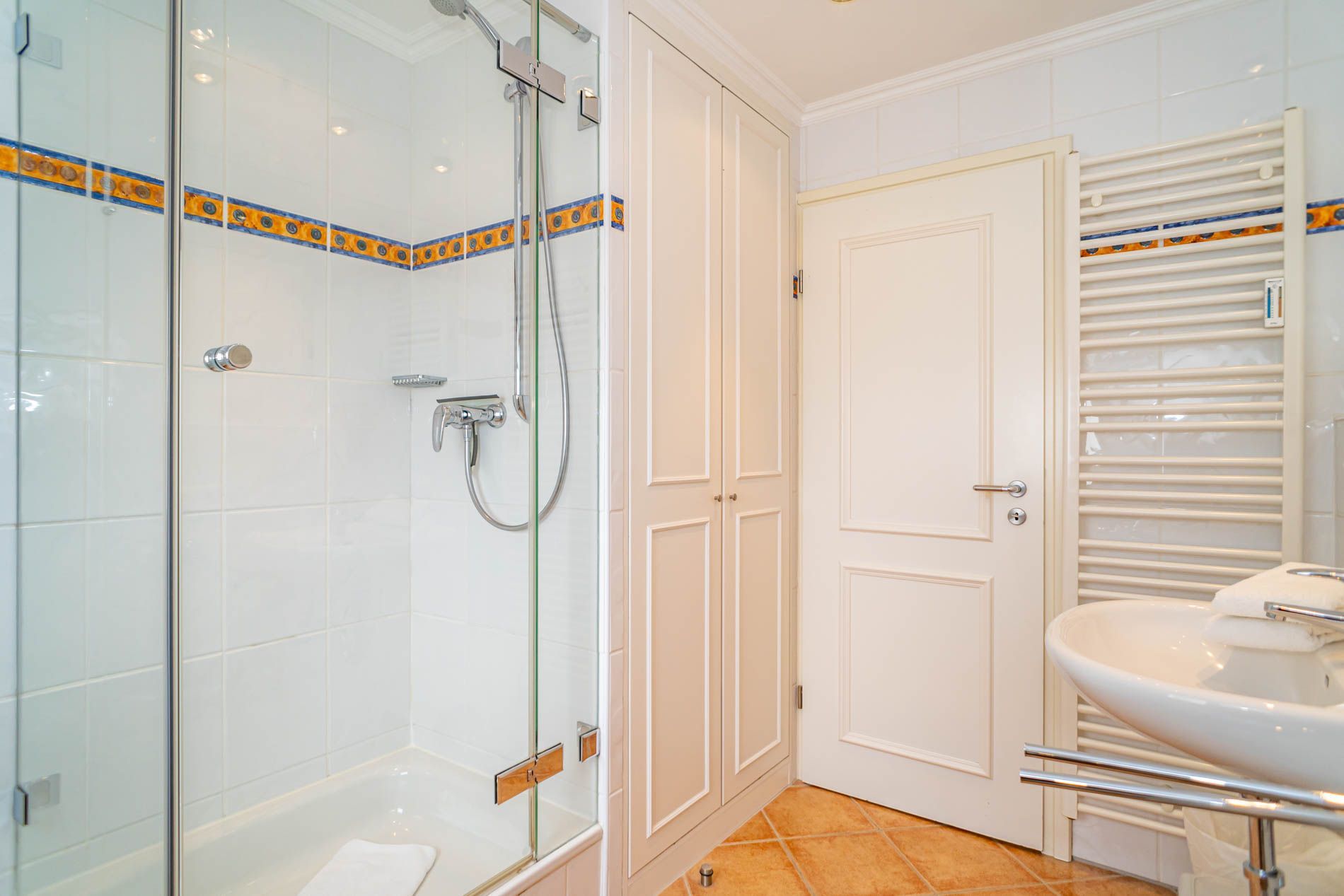Im modernen Bad befinden sich eine Dusche, ein WC, ein Waschtisch und ein Fenster. Außerdem ein Fön.