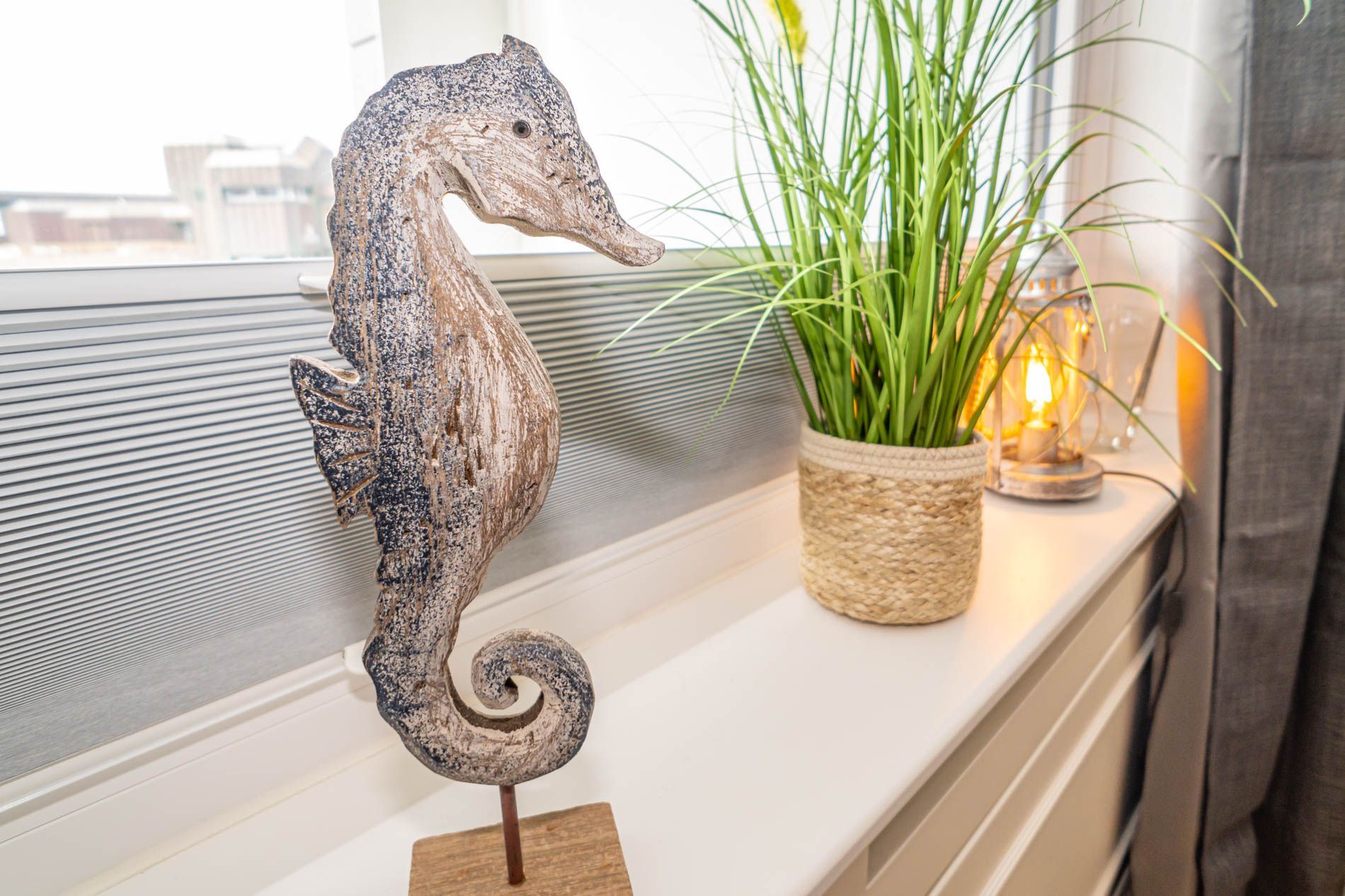 Wohn-/Essraum als auch das Schlafzimmer lassen sich mit Plissees verdunkeln.