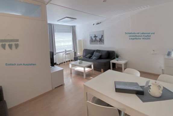 Sonnige 1,5-Zimmer-Wohnung mit Süd-West-Balkon im 2. OG - hier wohnen Sie hinterm Deich direkt in der Marina. Gepflegt, gemütlich und komfortabel eingerichtet für 2 (+2). WLAN, max. 1 Hund, Fahrradraum für 2 Räder, Strandentfernung ca. 200 m.