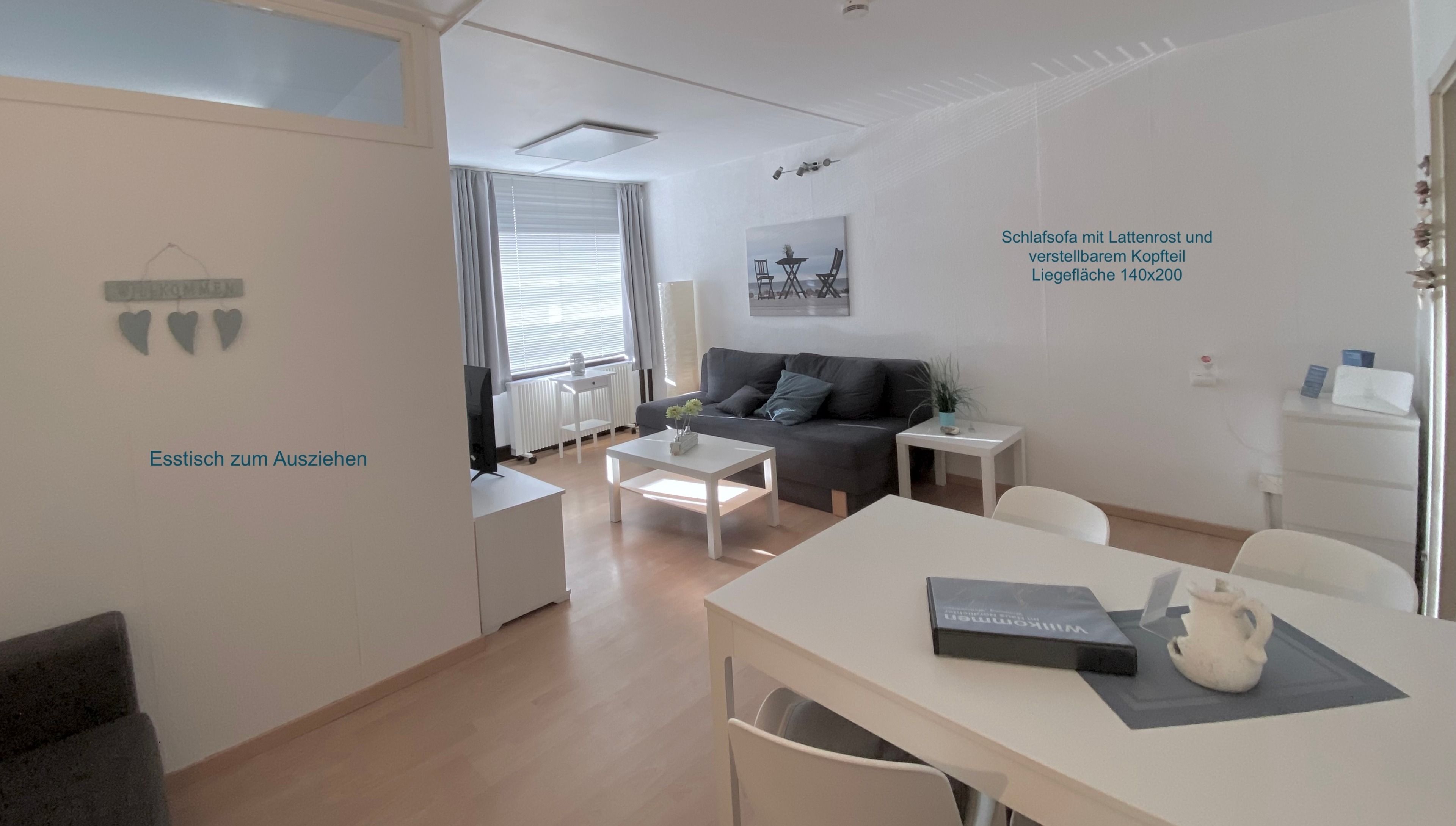 Diese gepflegte 1,5-Zimmer-Nichtraucher-Wohnung Wellenreiter bietet mit ihrer modernen Einrichtung und einer komfortablen Ausstattung alles, was Sie für Ihren Wohlfühl-Urlaub am Meer brauchen. Sie befindet sich im 2. OG eines ruhigen Apartmenthauses (Fahrstuhl ist vorhanden) ca. 200 m vom Strand. Den Wohnmittelpunkt bildet der großzügige Essplatz vor der offenen Küche. Sie ist ausgestattet mit reichlich Geschirr, Ceranfeld, Backofen, Mikrowelle, Geschirrspüler, Kühlschrank/Gefrierfach, Kaffeemaschine, Wasserkocher und Toaster. Im Schlafzimmer befindet sich ein Doppelbett mit einer Liegefläche von 140x200 (verstellbare Lattenroste). Das Schlafsofa im Wohn-/Schlafraum, lässt sich kinderleicht in ein bequemes Doppelbett (auf Wunsch mit zusätzlichem viscoelastischem Topper, 140x200) verwandeln; es hat ein Lattenrost und ein verstellbares Kopfteil. Das kleine Kuschelsofa bietet einen zusätzlichen Schlafplatz (Liegefläche 110x200) - allerdings bodengleich ohne Lattenrost. Sowohl in dem modernen Duschbad mit Fußbodenheizung als auch in dem großen Einbauschrank im Flur finden Sie genügend Stauraum für Ihre persönlichen Dinge.