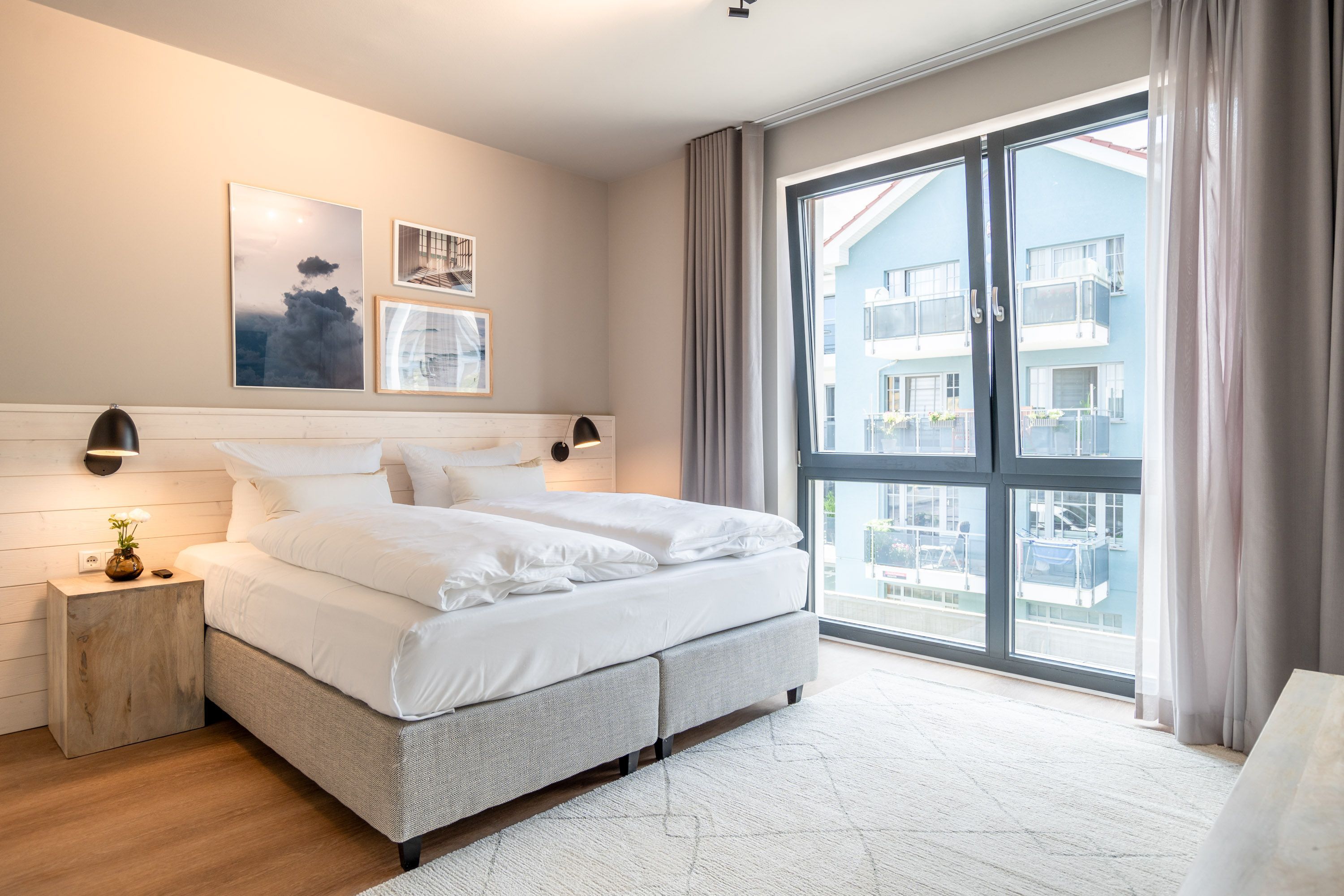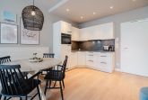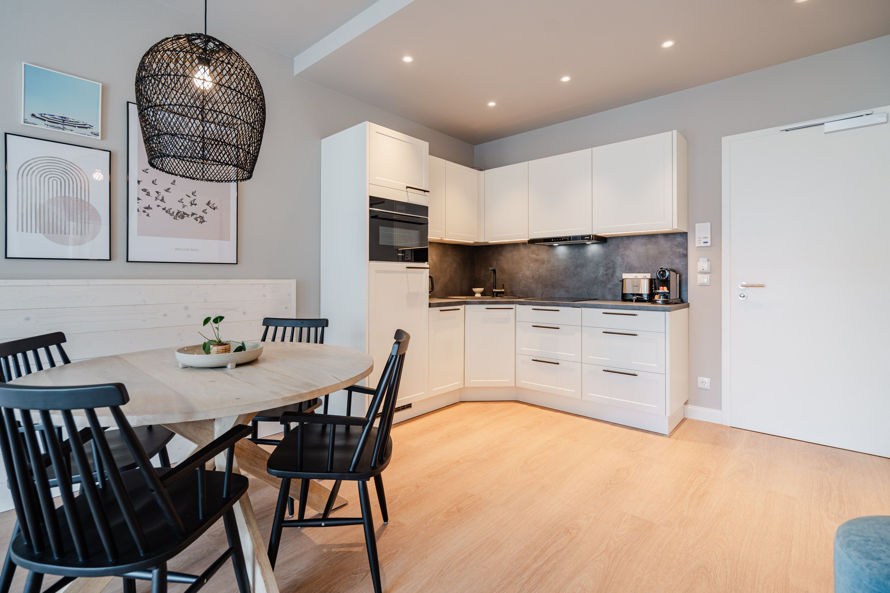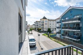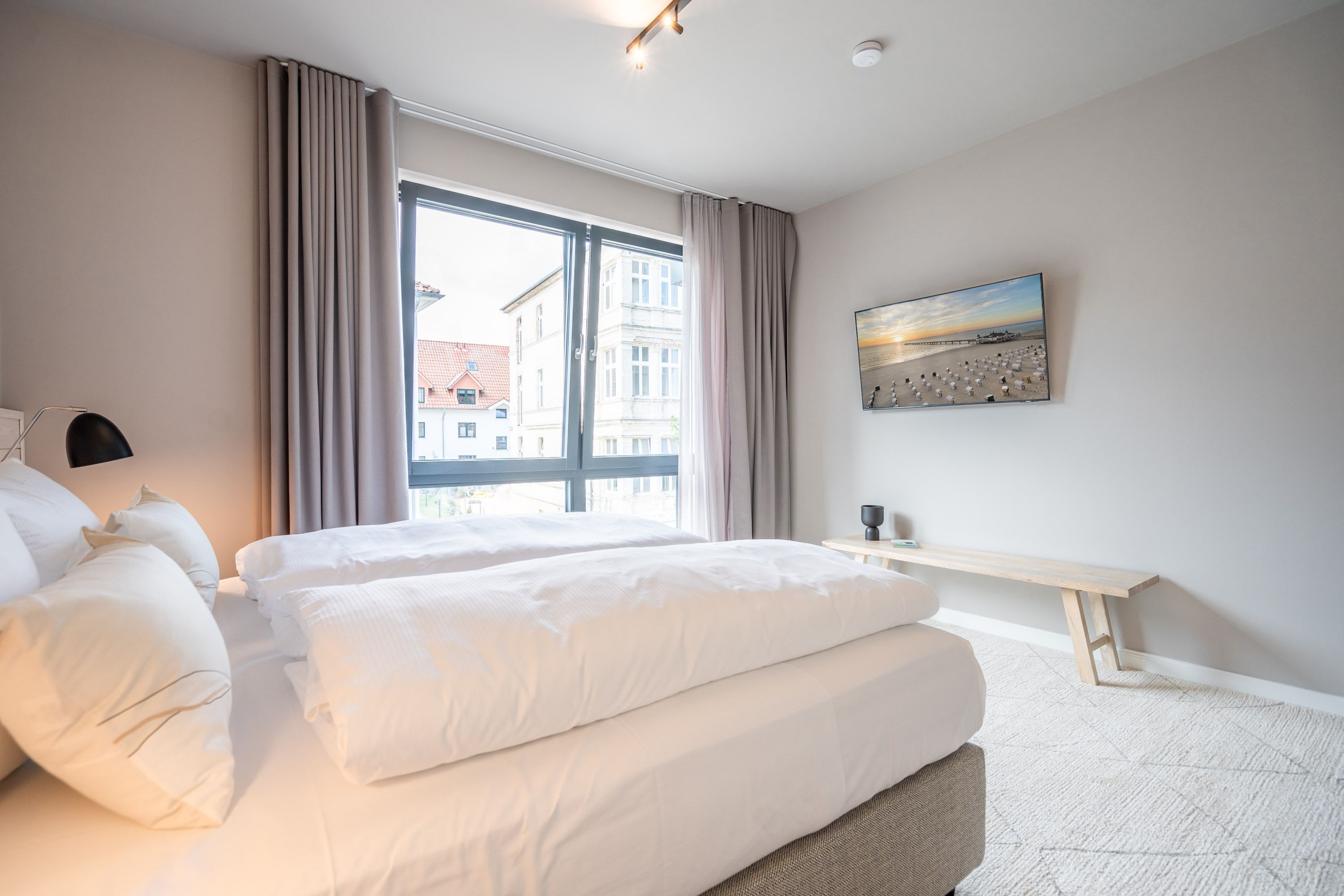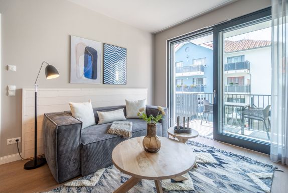 Mitten im Zentrum des Seebades gelegen, dazu nur 80 Meter vom Strand entfernt das 2-Raum-Appartement B 1.5 im 1. Stock von Haus B ist eine charmante Ferienwohnung, die Ihre Meerauszeit zu einem besonderen Erlebnis macht. Die 52 Quadratmeter sind nicht nur ideal für 2 Personen, sondern warten mit viel Gemütlichkeit und Stil nur darauf, Ihnen entspannte Stunden zu schenken. Das Interieur wurde von unserer Inneneinrichterin eigens aufs Wohlfühlen hin konzipiert. Die Farben der Insel sind hier mit modernen Designmöbeln kombiniert. Der offene Wohn- und Essbereich bietet eine moderne Küchenzeile mit allen nur erdenklichen Annehmlichkeiten wie einem Backofen, einem 3-Platten-Induktionsherd und einer Nespresso-Kapselmaschine. Genießen Sie die Mahlzeiten am wundervollen Esstisch oder entspannen Sie auf dem schönen Sofa. Auf ihm kann man sich zum Kinoabend auf dem großen Flat-TV (50 Zoll) und vor dem behaglichen Elektrokamin (ohne Wärmeabgabe) so richtig einkuscheln. Vom Wohnzimmer aus können Sie auf einen kleinen Süd-West-Balkon mit Balkonmöbeln hinaustreten. Genießen Sie den Blick auf die wunderschönen Bädervillen des Seebades und bestaunen Sie den malerisch eingefärbten Himmel beim Sonnenuntergang. Im Schlafzimmer sorgt ein komfortables Boxspringdoppelbett (1,80m x 2,00m) für erholsame Träume. Ein großer Kleiderschrank bietet Platz für Ihre Kleidung. Außerdem befindet sich auch in diesem Zimmer ein 50 Zoll Flat-TV. Ein modernes Duschbad mit Waschtisch und WC komplettiert das Appartement. Ihr Auto können Sie bequem auf dem zur Wohnung gehörenden PKW-Stellplatz in der Tiefgarage parken. Genießen Sie Ihre Meerauszeit in dieser stilvollen Ferienwohnung mit hochwertiger Ausstattung und in perfekter Lage.